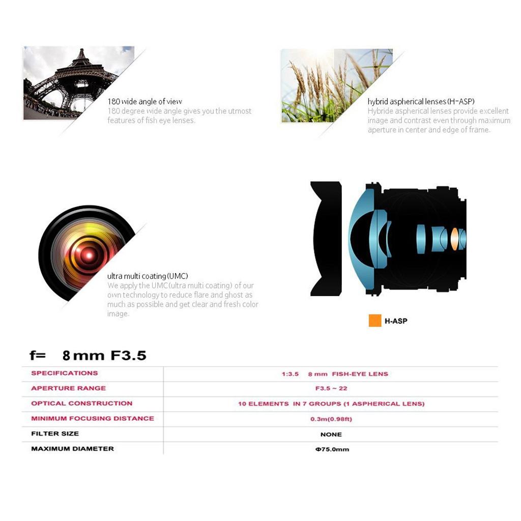 The 8mm Fisheye features an aspherical hybrid lens and the latest anti-reflective multi-coating (MC) to minimize flare and ghosting