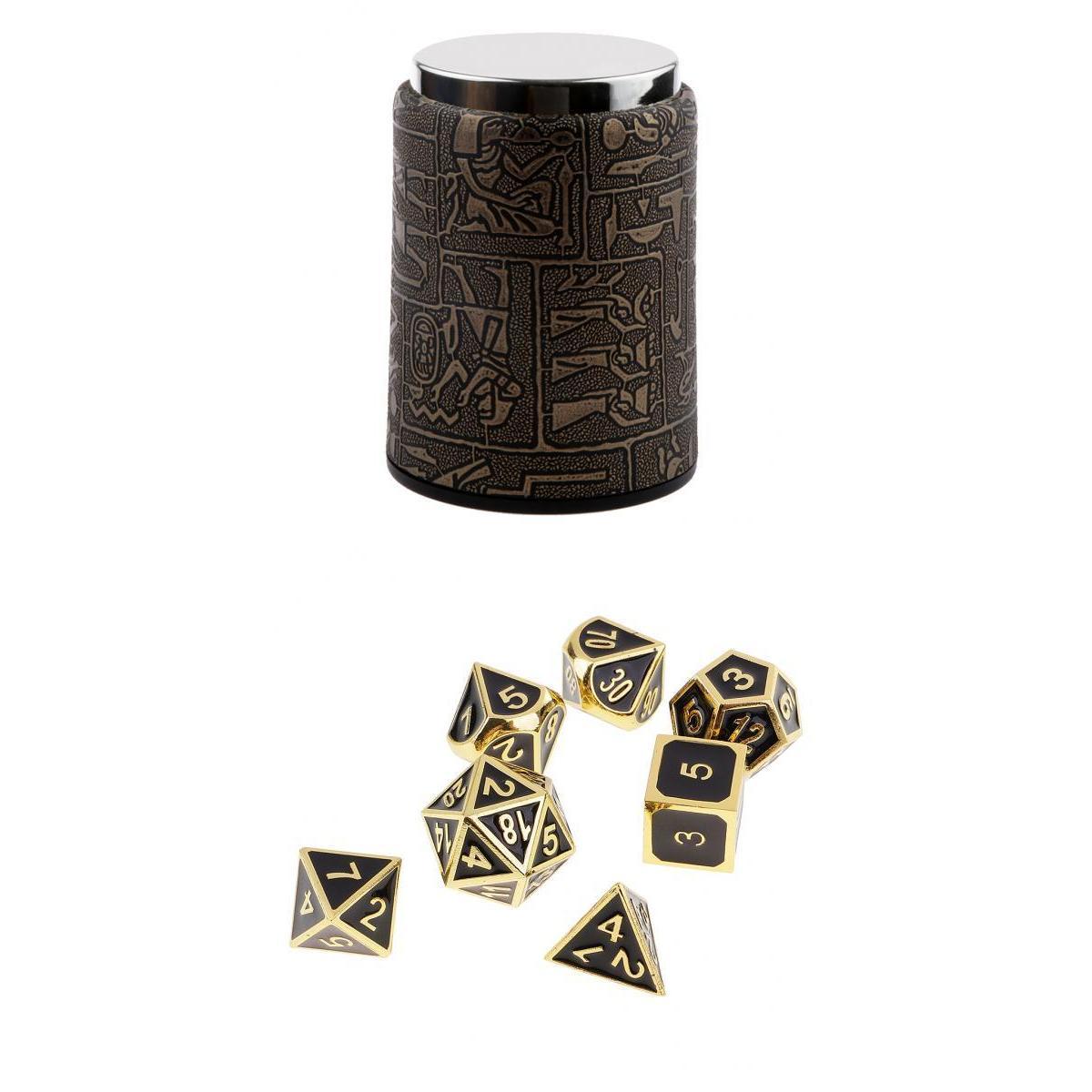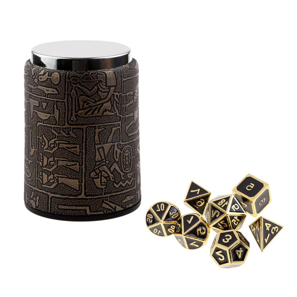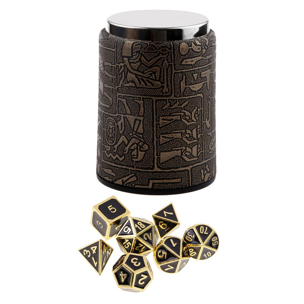 The 7PCS Dice set contains one D20, one D12, two D10 (00-90 and 0-9), one D8, one D6, and one D4 with dice cup