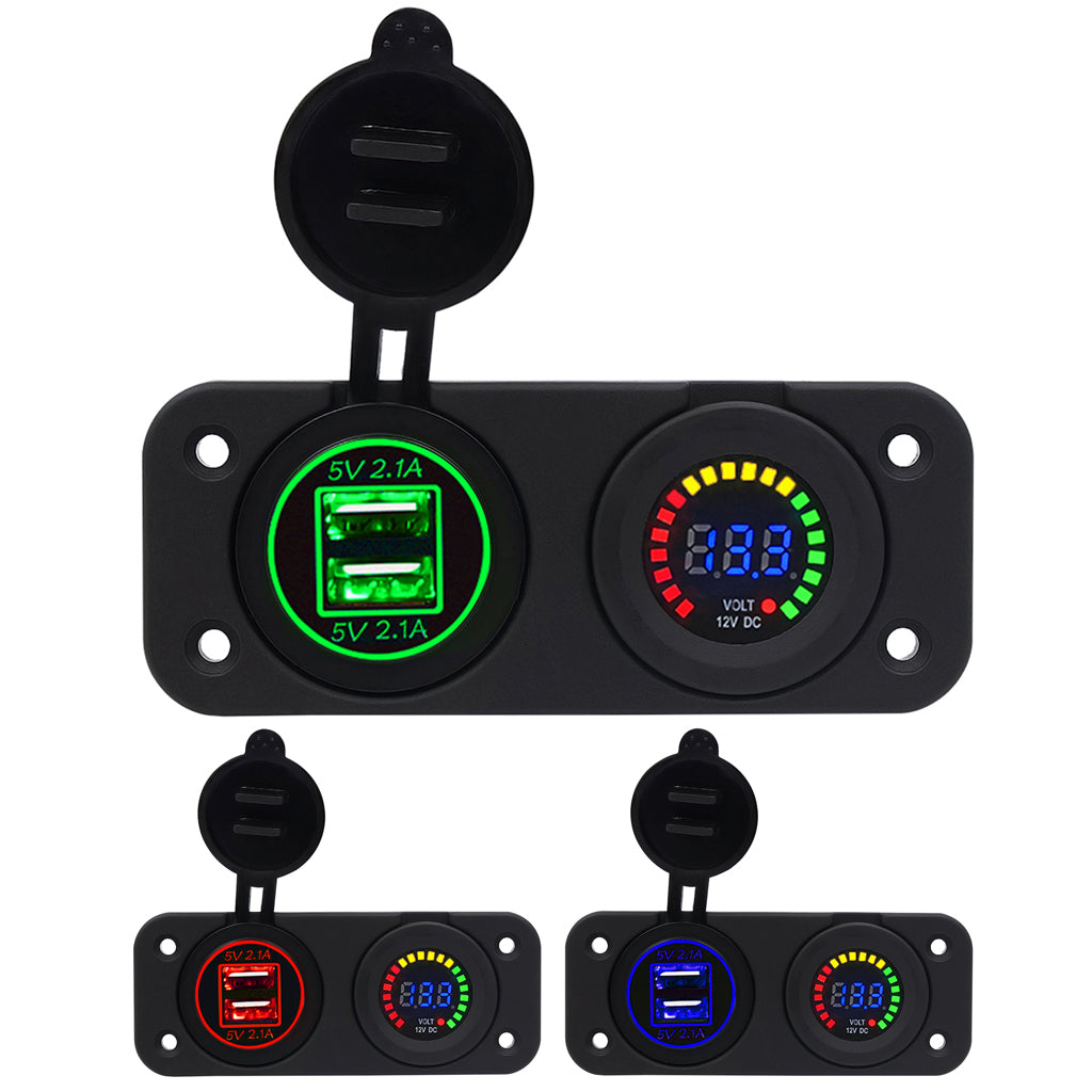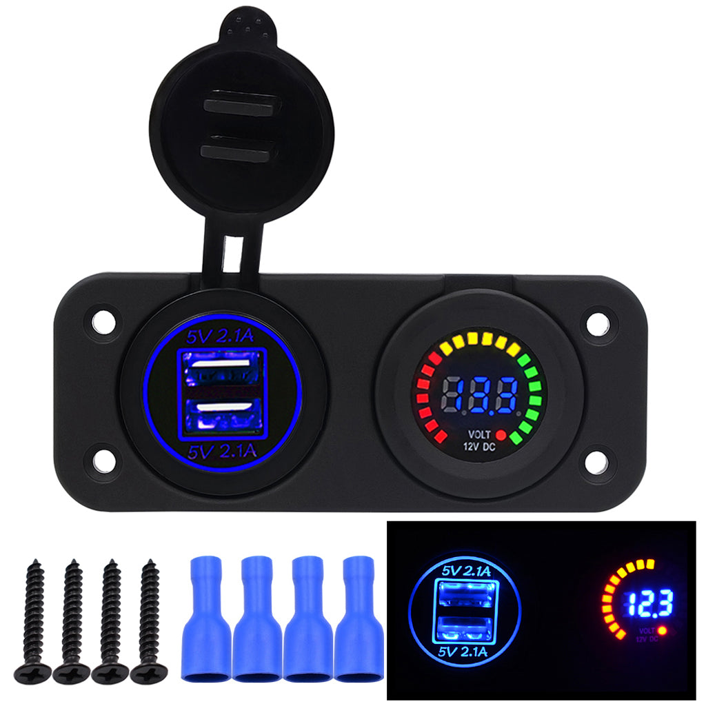 Blue Dual USB Charger Port + Digital Voltmeter Panel for Car Boat ATV