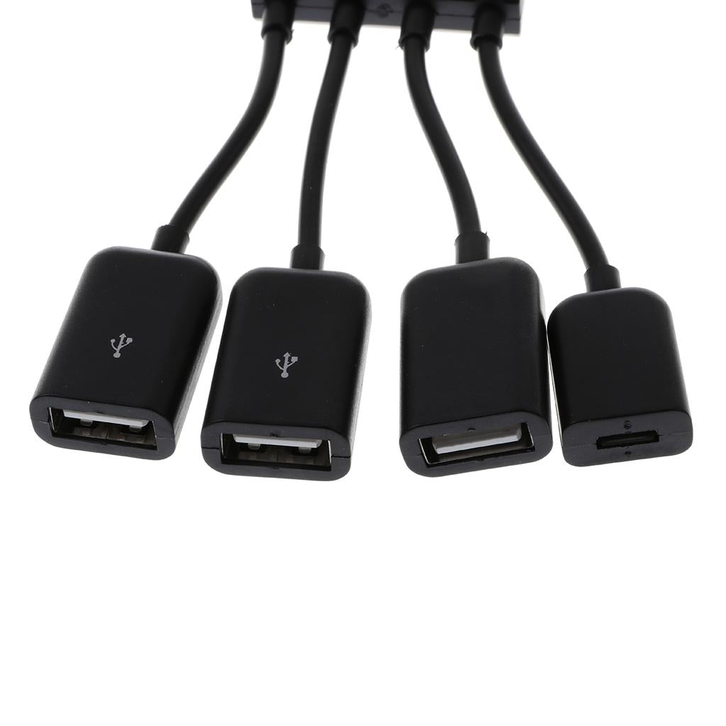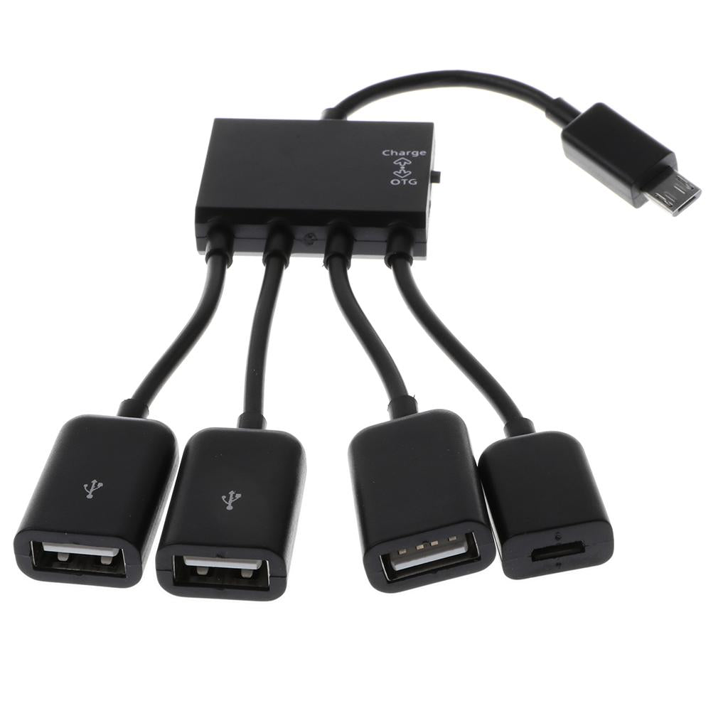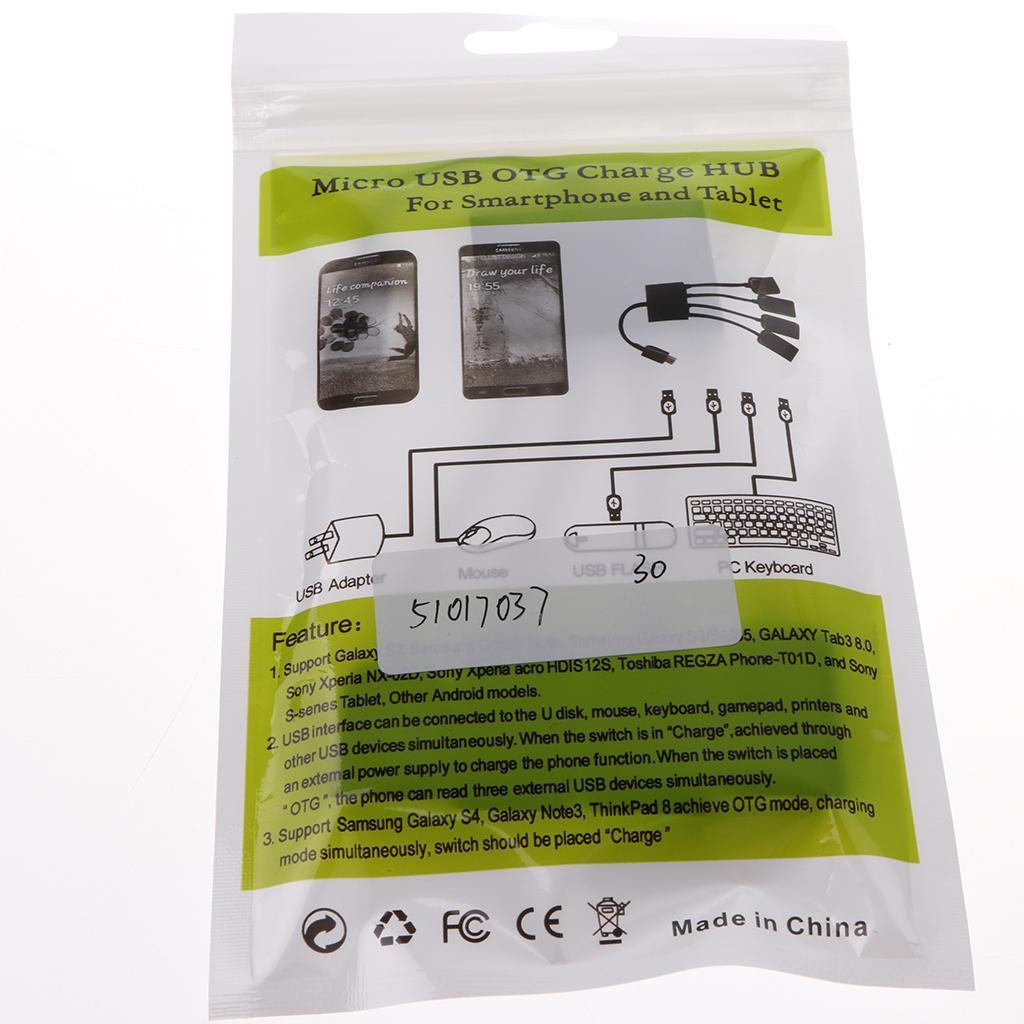 1x Micro USB Male to 1x Micro USB female for charging and 3x USB 2.0 Female for external device.