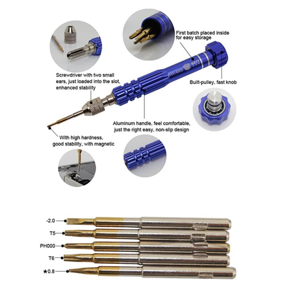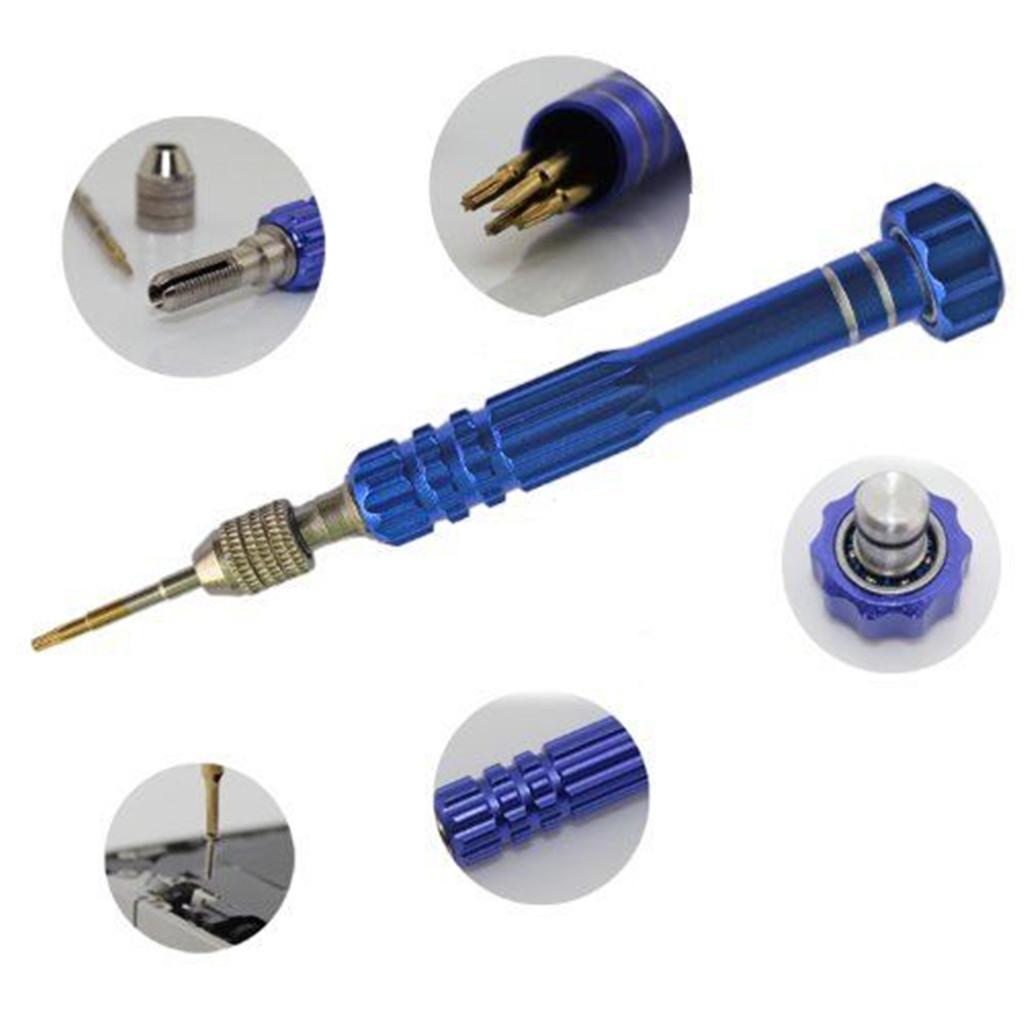 5 In 1 Repair Screwdriver: 5 Point Pentalobe 0.8mm, Flated/Slotted 2.0mm, Flated/Slotted 2.0mm, For Phillips PH000, Torx T5, Torx T6.
