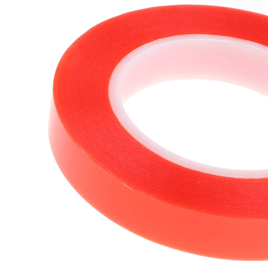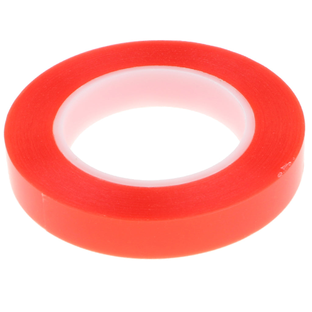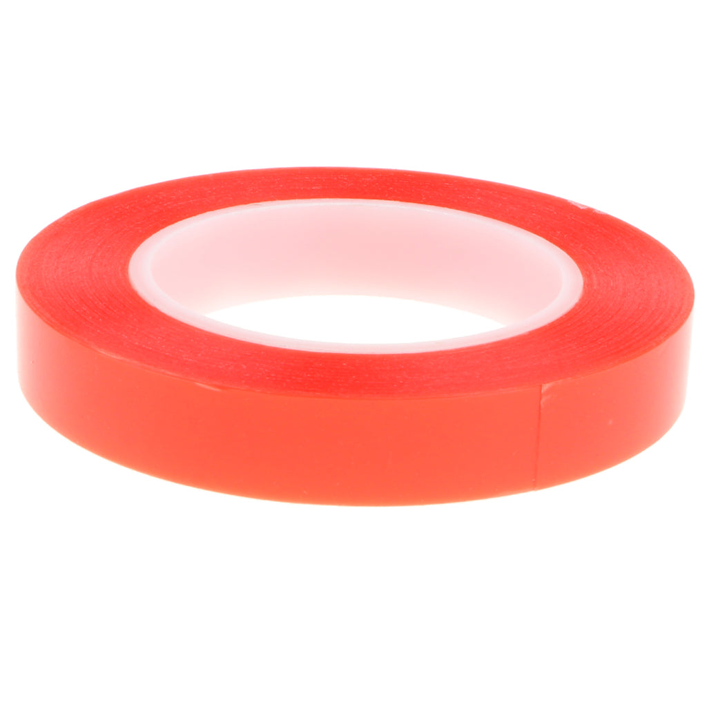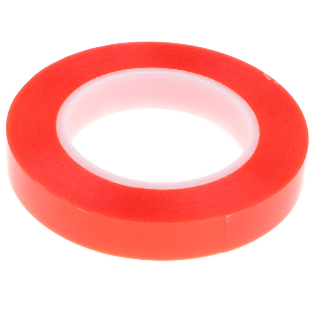 Double sided red adhesive tape with a transparent polyester film and strong acrylic adhesive, housed within a red polypropylene release liner.