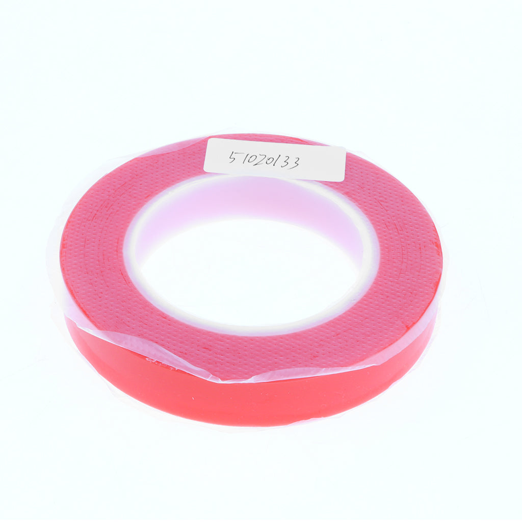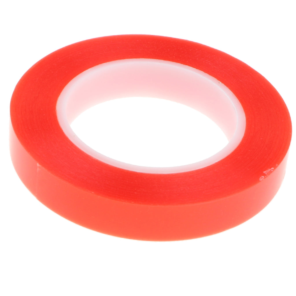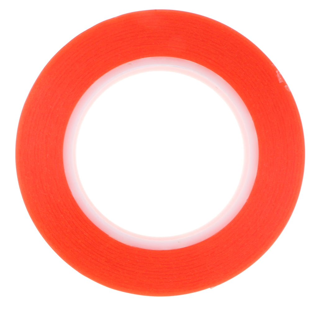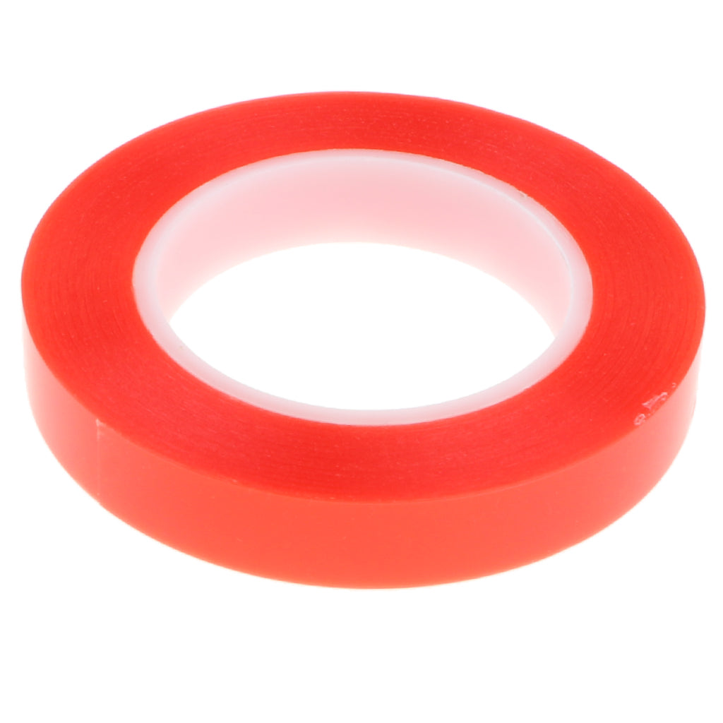 Double sided red adhesive tape with a transparent polyester film and strong acrylic adhesive, housed within a red polypropylene release liner.