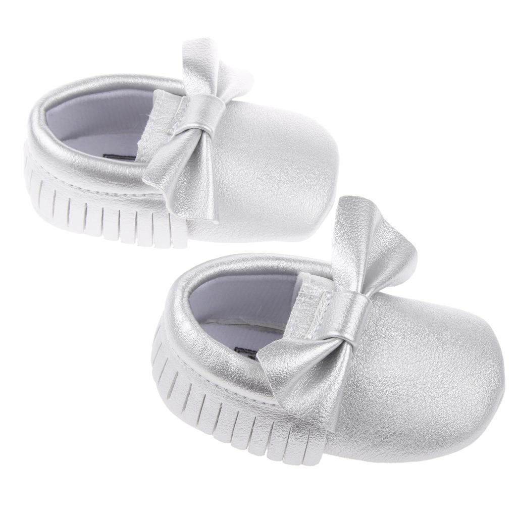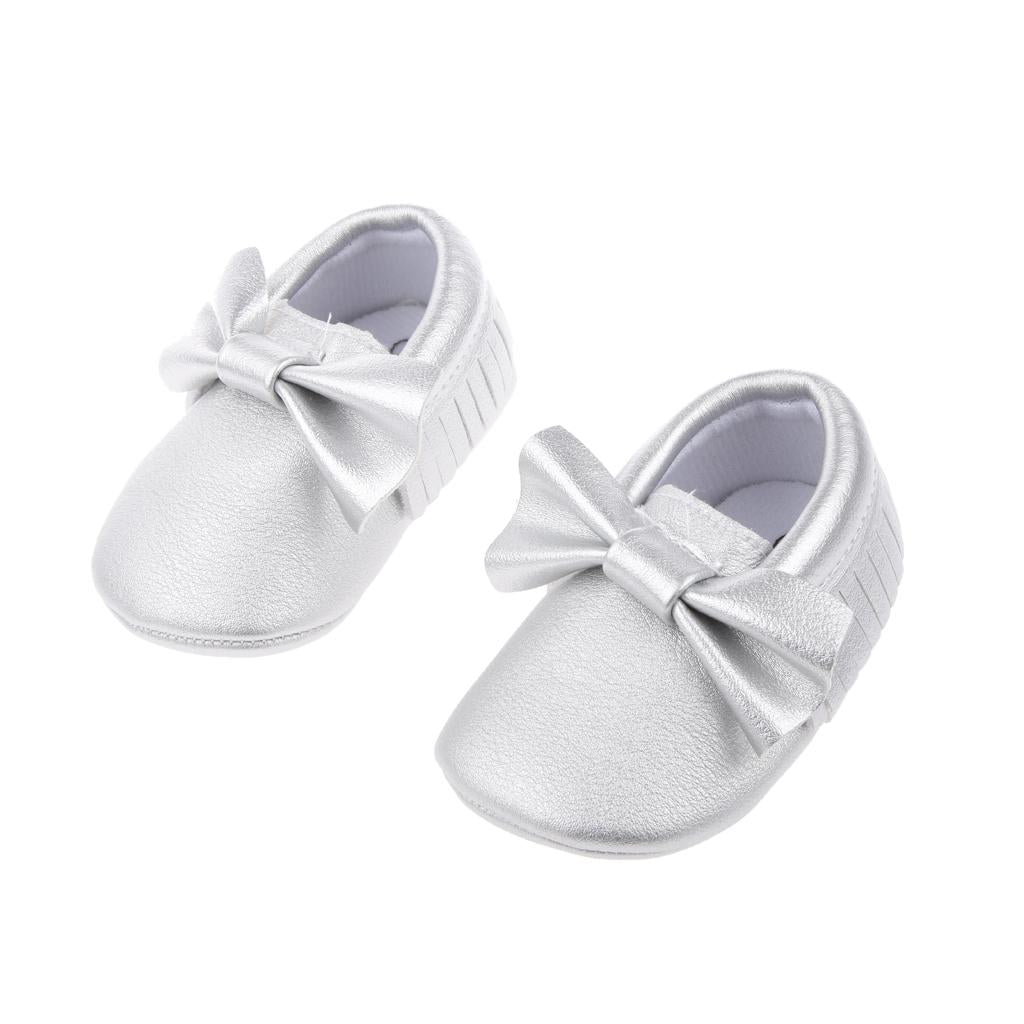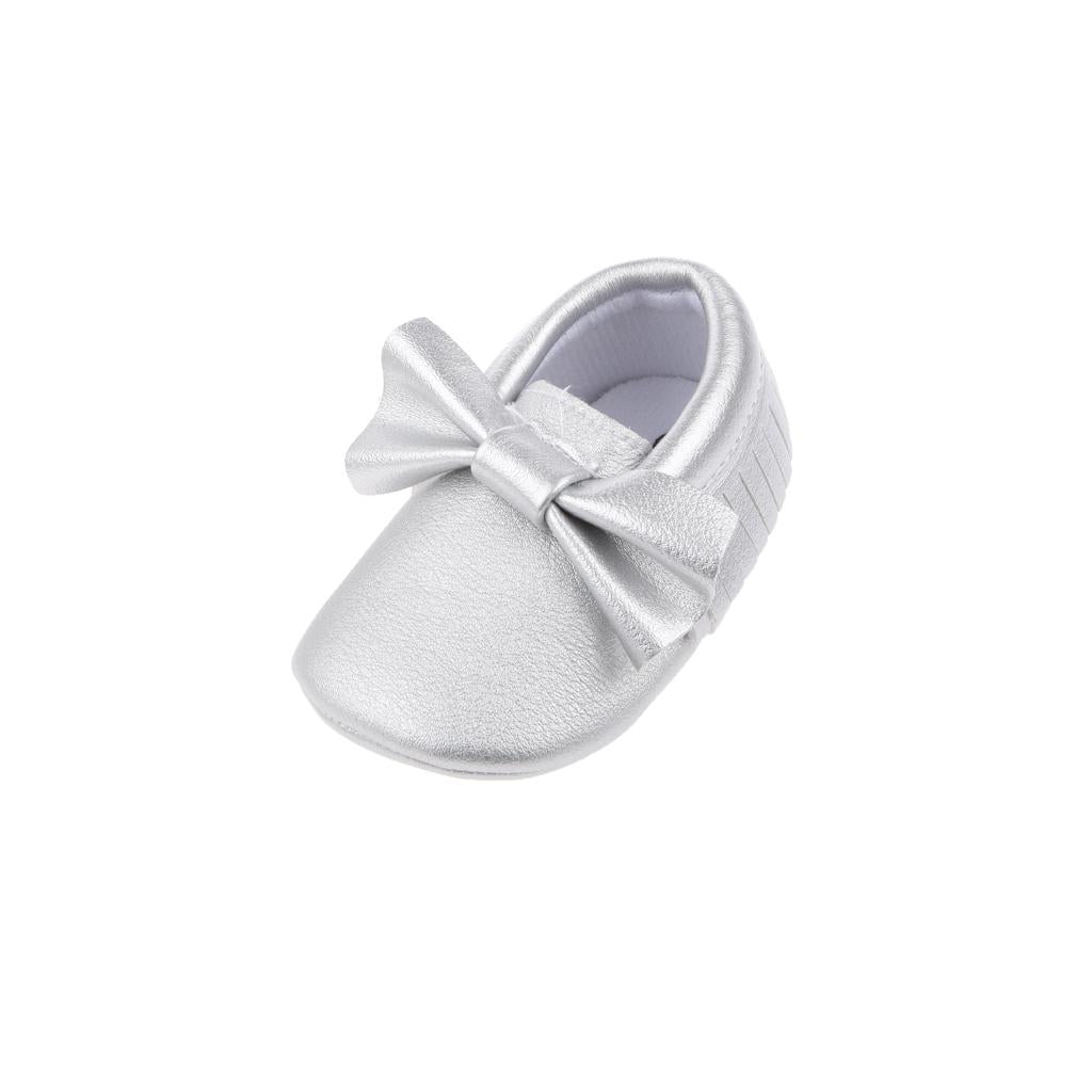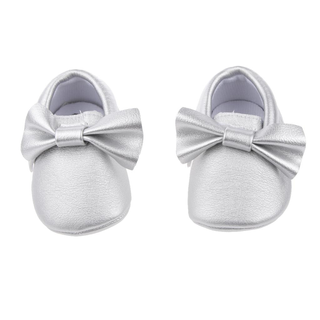 Baby Kids Bowknot Soft Sole Moccasin Toddler Leather Crib Shoes 11cm Silver