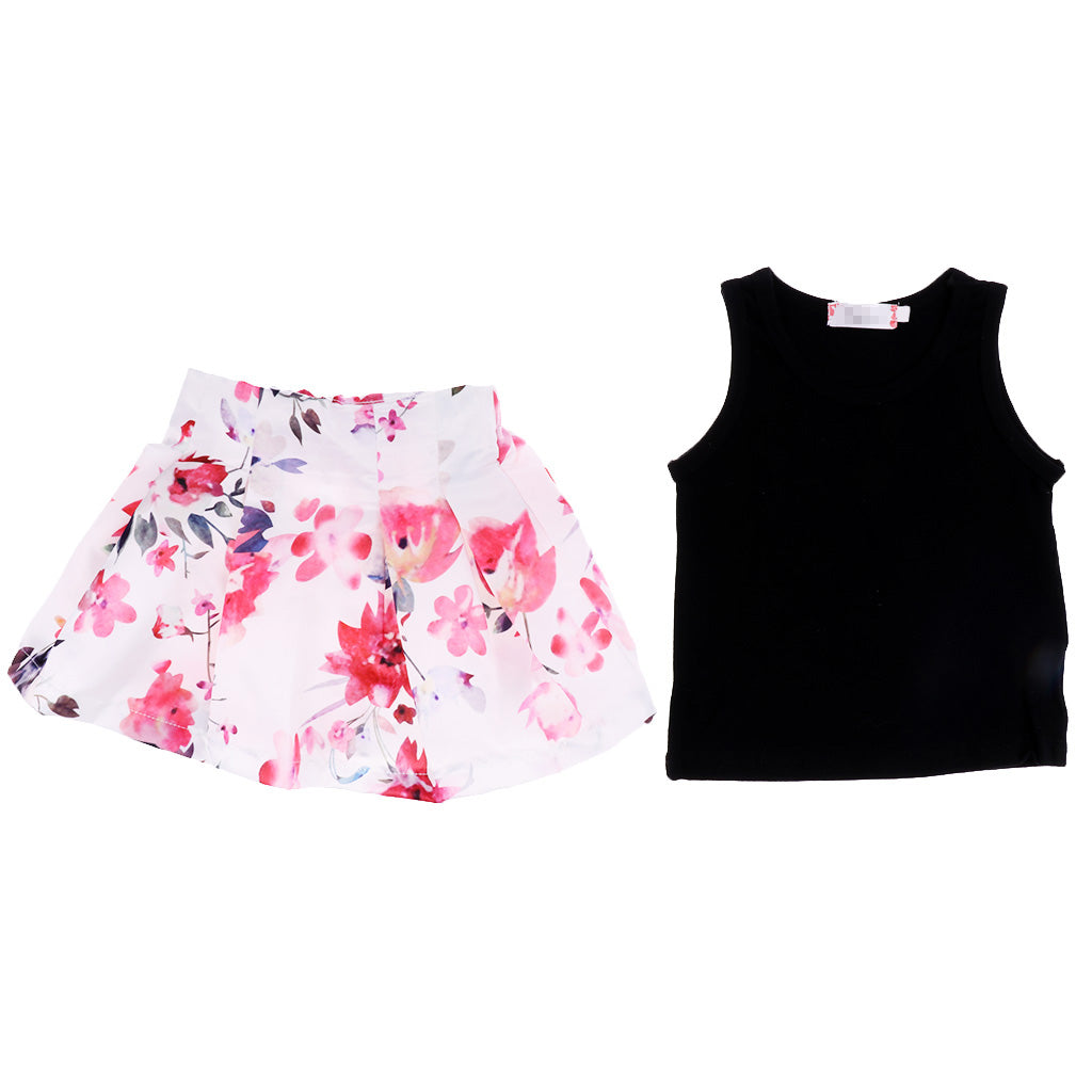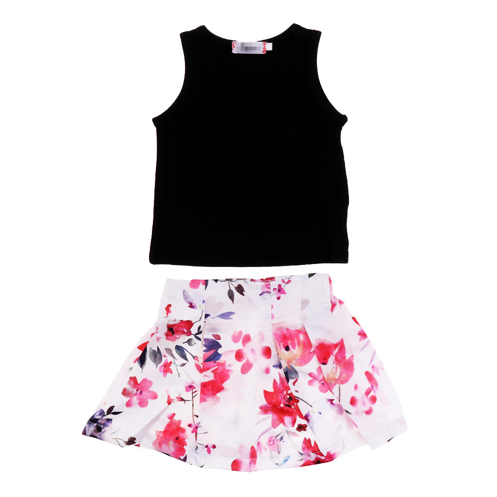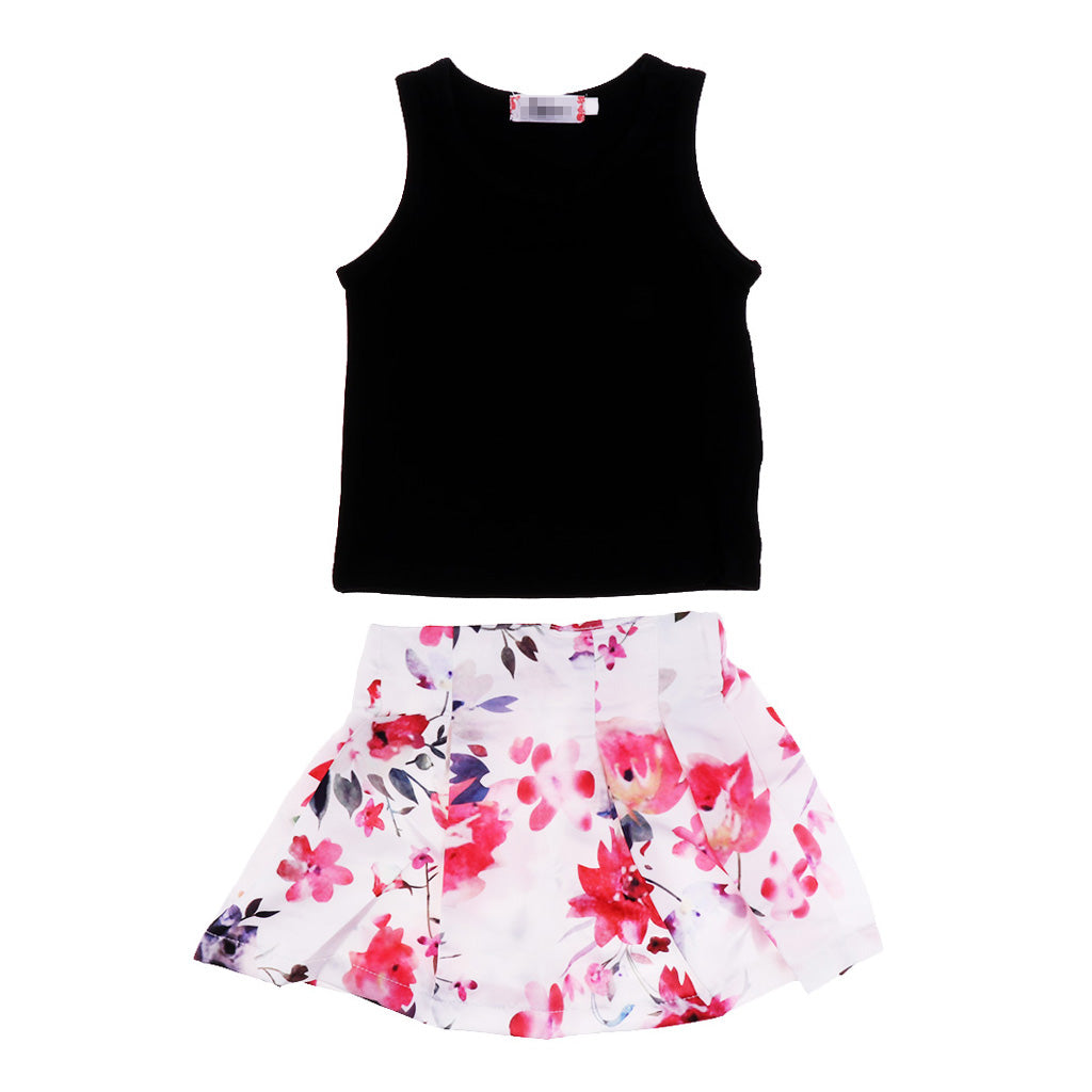 Baby girls floral skirts set, comfortable black cotton tank tee tops, flowers print skirt