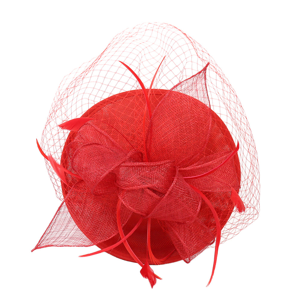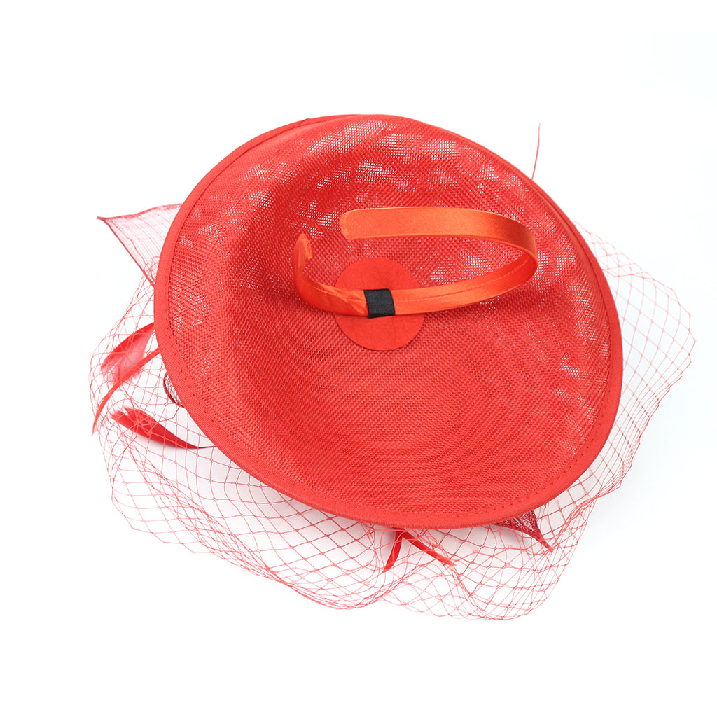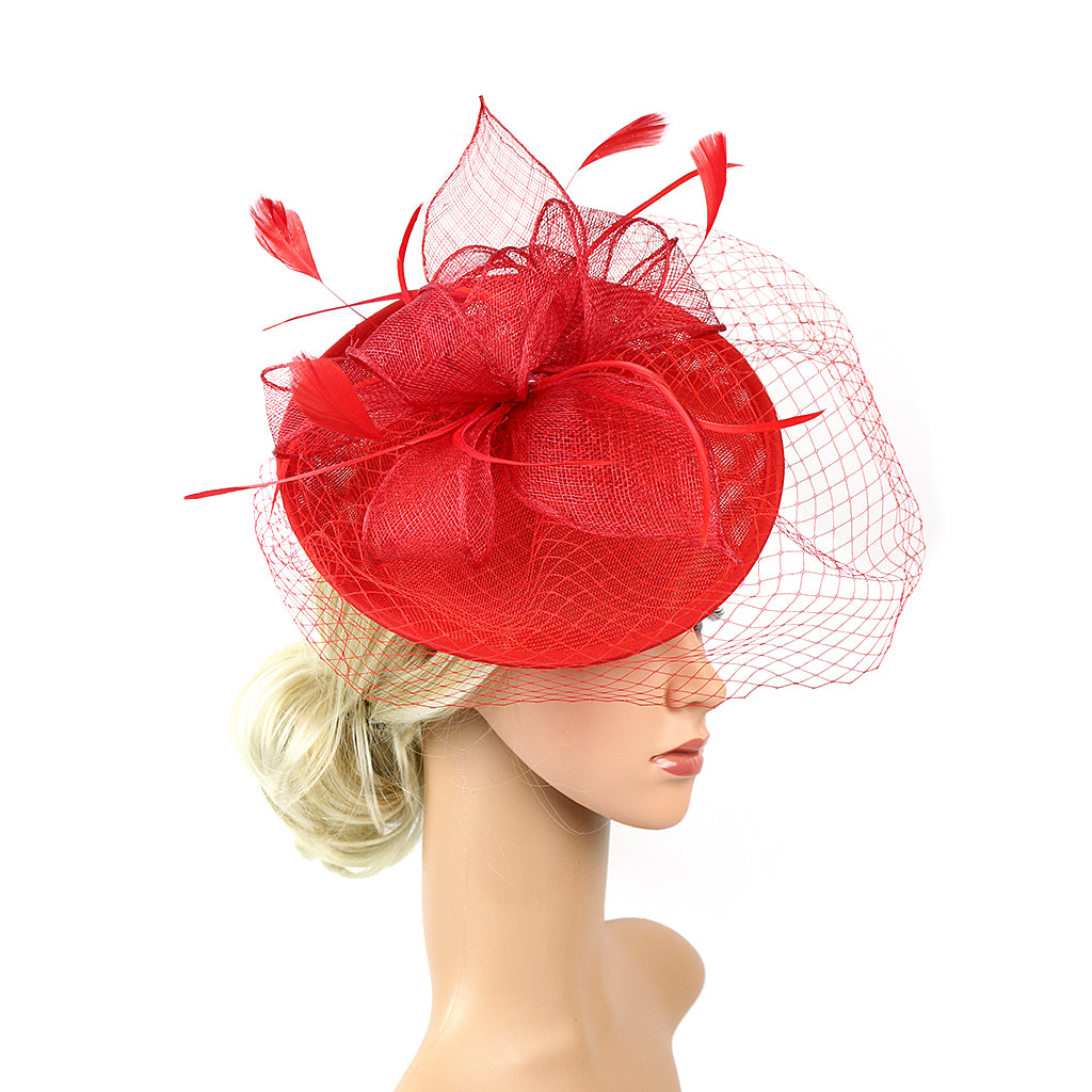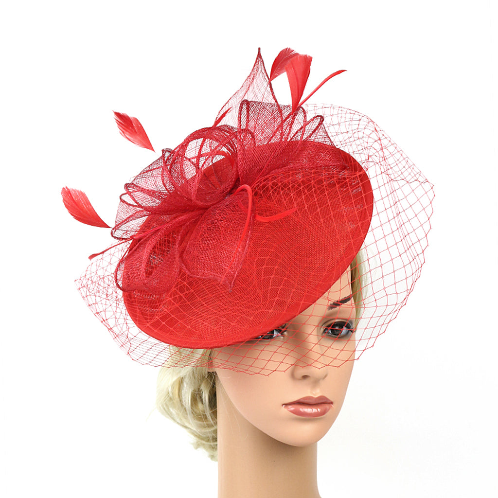 Sinamay Hat Feather Headband Fascinator Veil Wedding Royal Ascot Red