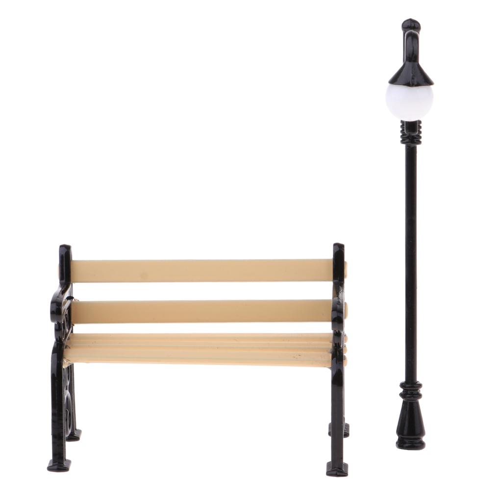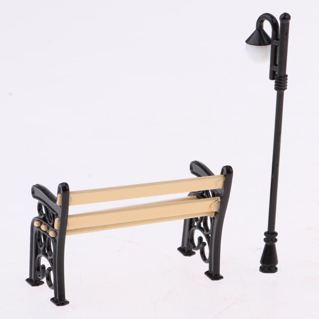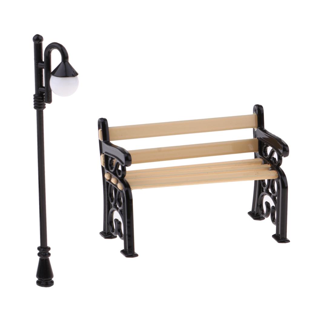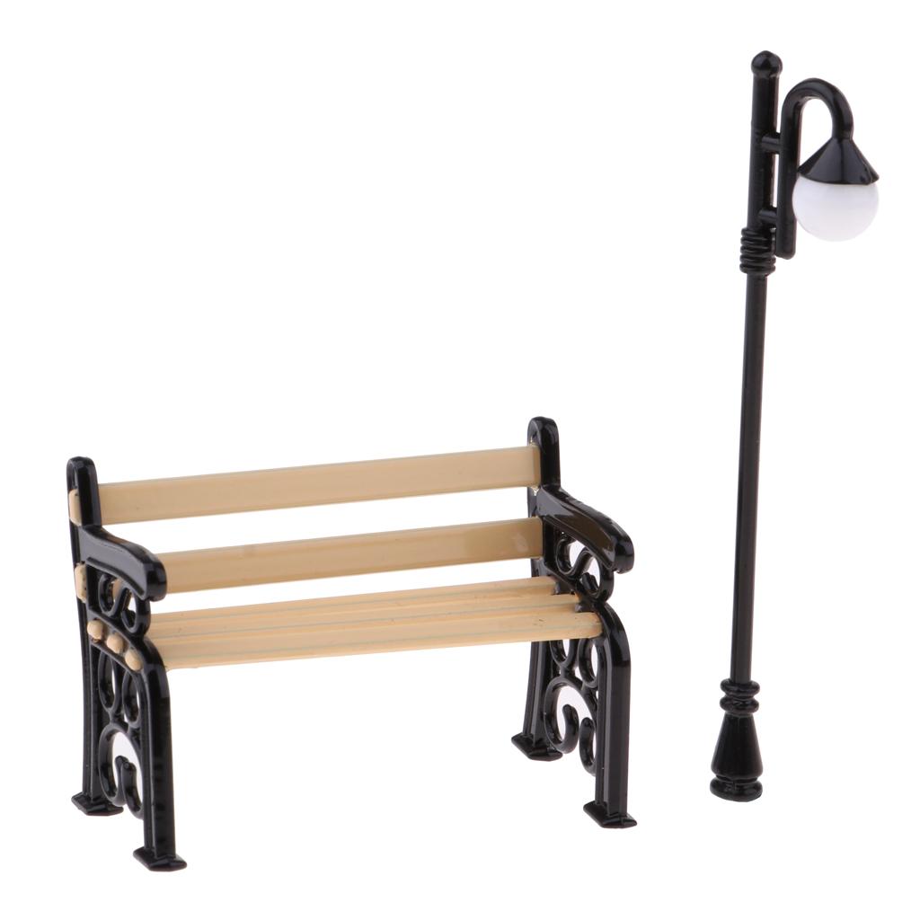 2 pieces dollhouse furniture lifelike mini outdoor garden ornament metal park bench and street lamp craft accessories