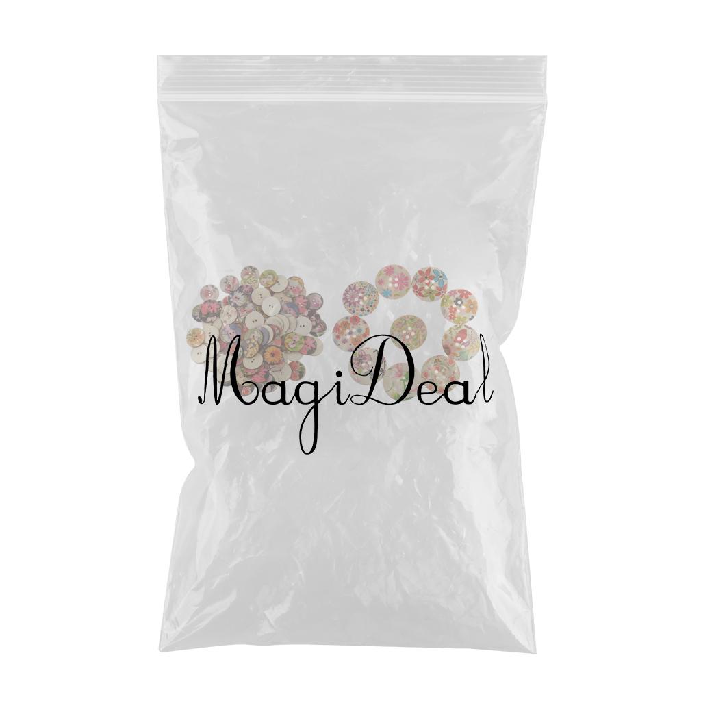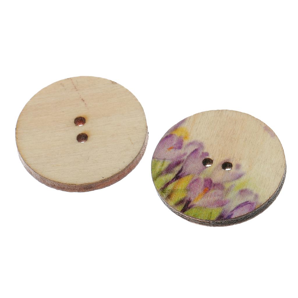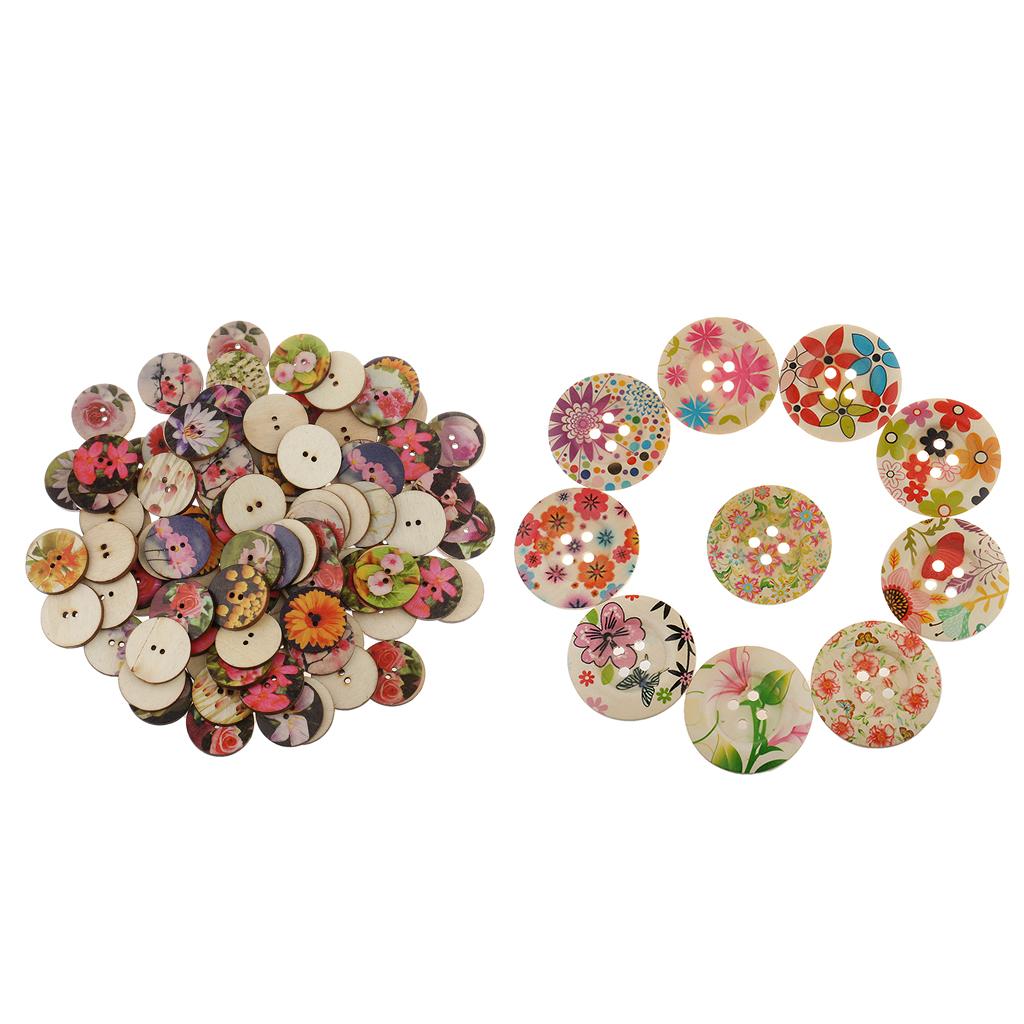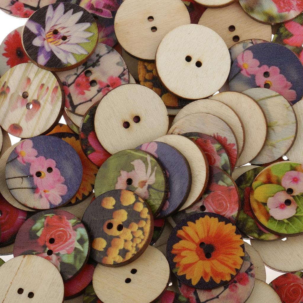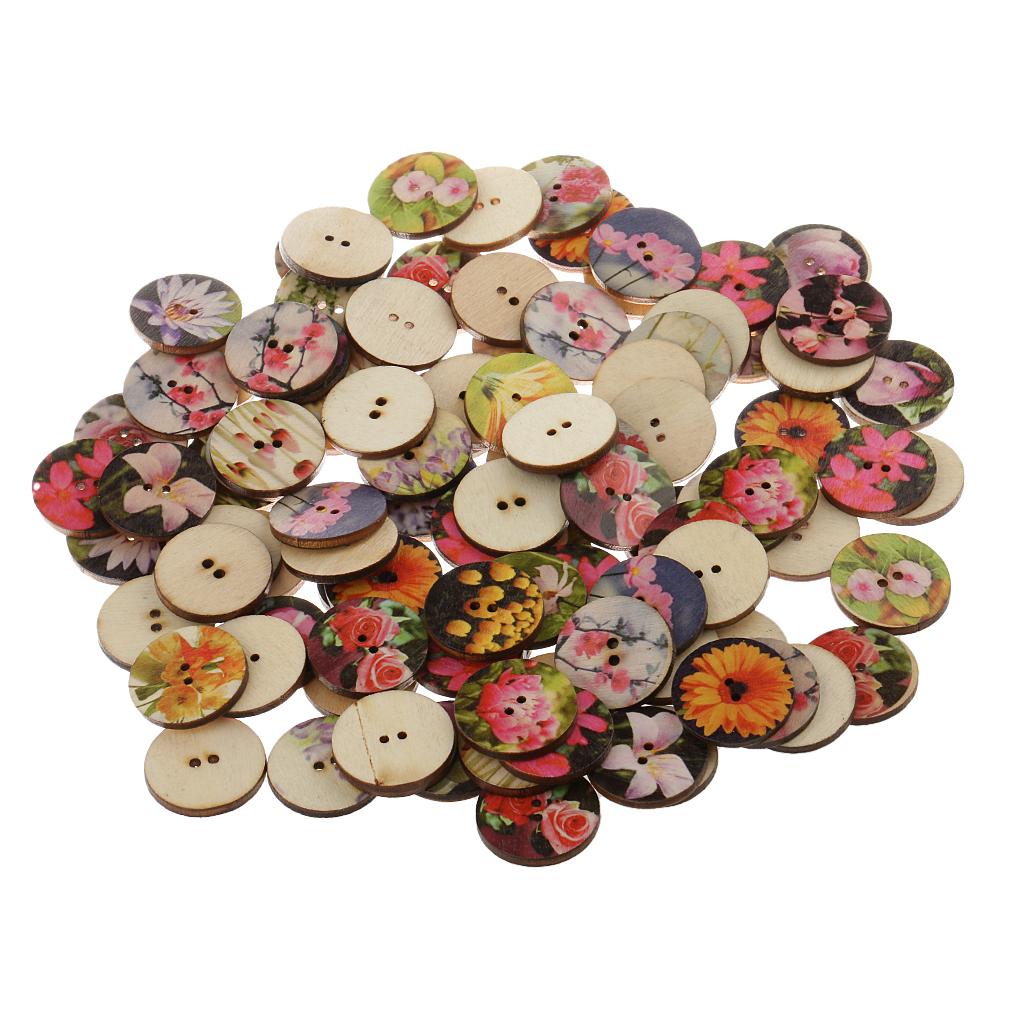 100Pieces Mixed Floral Wooden Round 2 Holes Buttons for Sewing Crafts 25mm