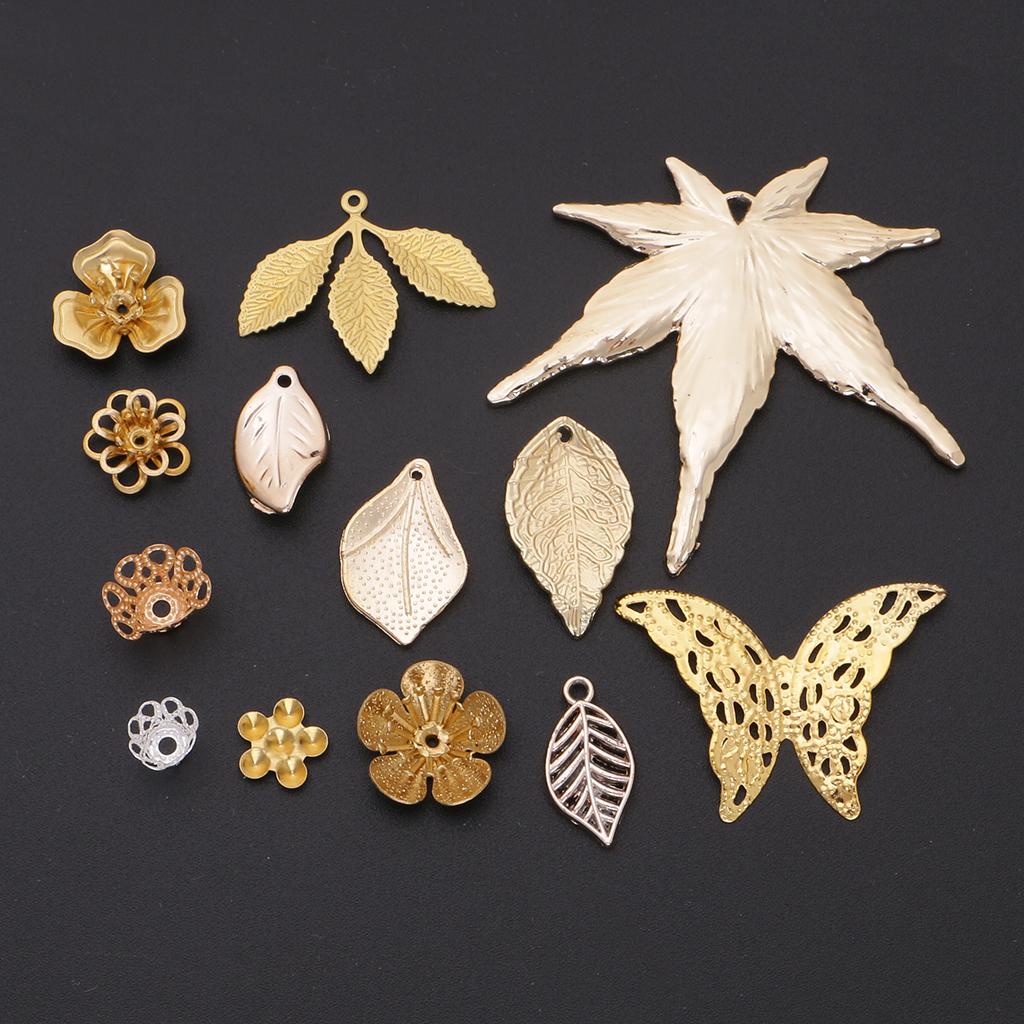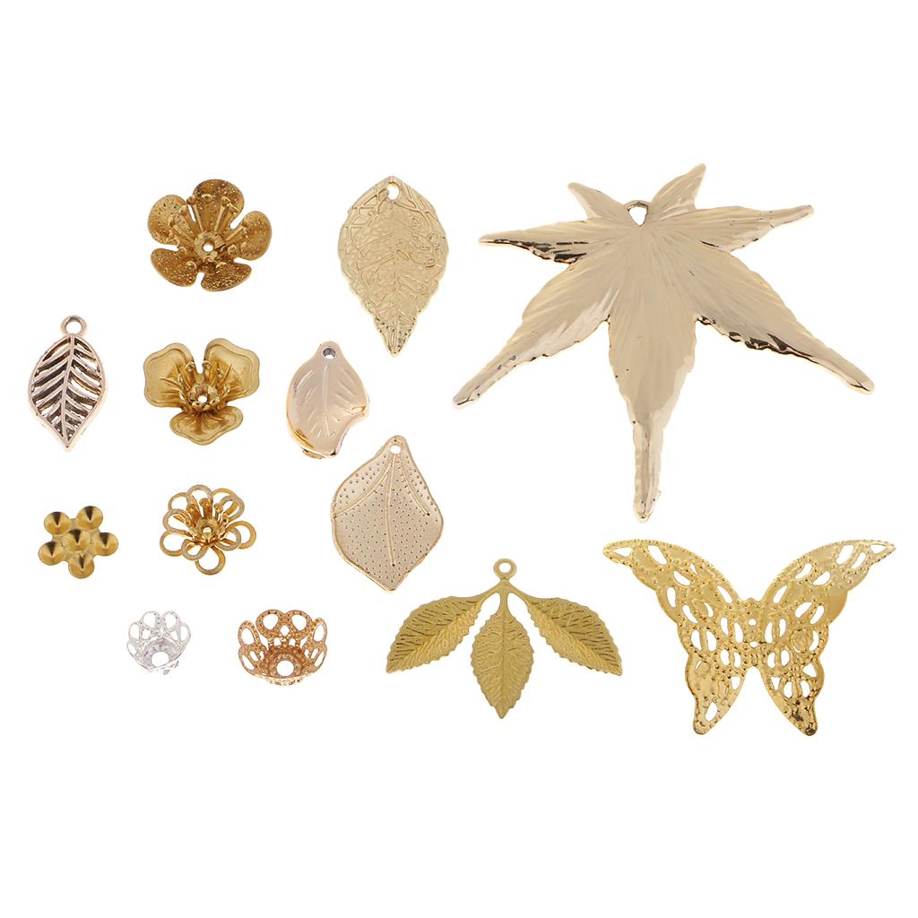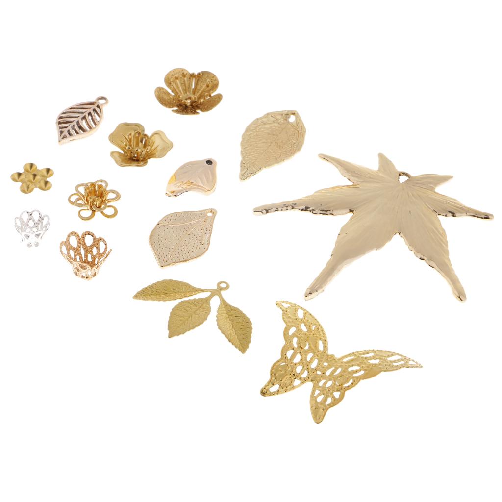 13 Pieces Assorted Metal Filigree Leaf Butterfly Flower Beads Caps Charms Pendants Wedding Bridal Hair Jewelry Making Findings Gold