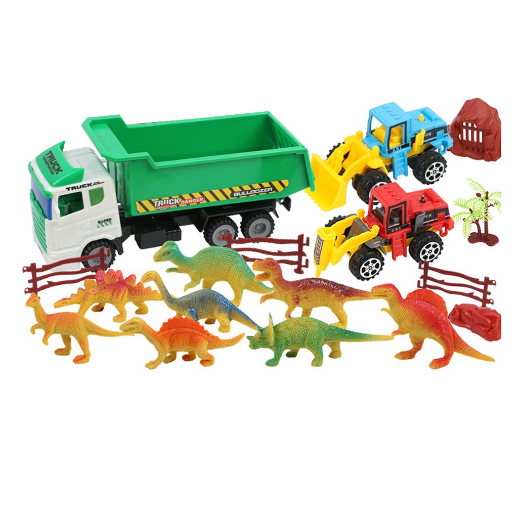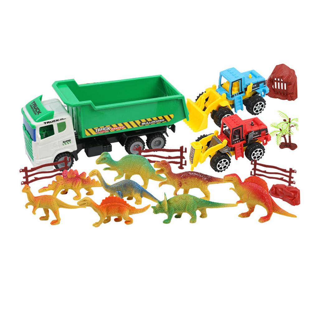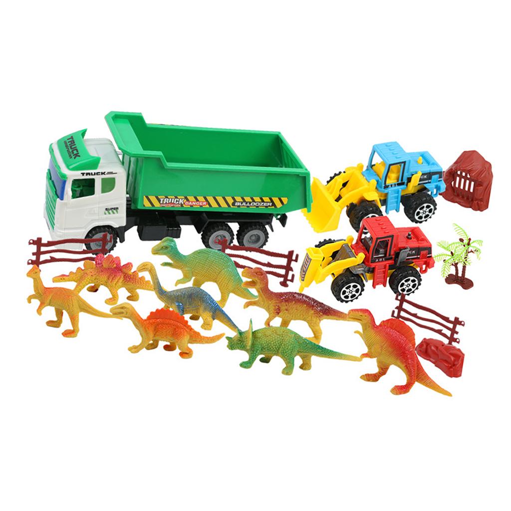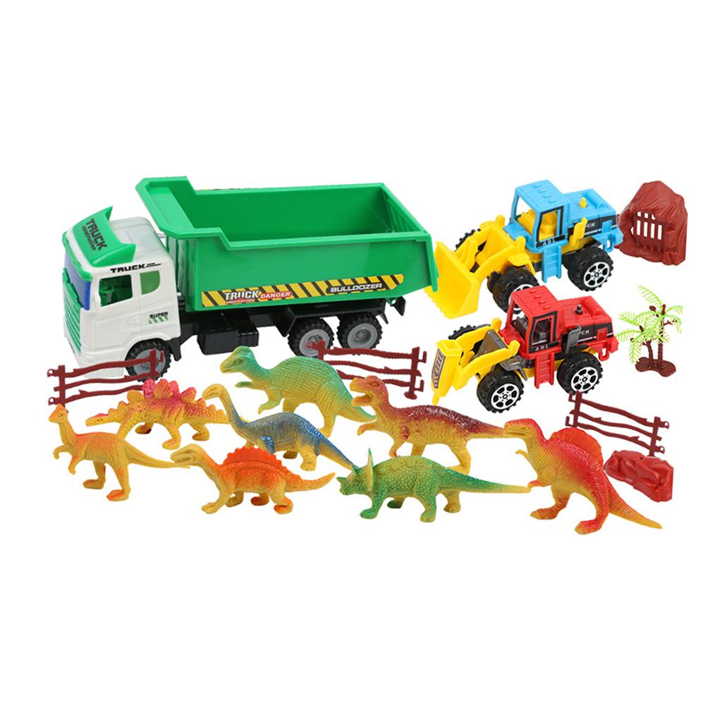17 Pieces Dinosaur Model Scene Playset, including 8 dinosaurs, 3 construction trucks, 3 fences, 1 tree and 2 rocks.