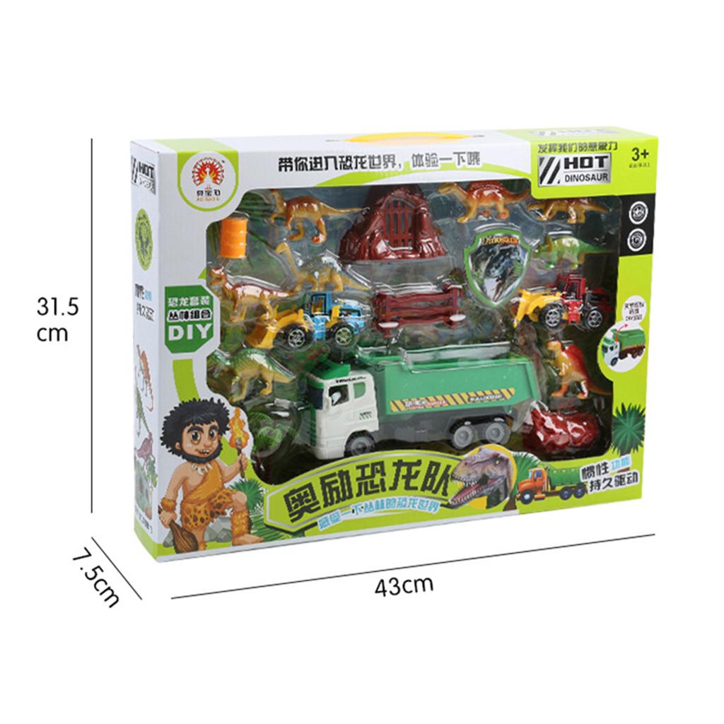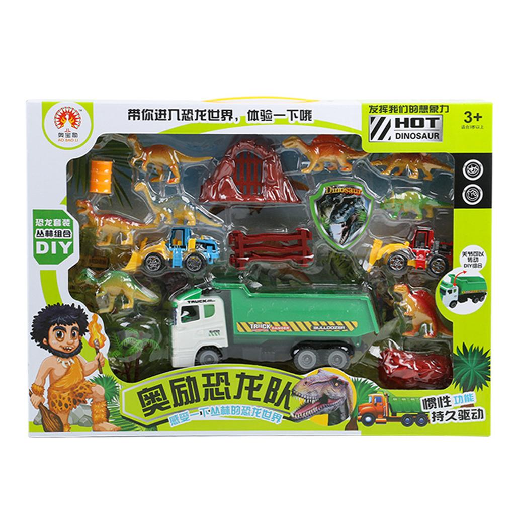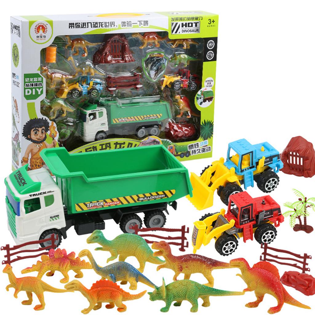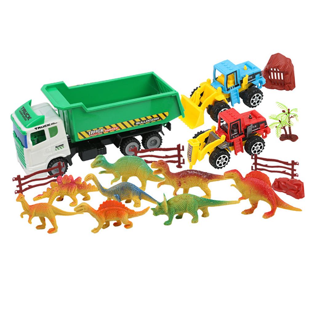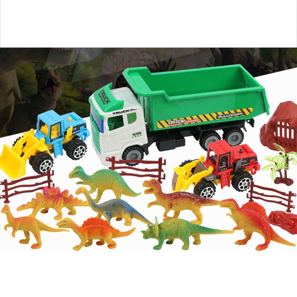 17 Pieces Jurassic Jungle Dinosaur Model Scene Play Set With 3 Construction Trucks, Kids Preschool Educational Toy