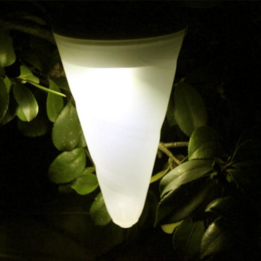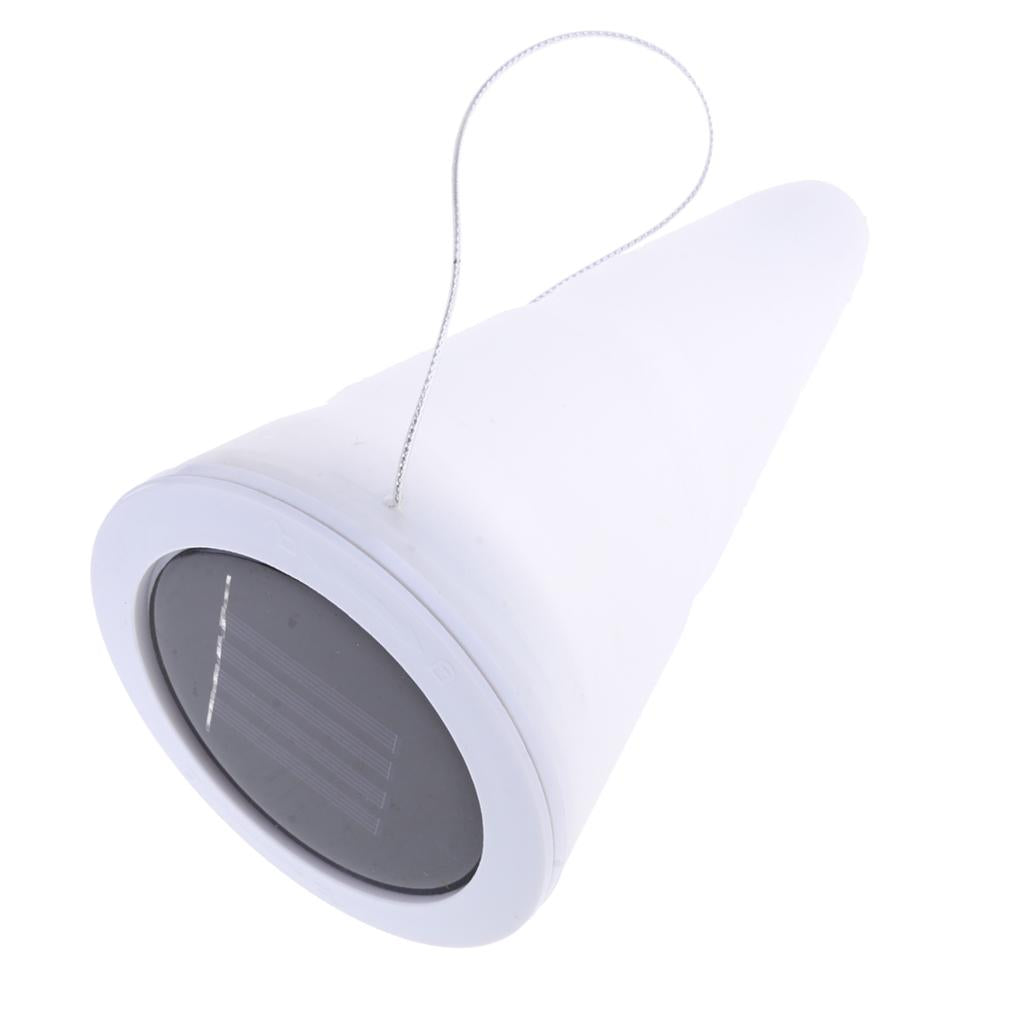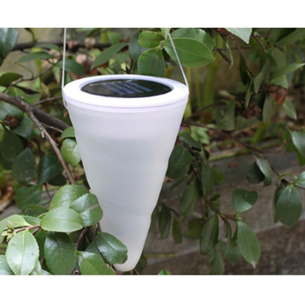 Unique hanging solar garden Lamp with opaque cone lens, designed to hang from tree limbs and branches.