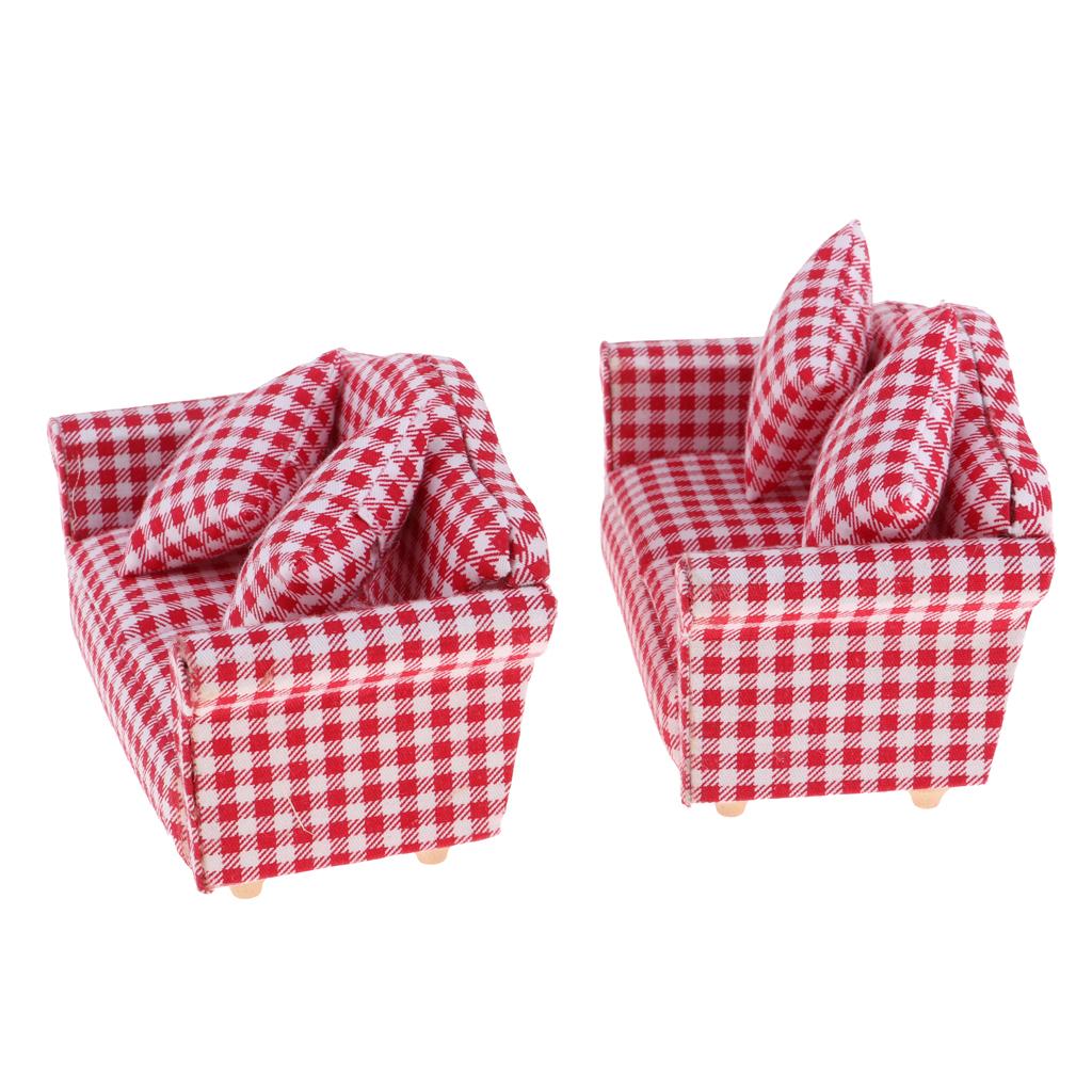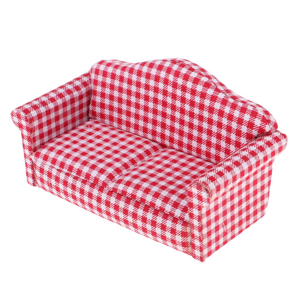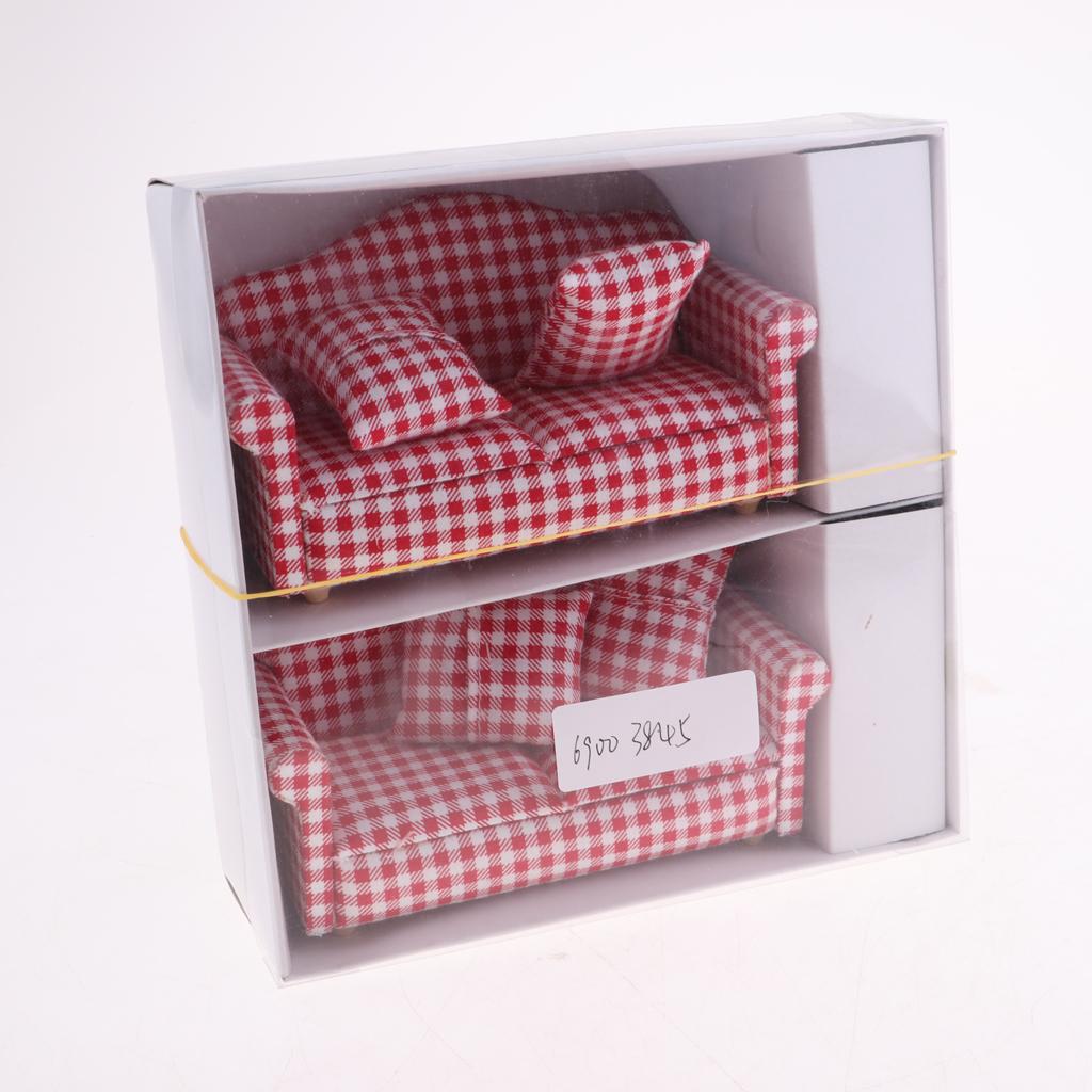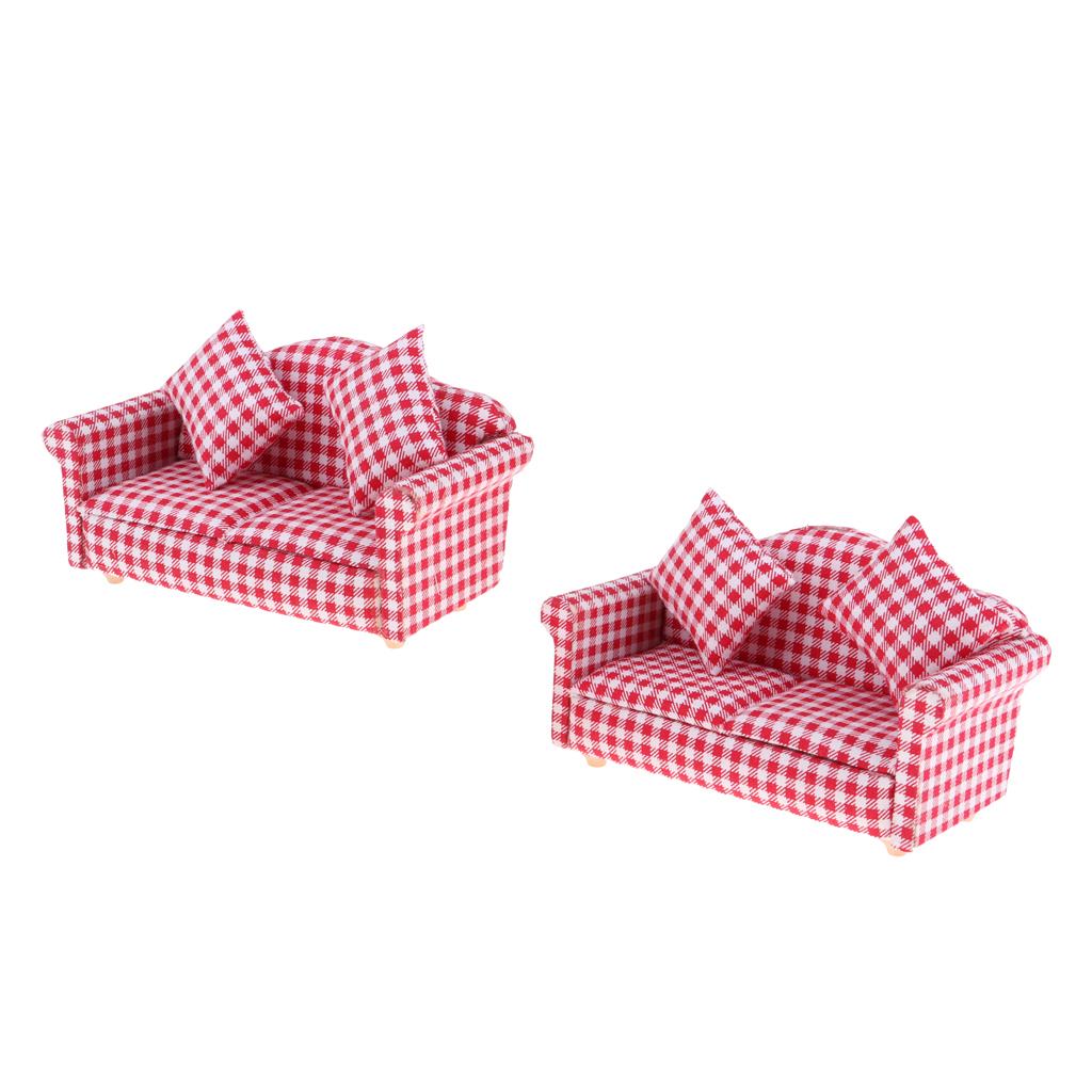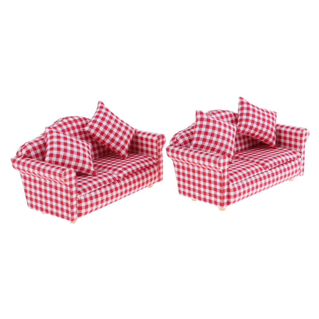 1/12 Scale Classic Plaid Patterns Double Sofa Cushions Couch Set for Dollhouse Accessories Decor