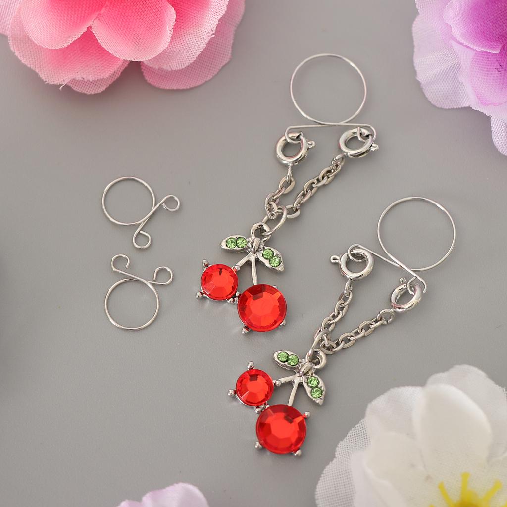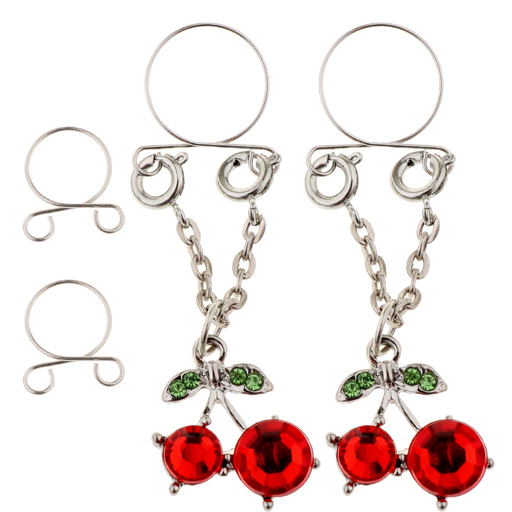 2pcs Cute Fruit Cherry Red Rhinestone Dangle Loop Nipple Ring Non-piercing