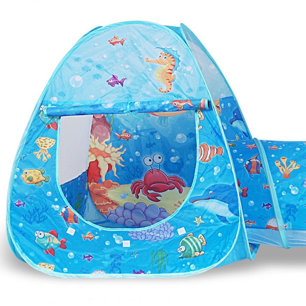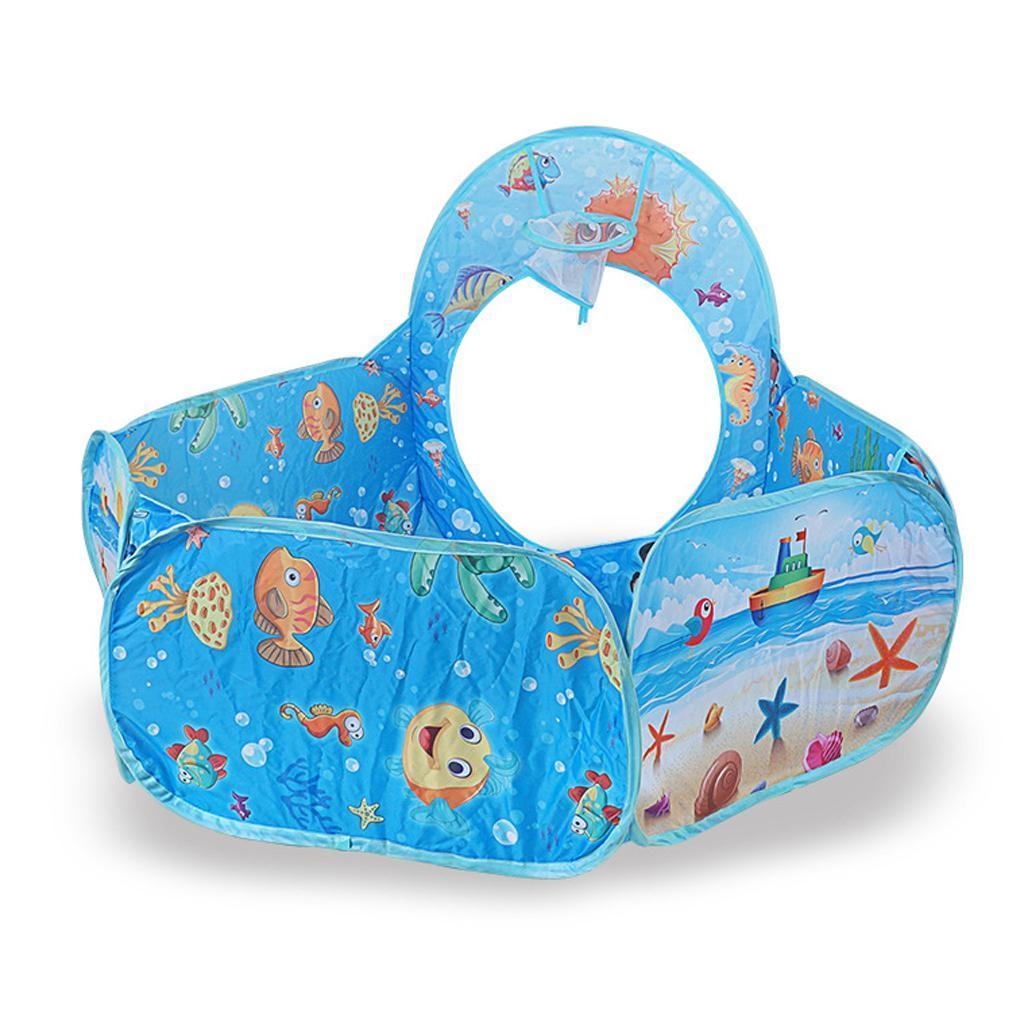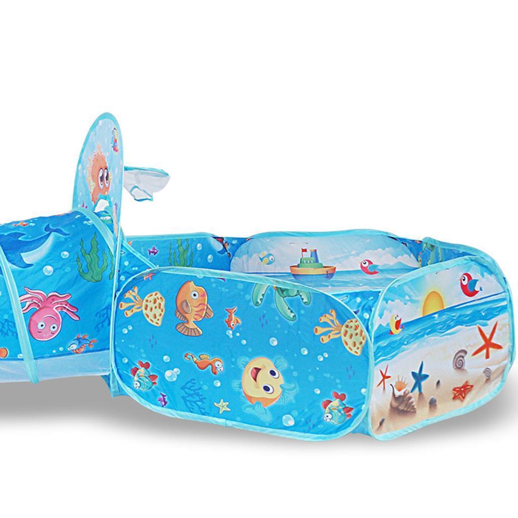 3-in-1 Kids Playhouse with Pop Up Tent, Tunnel, and Basketball Pit for Indoor Outdoor Play - Blue Sea A