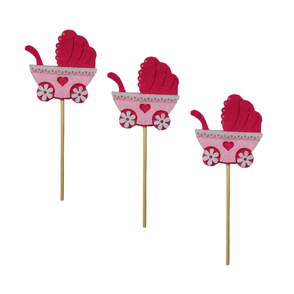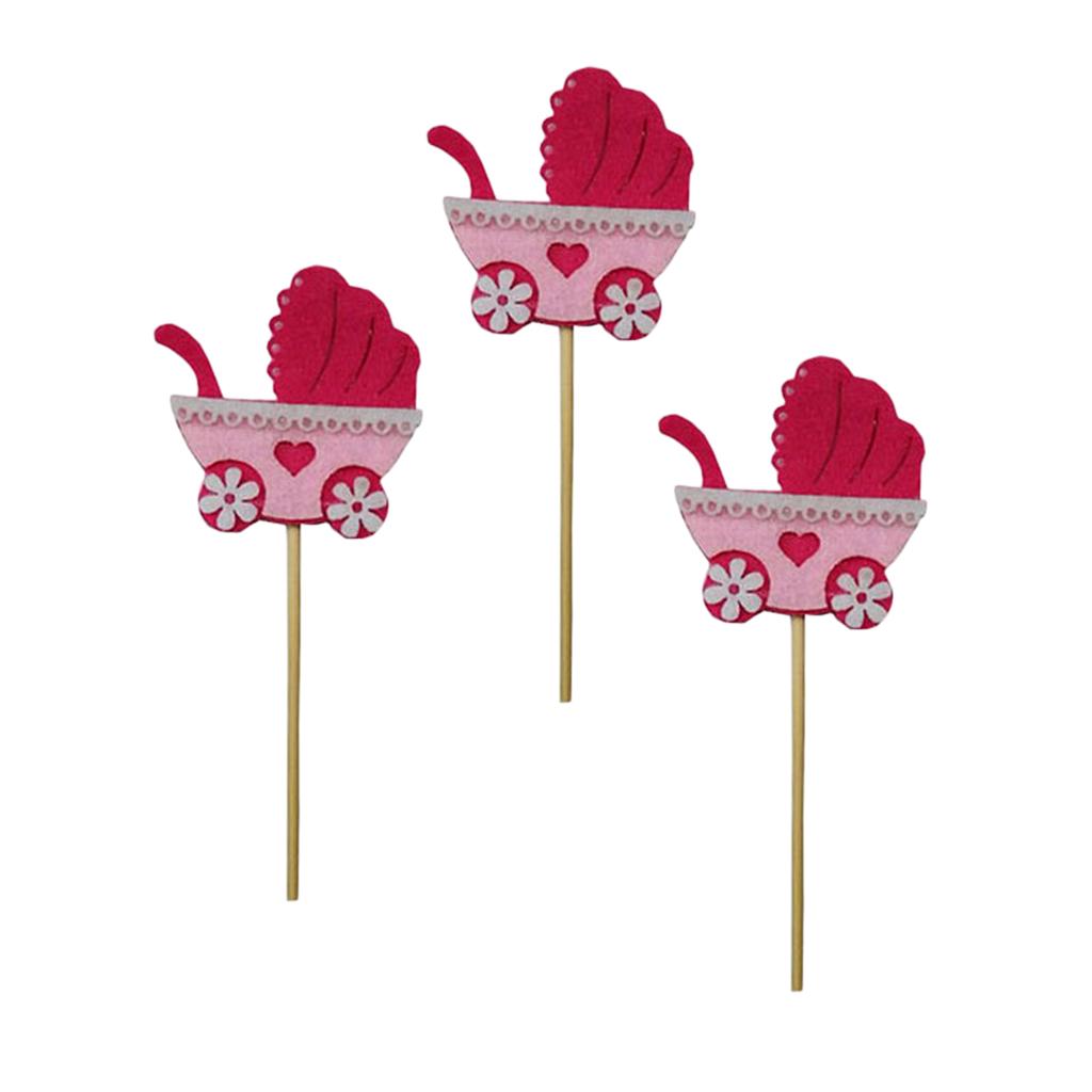 3 Pieces Felt Baby Stroller Shape Cake Toppers Baby Birthday Party Cake Picks Pink