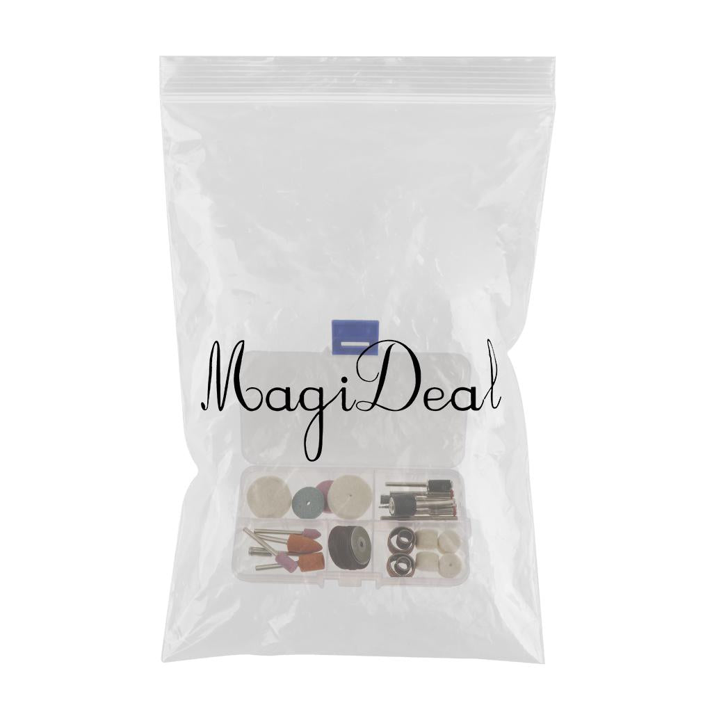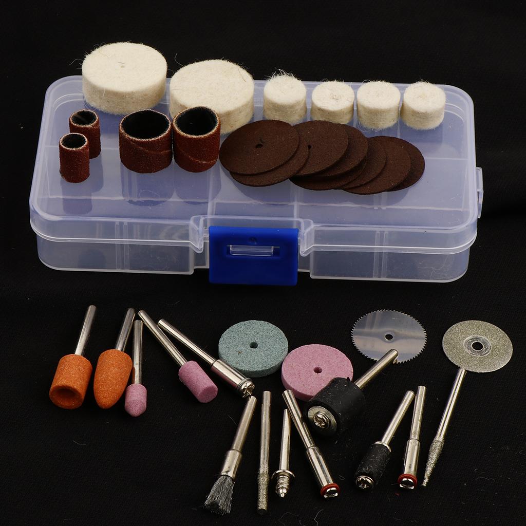 Rotary Tool Accessories Bit Set includes grinding paste, stone, Rod of sand paper round, Emery grinding needles, Cutting disc extension rods, Steel brushes, Grinding wheel heads, Wool polishing wheels, Sand paper rounds, Abrasive disc cutters.