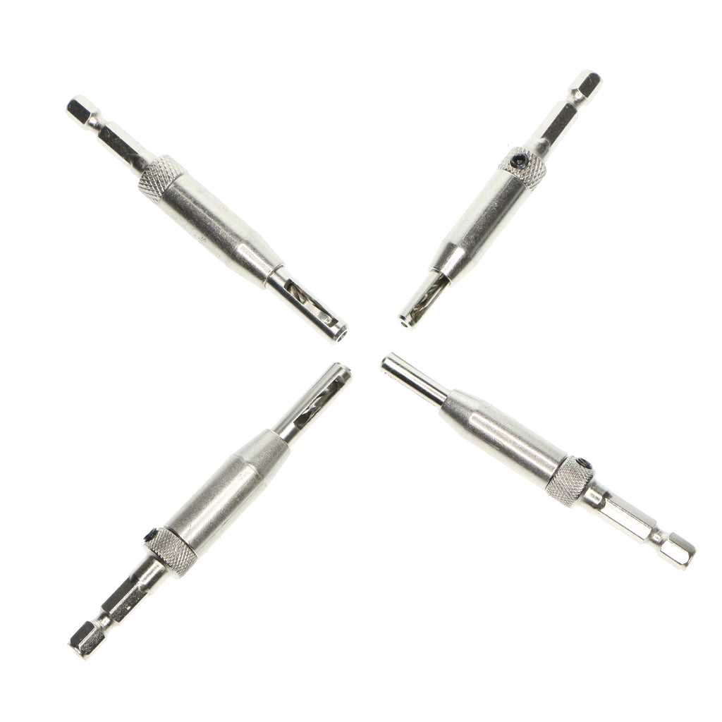 The bits are surrounded by spring loaded guides that have a window to show the drill bit depth while making adjustments