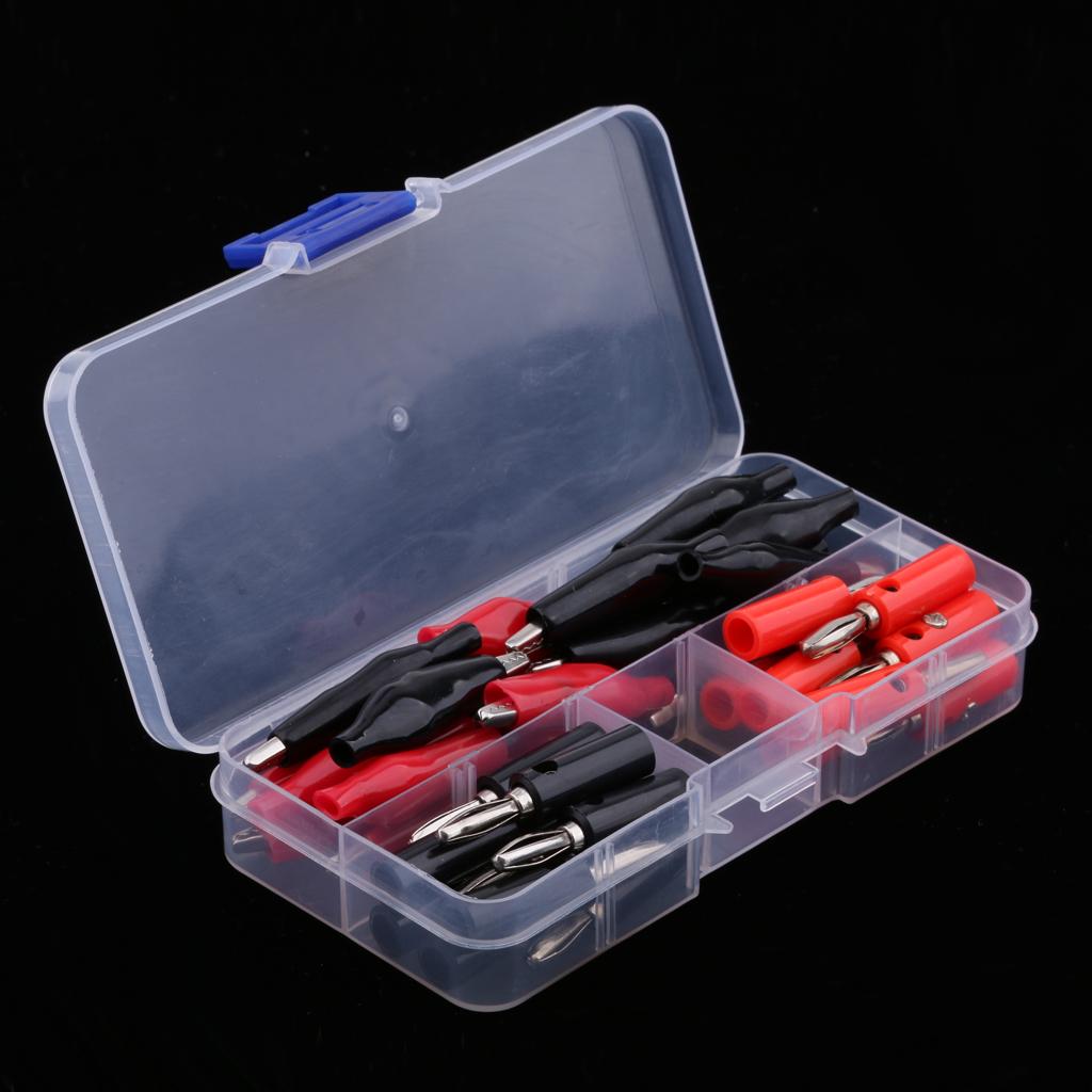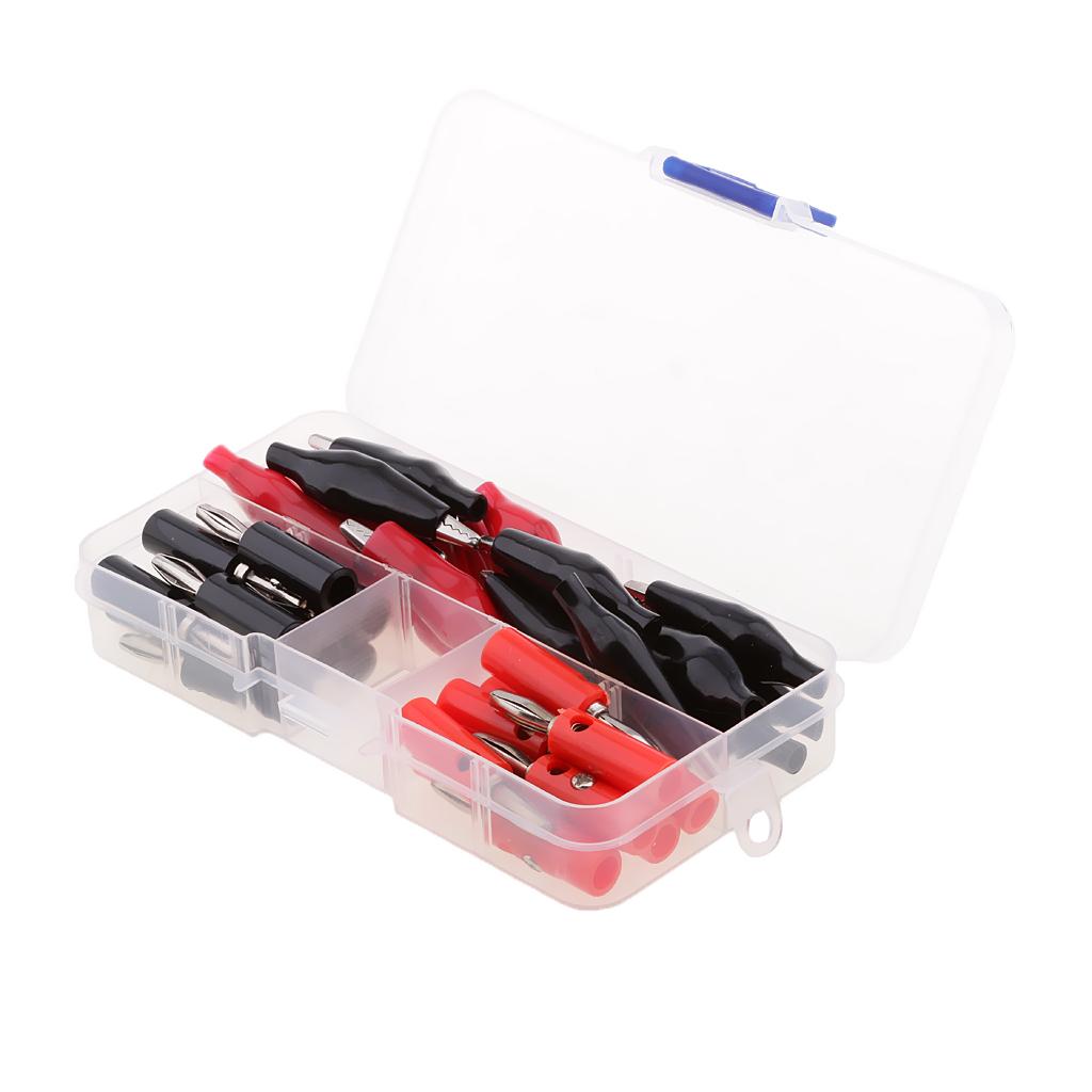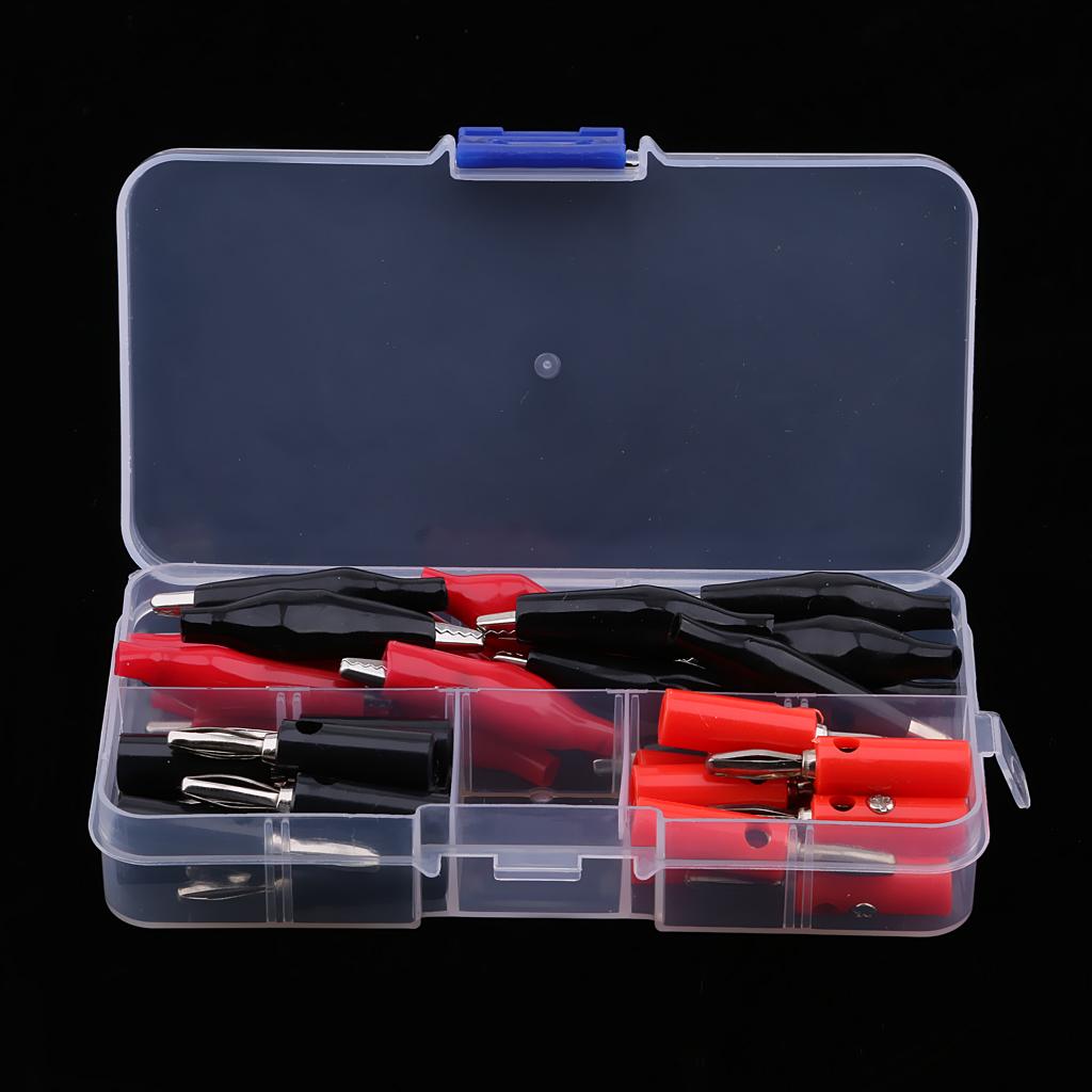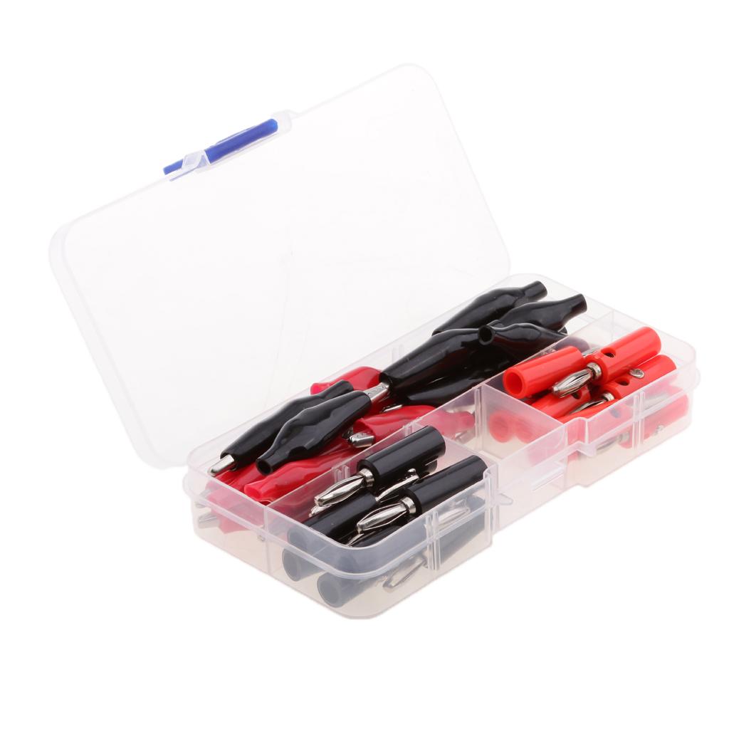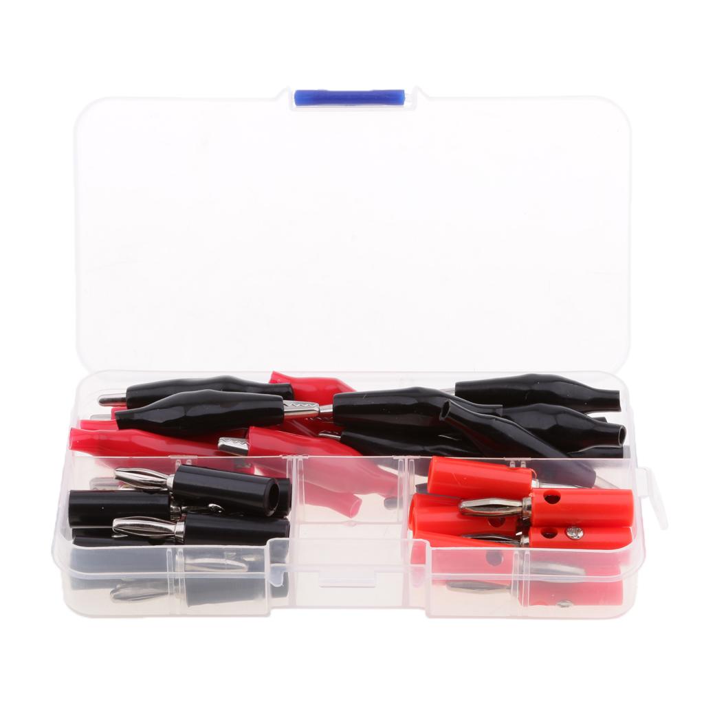 Varied alligator clips and Stackable banana Male Plug Jack Connector assortment, red and black, for home, automotive applications.