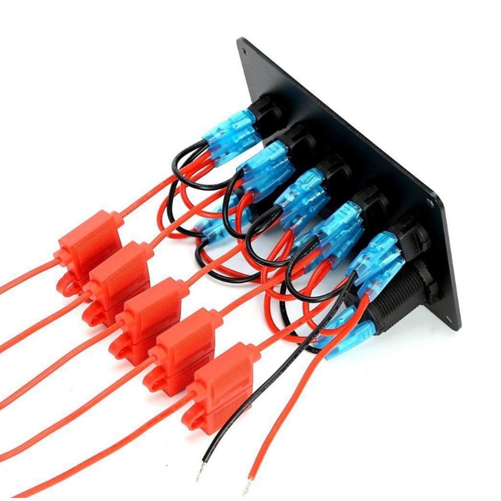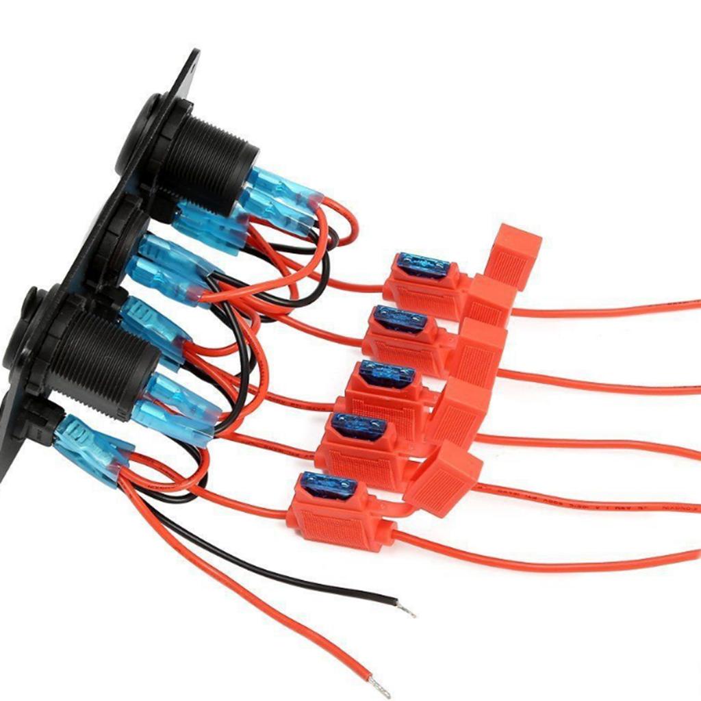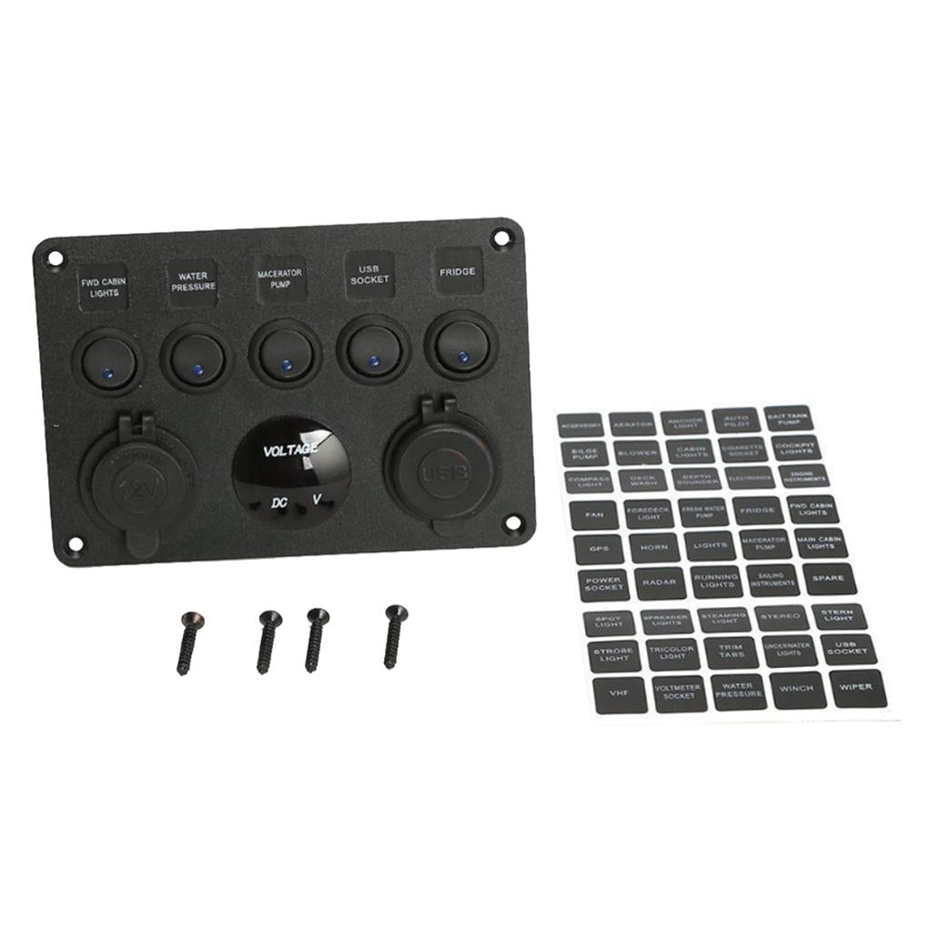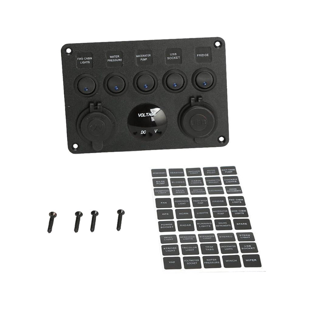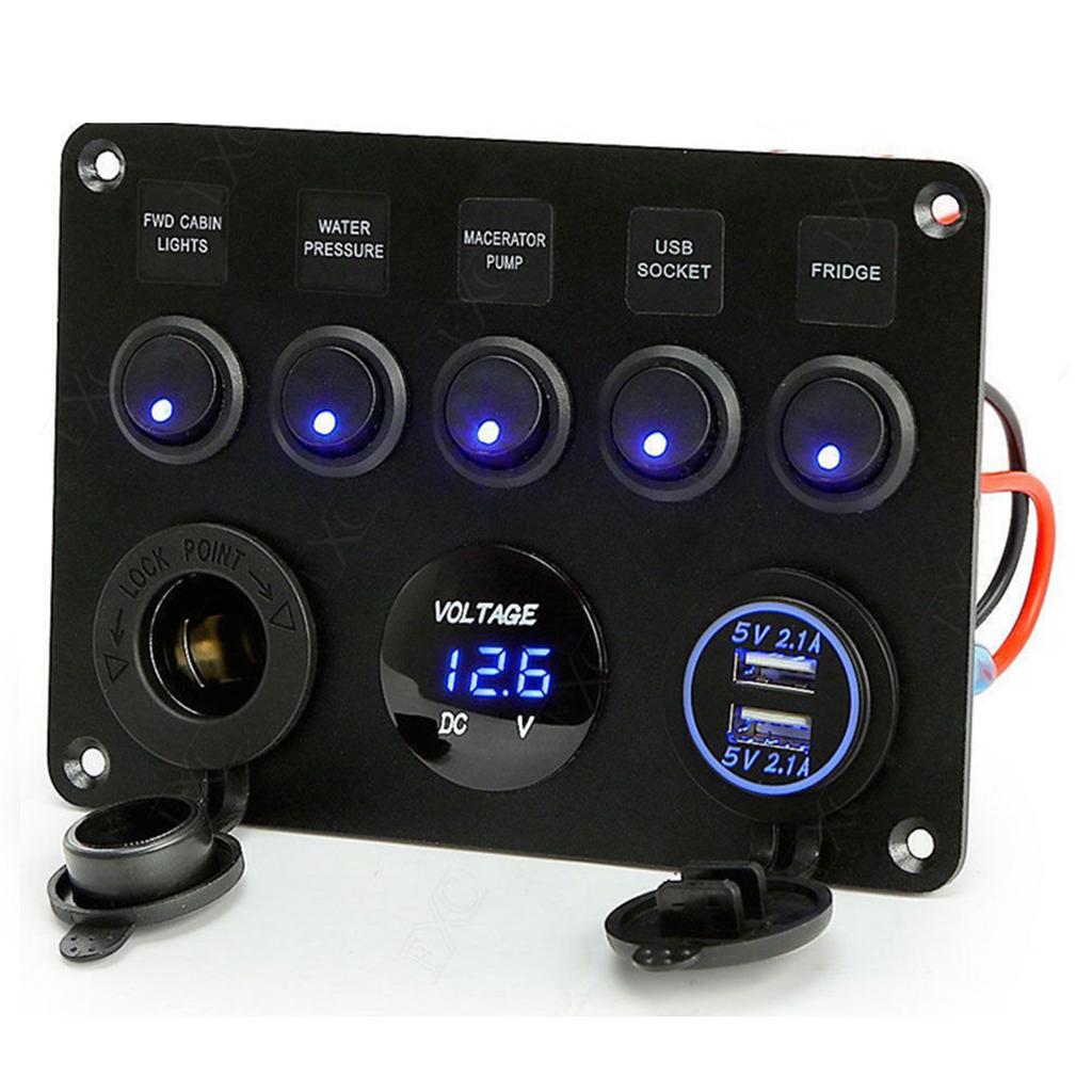 5 Gang LED Boat Rocker Switch Panel Dual USB Socket Power Charger Voltmeter