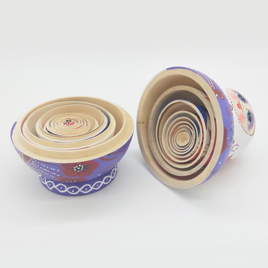 A matryoshka doll also known as a Russian Nesting Doll, or Russian Doll, is a set of wooden dolls of decreasing size placed one inside another. A set of matryoshkas consists of a wooden figure which separates, top from bottom, to reveal a smaller figure of the same sort inside, which has, in turn, another figure inside of it, and so on.