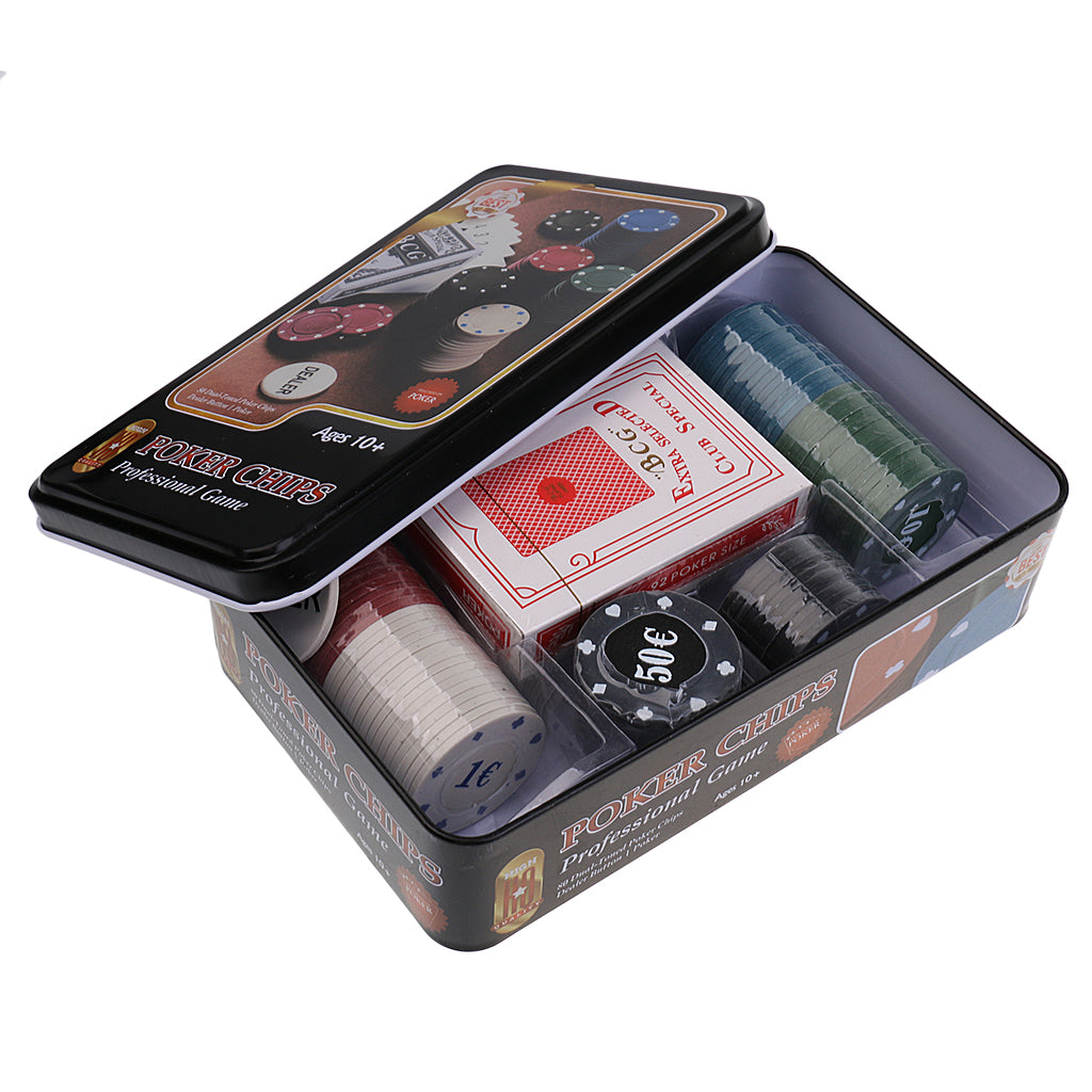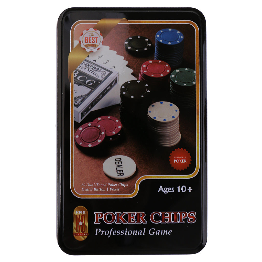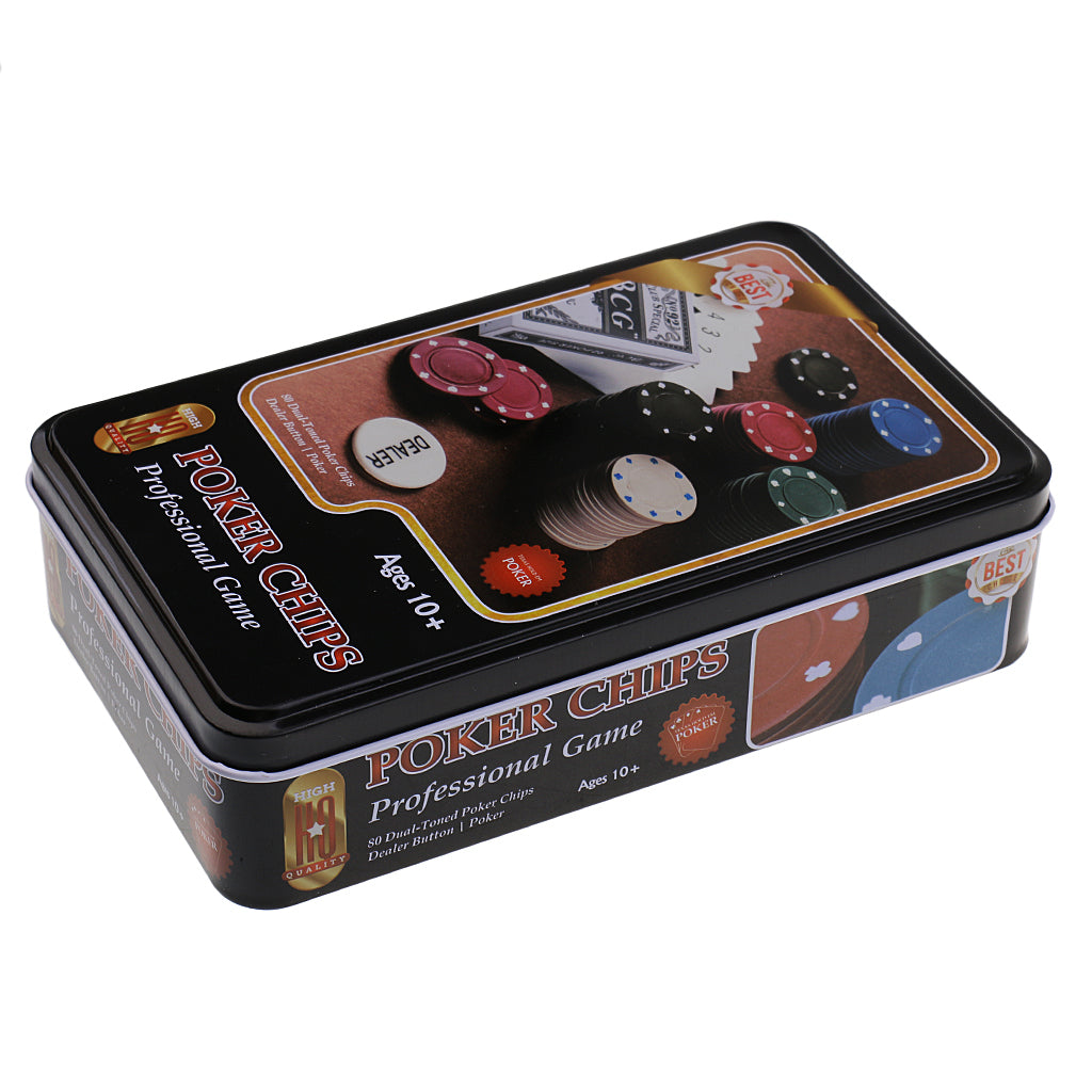 80 pieces poker chips(4 denomination) and 1 piece dealer button, 1 piece poker set housed in an iron box
