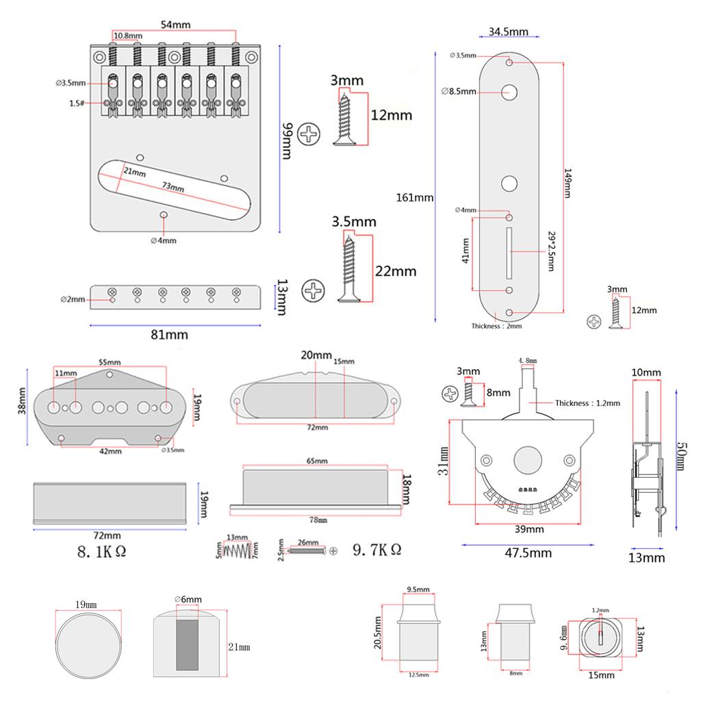 Includes 3 way switches, neck and bridge pickups, volume and tone knobs.