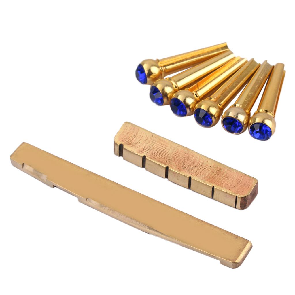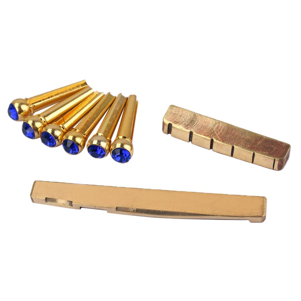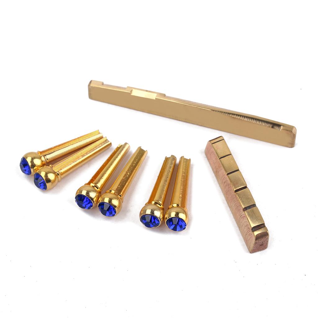Brass 6 String Guitar Slotted Nut Saddle with Blue Opal Bridge Pins Set.