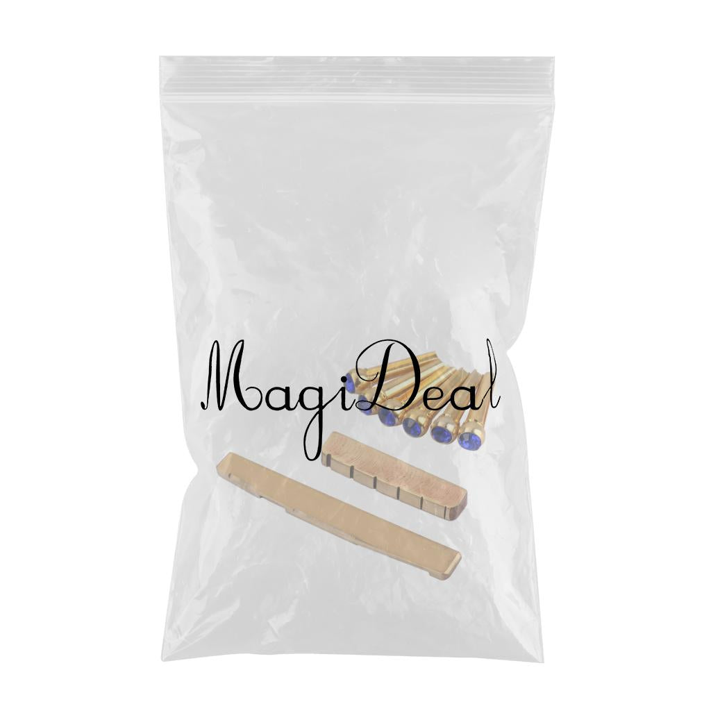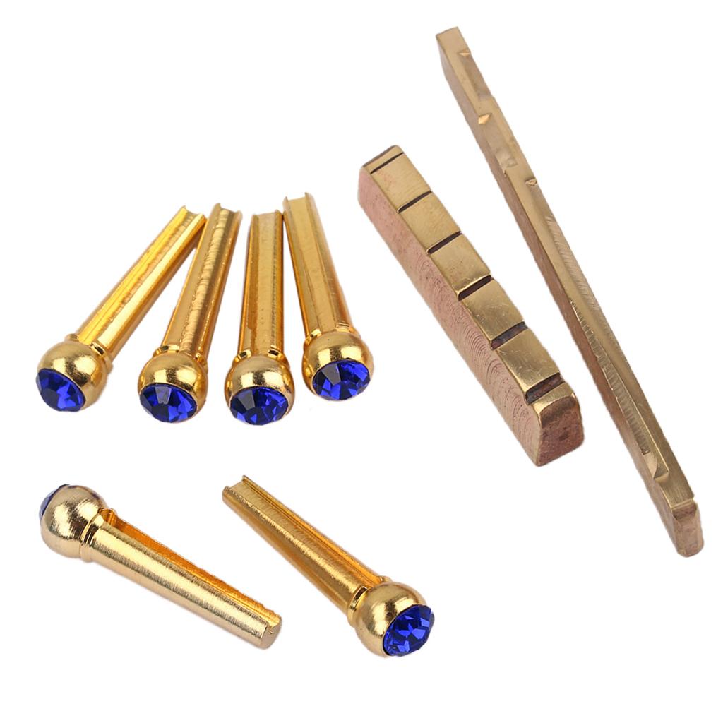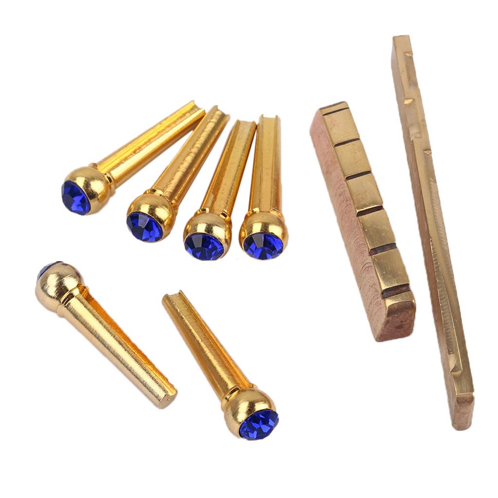 Brass 6 String Guitar Slotted Nut Saddle with Blue Opal Bridge Pins Set.