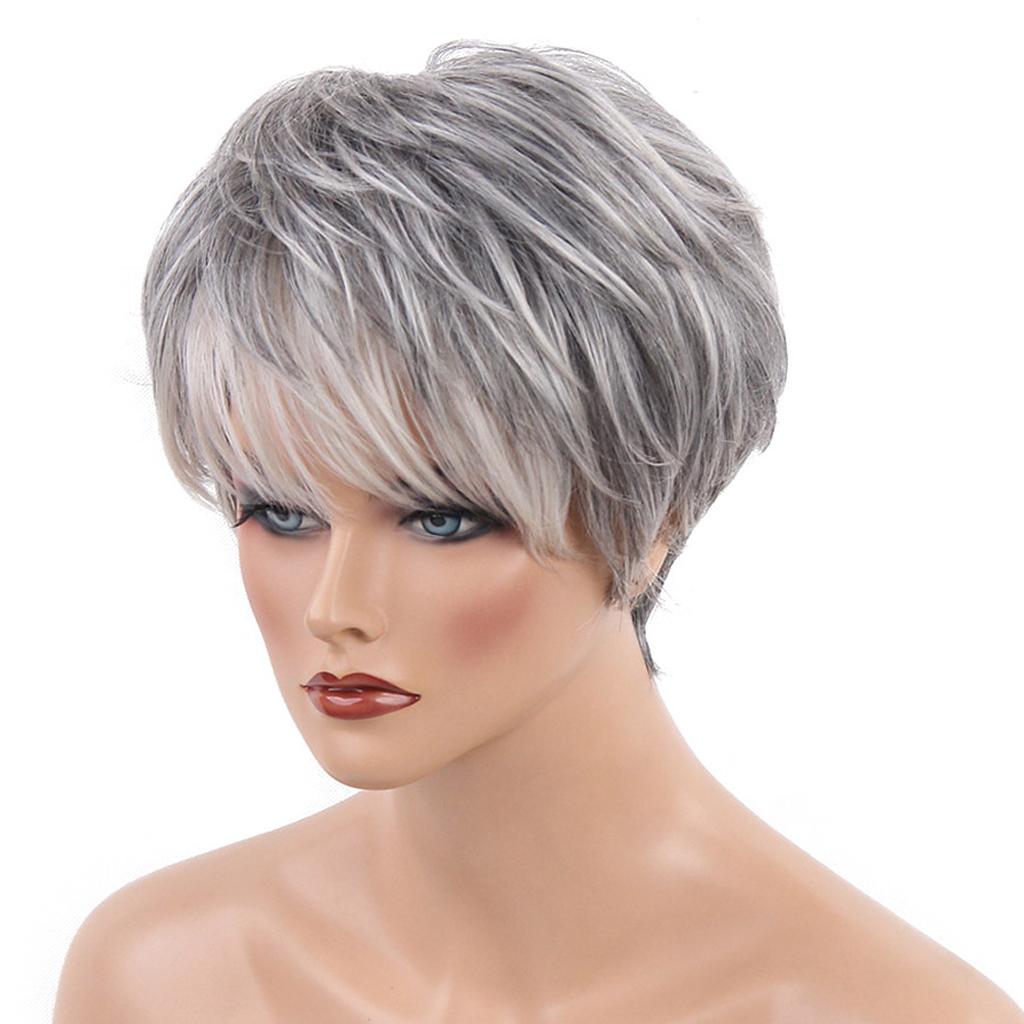 Cool Design Short Straight Wigs with Bangs Silver Gray Color Heat Perm OK 70% Real Human Hair Full Head Women Wigs,Pixie Cut Layer Wig