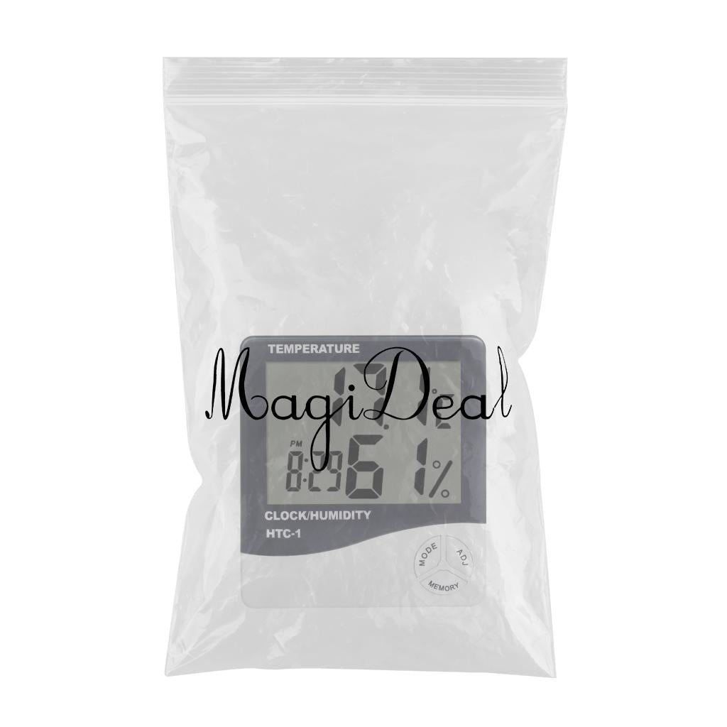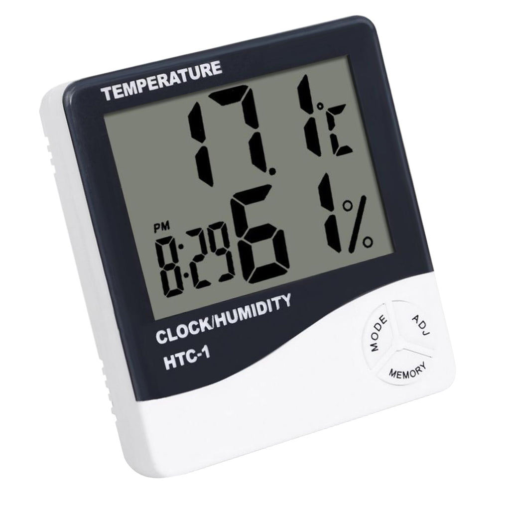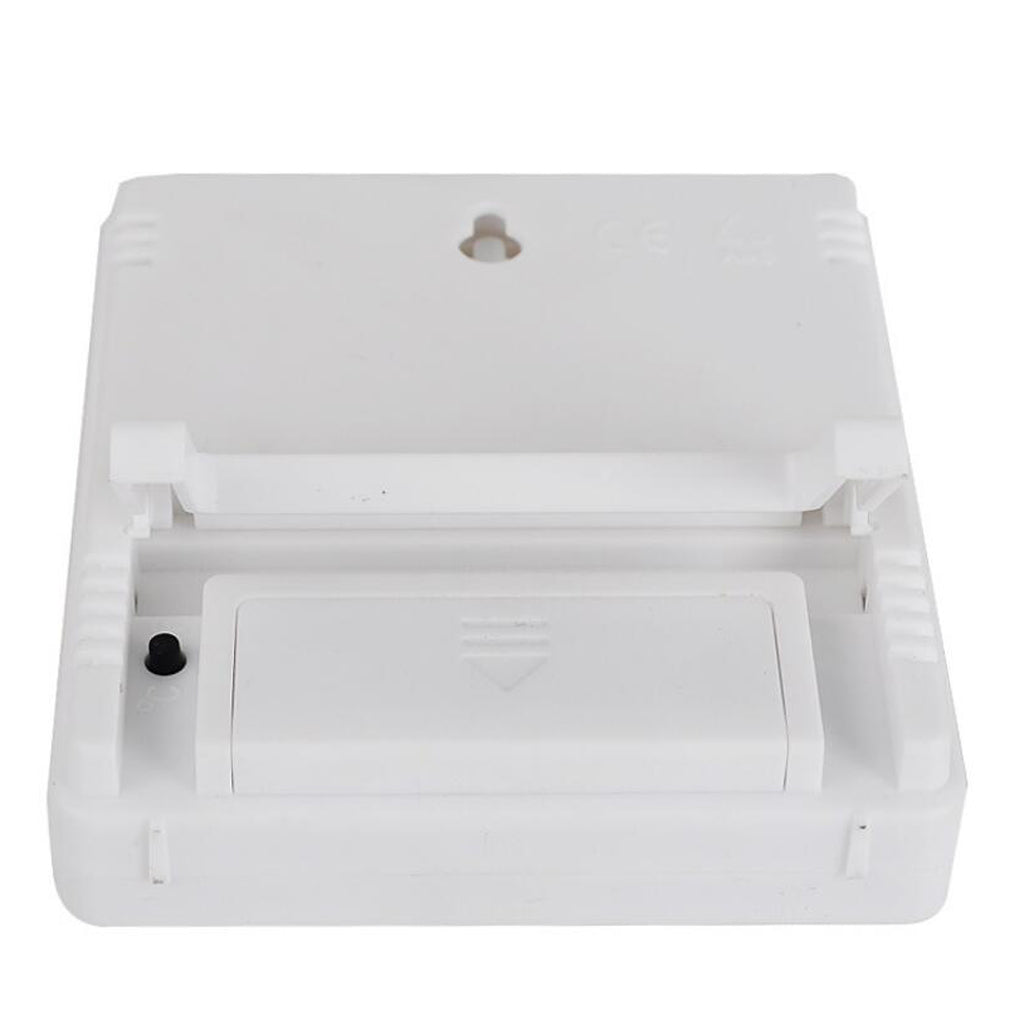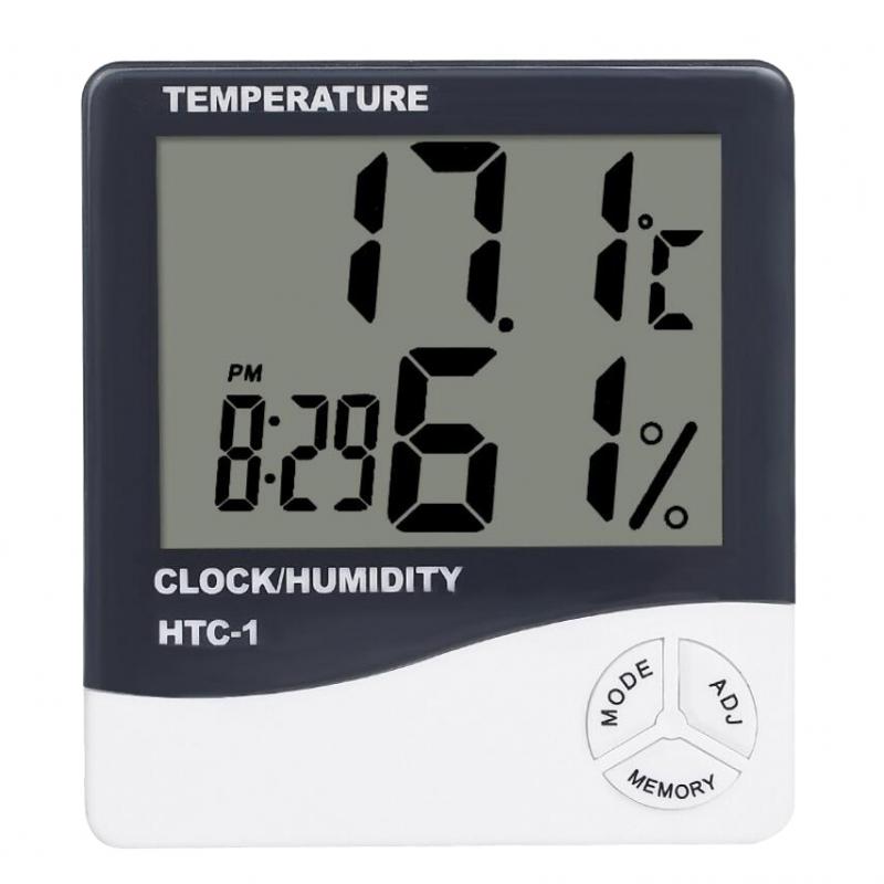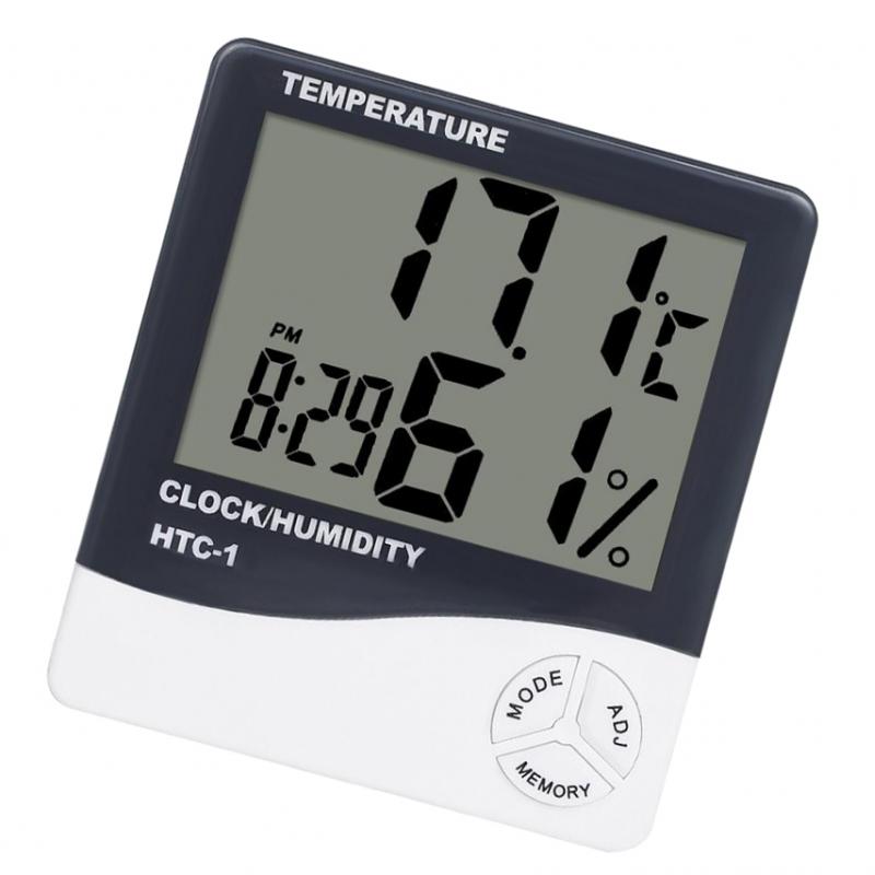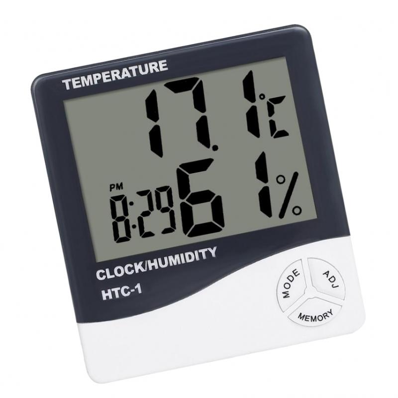 Functions: clock, calendar, alarm, with large-character LCD display showing temp, humidity and time simultaneously.