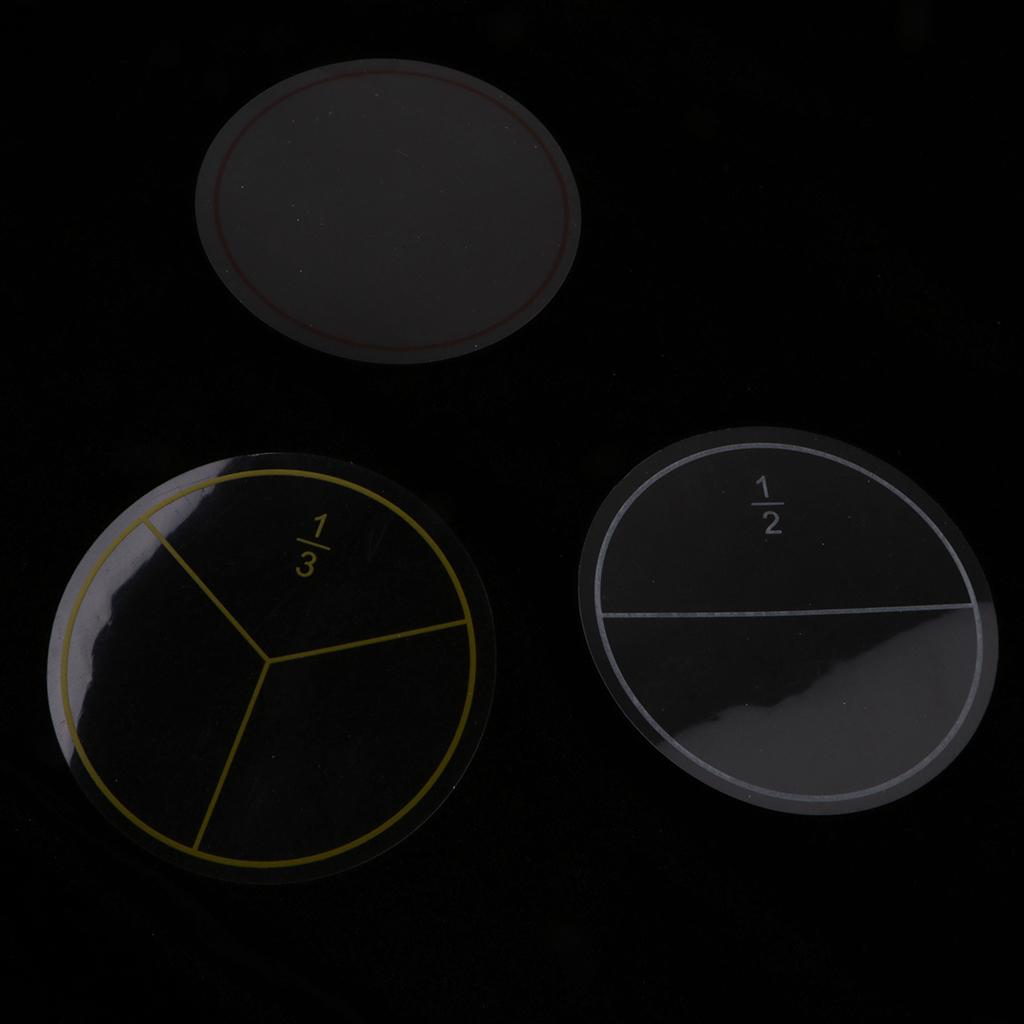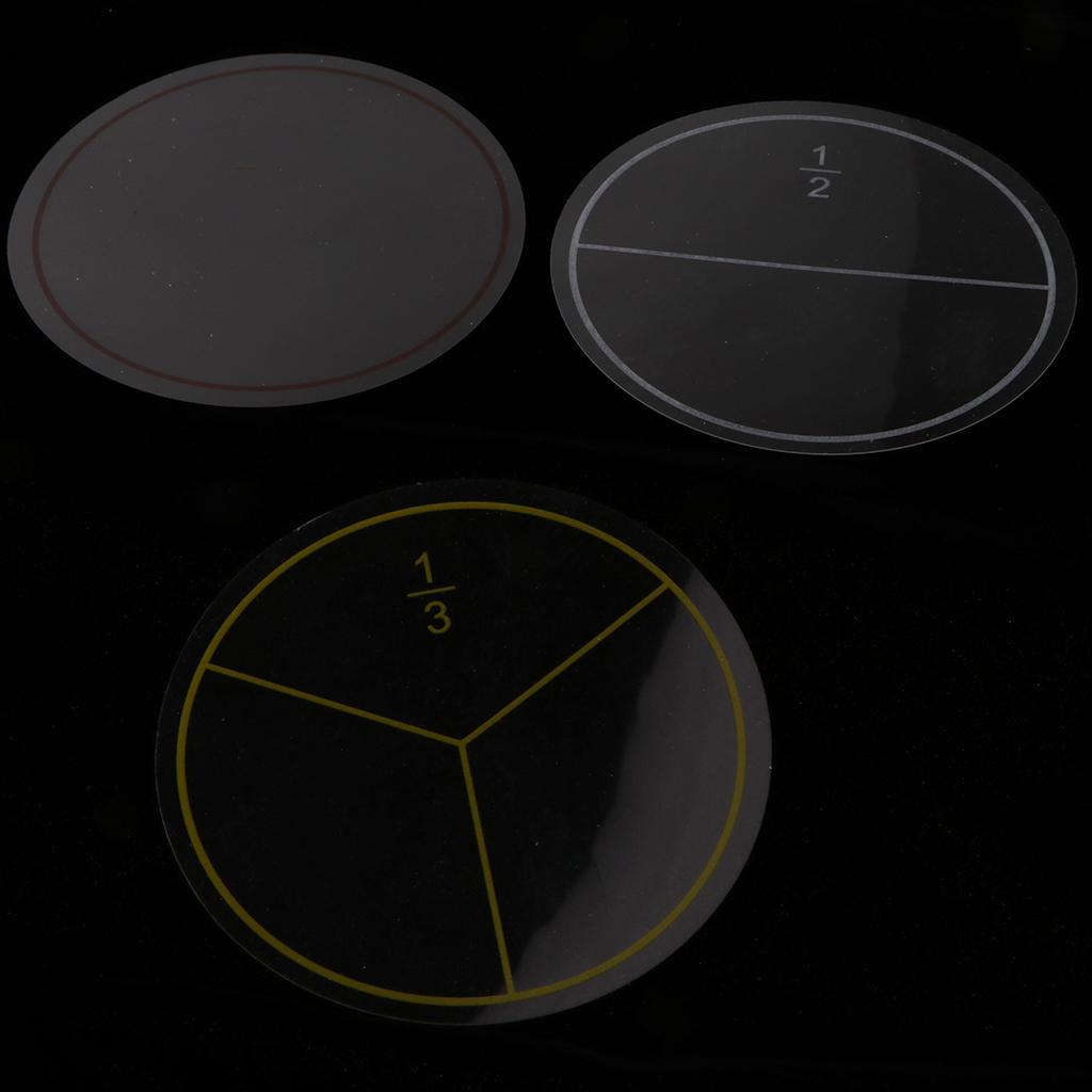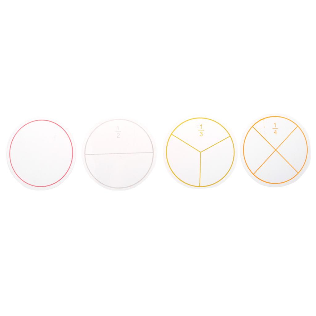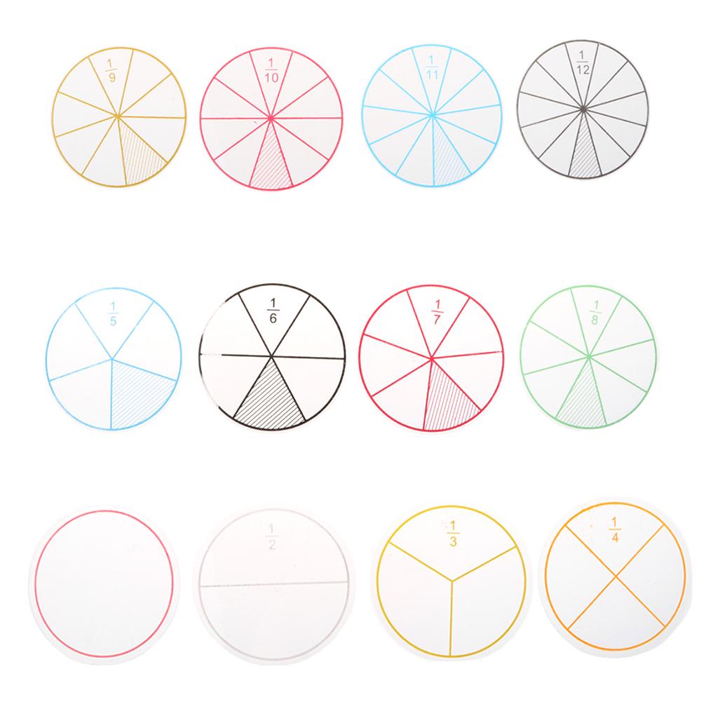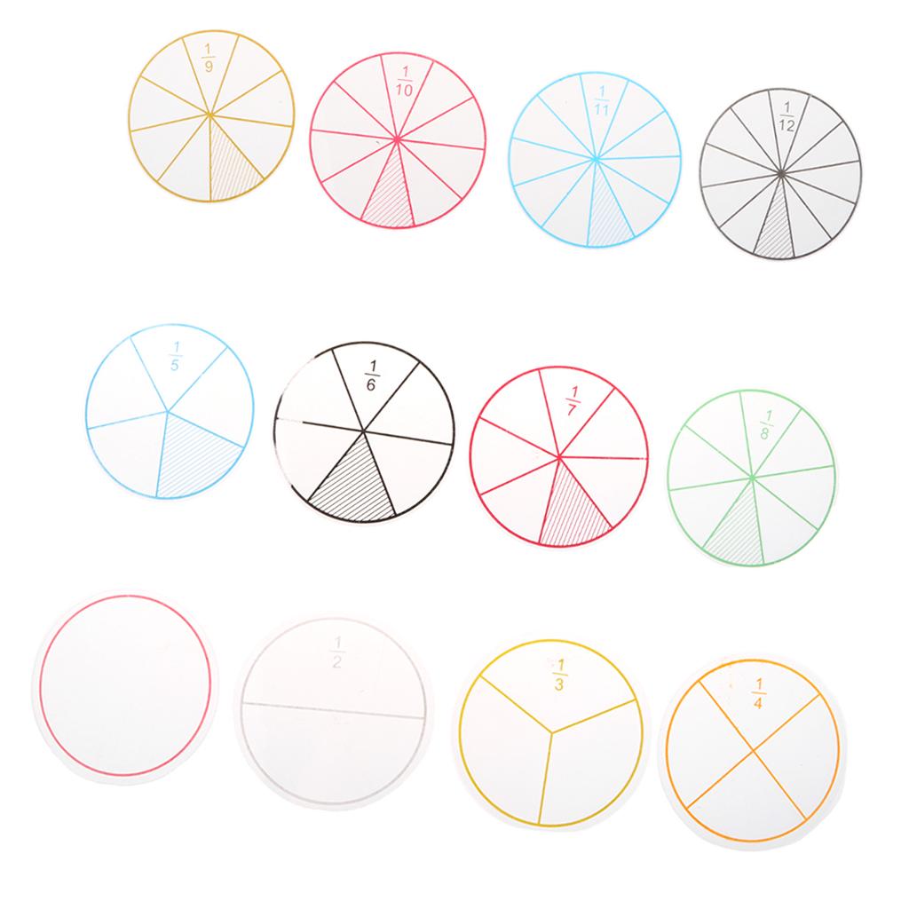 Set of plastic numbered fraction circles includes 12 circles representing 1/1, 1/2, 1/3, 1/4, 1/5, 1/6, 1/7, 1/8, 1/9, 1/10, 1/11and 1/12