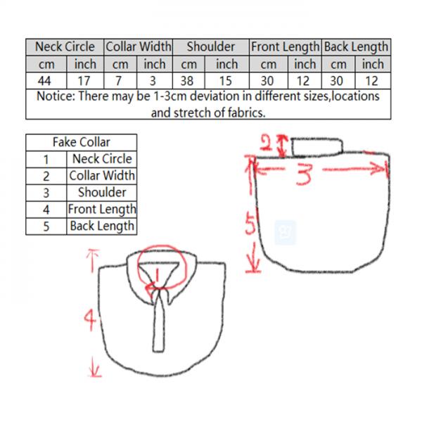 Neck Circle:44cm/17inch; Collar Width:7cm/3inch; Shoulder:38cm/15inch; Front Length:30cm/12inch; Back Length:30cm/12inch.