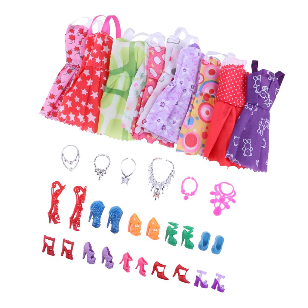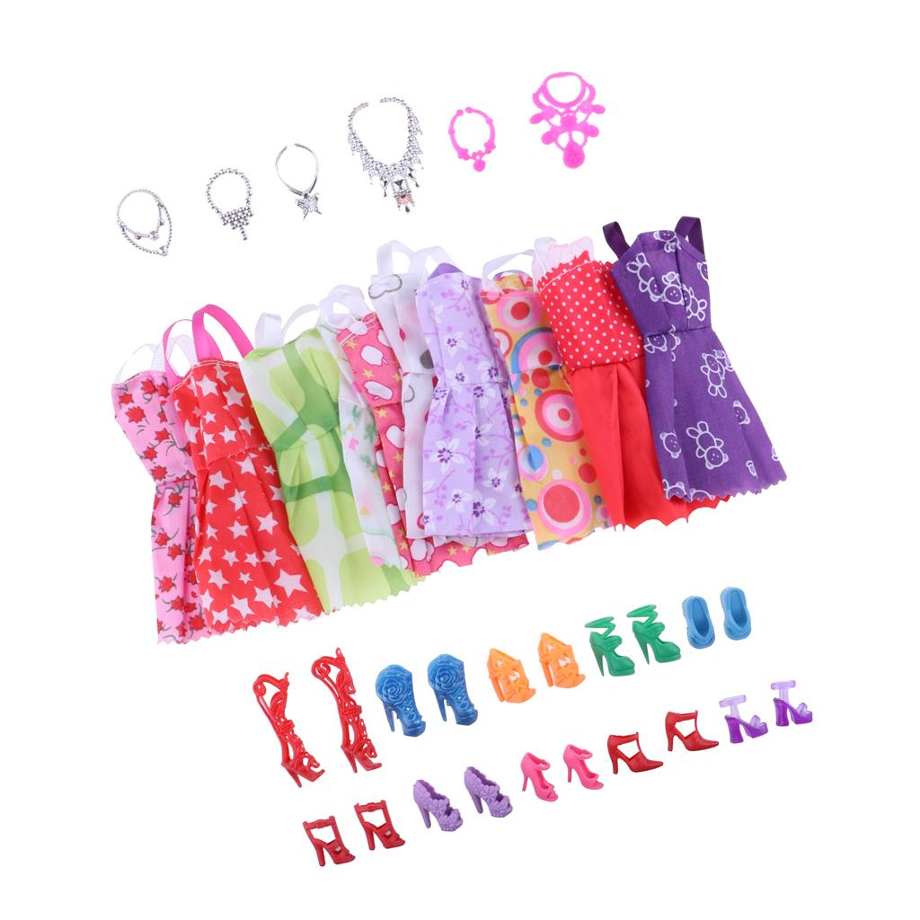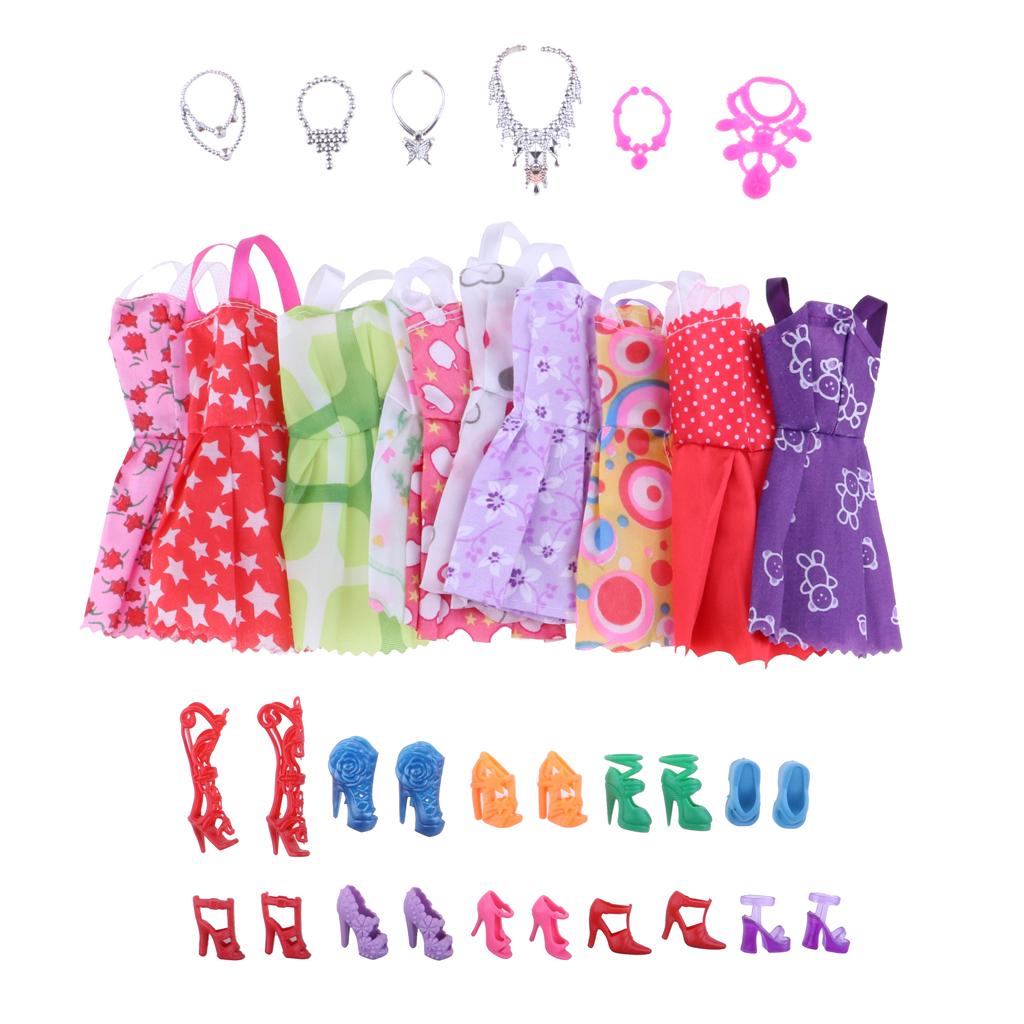 Pack of 26 items (including 10 pieces dresses, 6 pieces necklaces and 10 pairs shoes) to fit Barbie doll