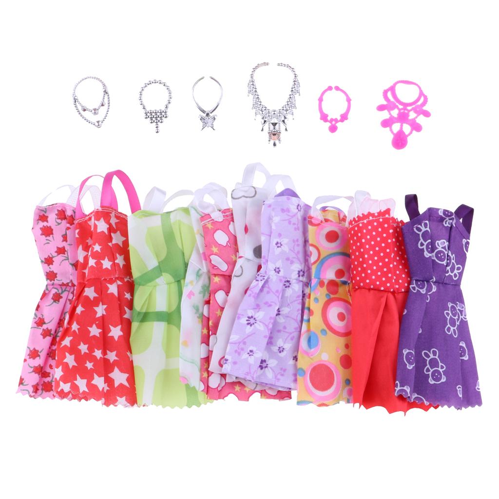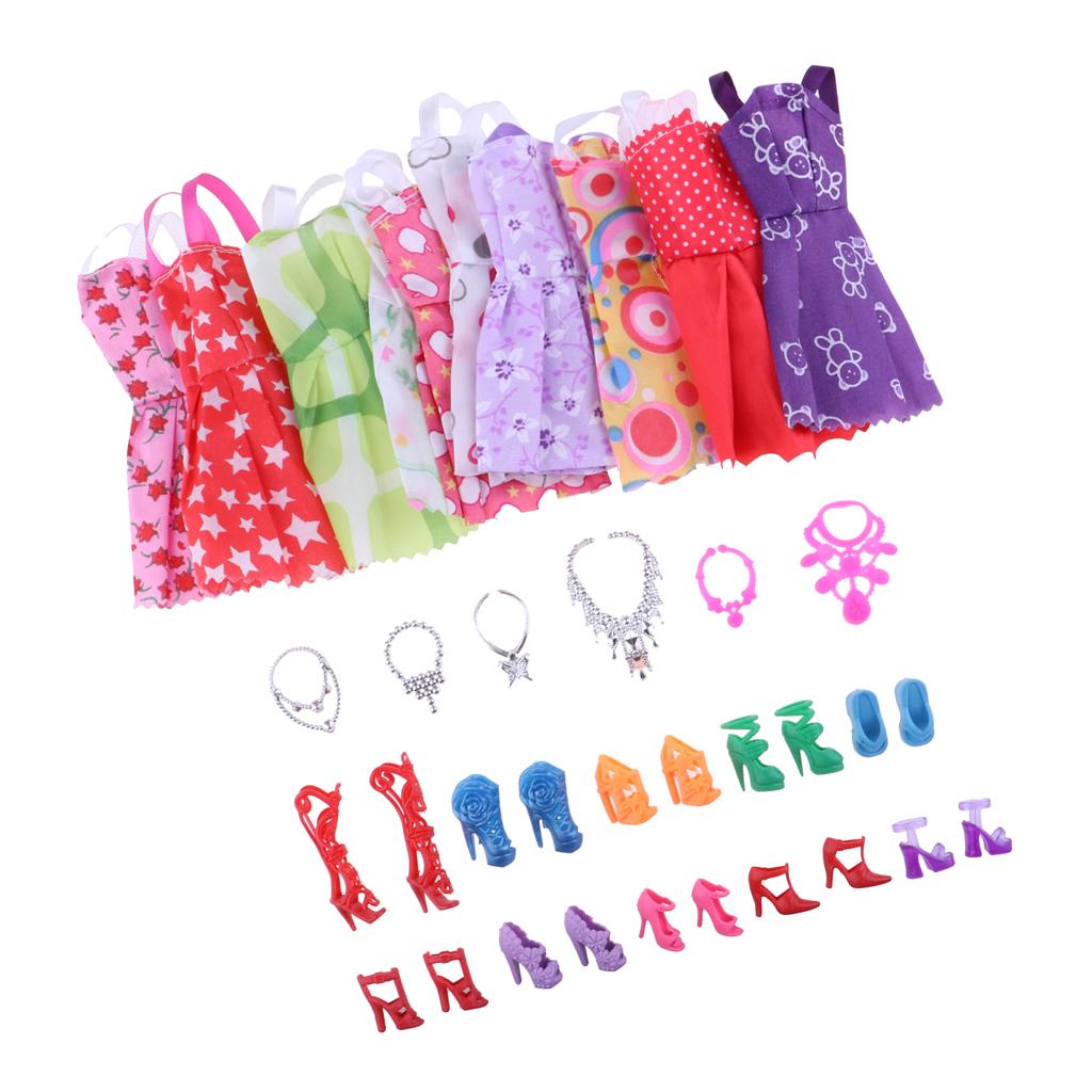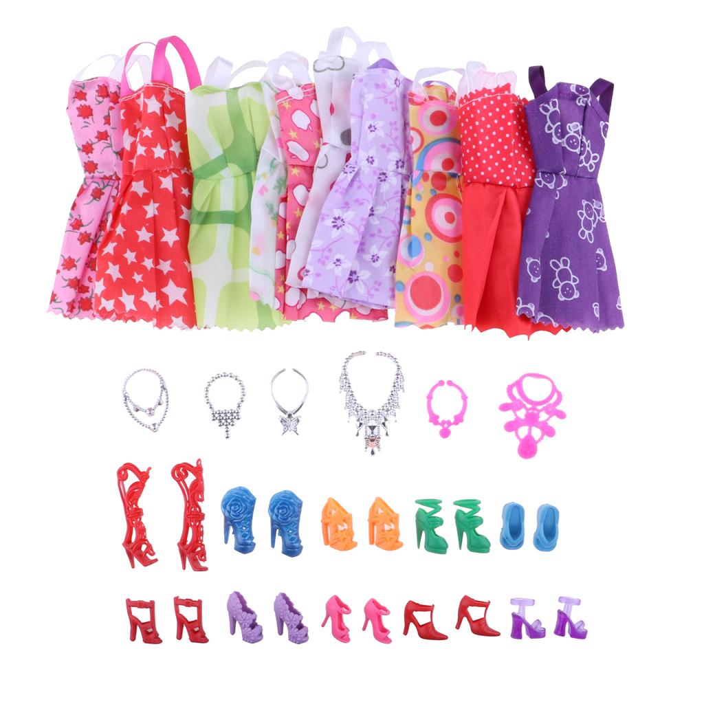 Pack of 26 items (including 10 pieces dresses, 6 pieces necklaces and 10 pairs shoes) to fit Barbie doll