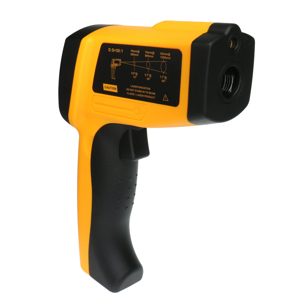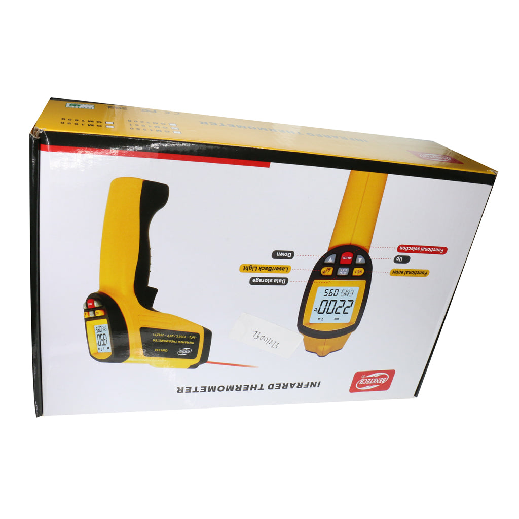 LCD with backlight, low battery indicator. 8 functions, MAX, MIN, AVG, Data Hold, Emissivity Setting, DIF, Low temperature alarm, Heat alarm.