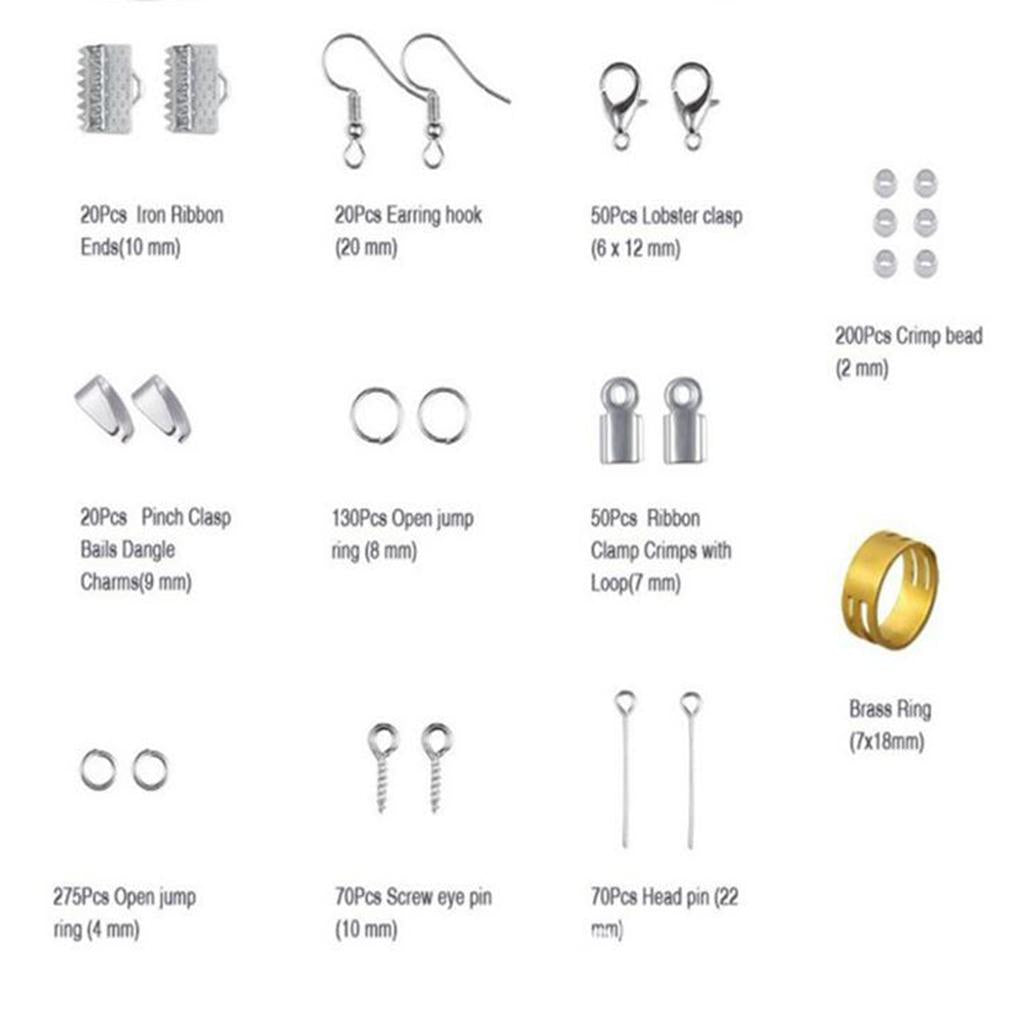 Brass ring(7x18mm),275pcs open jump ring(4mm), 70pcs screw eye pin(10mm). 70pcs head pin(22mm), 200pcs crimp beads
