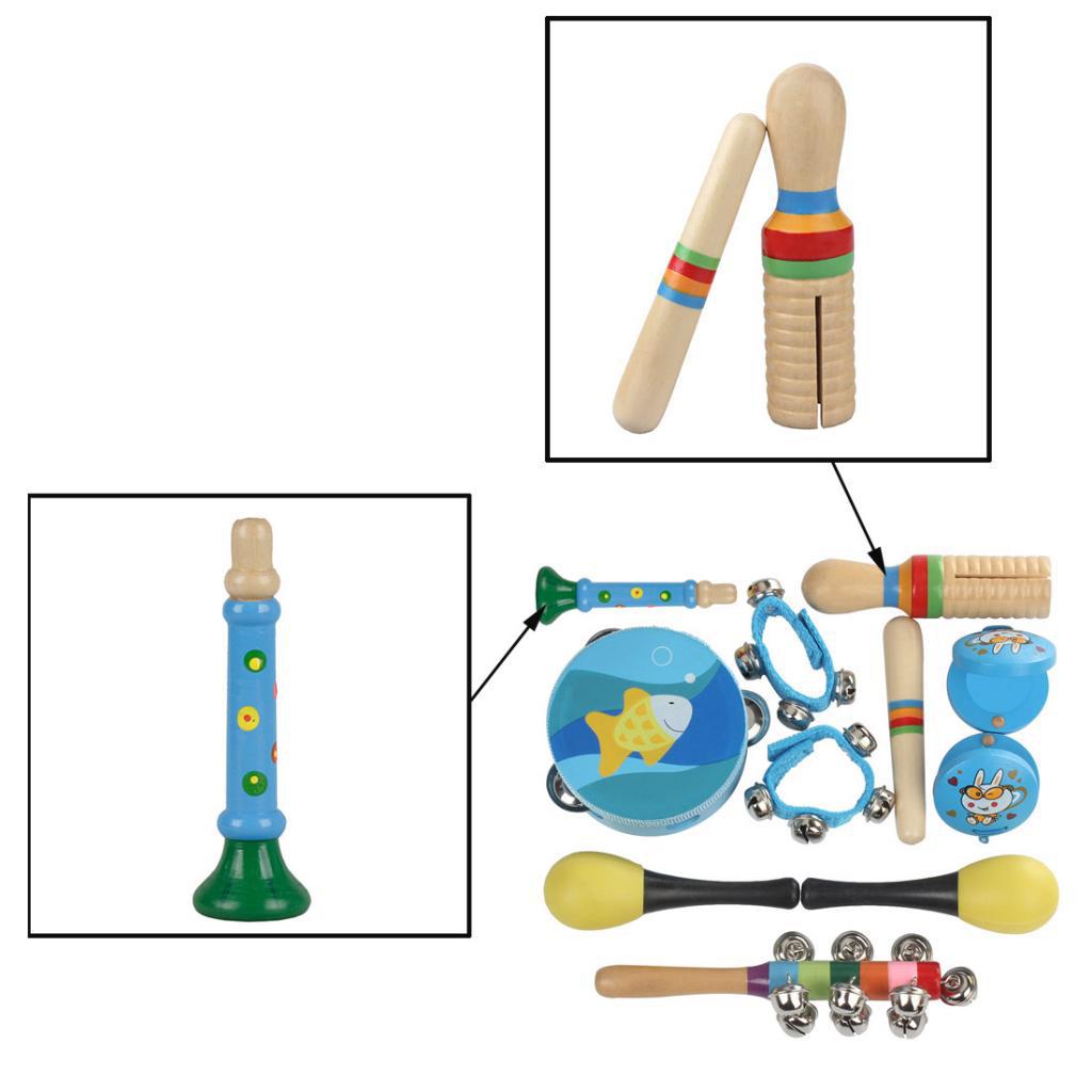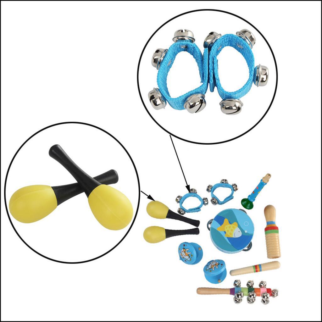 7 in 1 musical percussion instrument toy set, includes variety of musical toy, such as maraca, tambourine, rainbow bell stick, finger castanets, tone blocks, waist bells, sleigh bell.