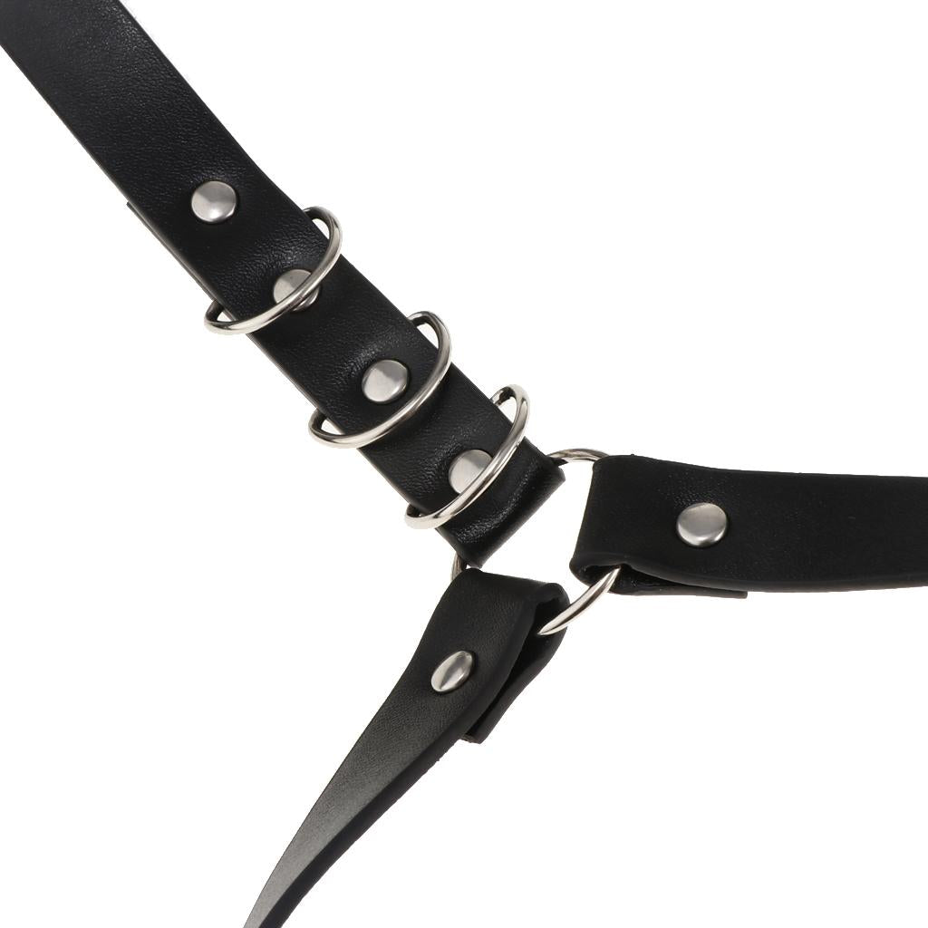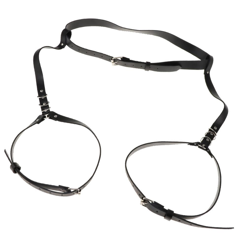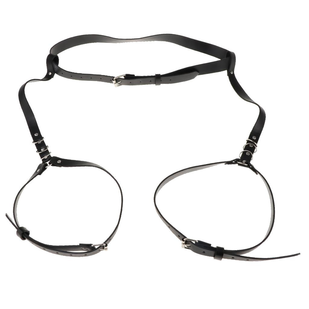 PU leather body harness belt, punk style, adjustable waist, leg rings with O-rings and studs.