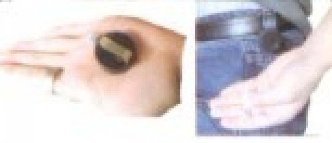 Step One: pull out the magnet bag (as picture 2) and clamp it with the front ends of index finger and middle finger of your left hand; use your thumb to press it. This action should be nature enough that the audiences will not find it. And you should hide the springback line under your arm.