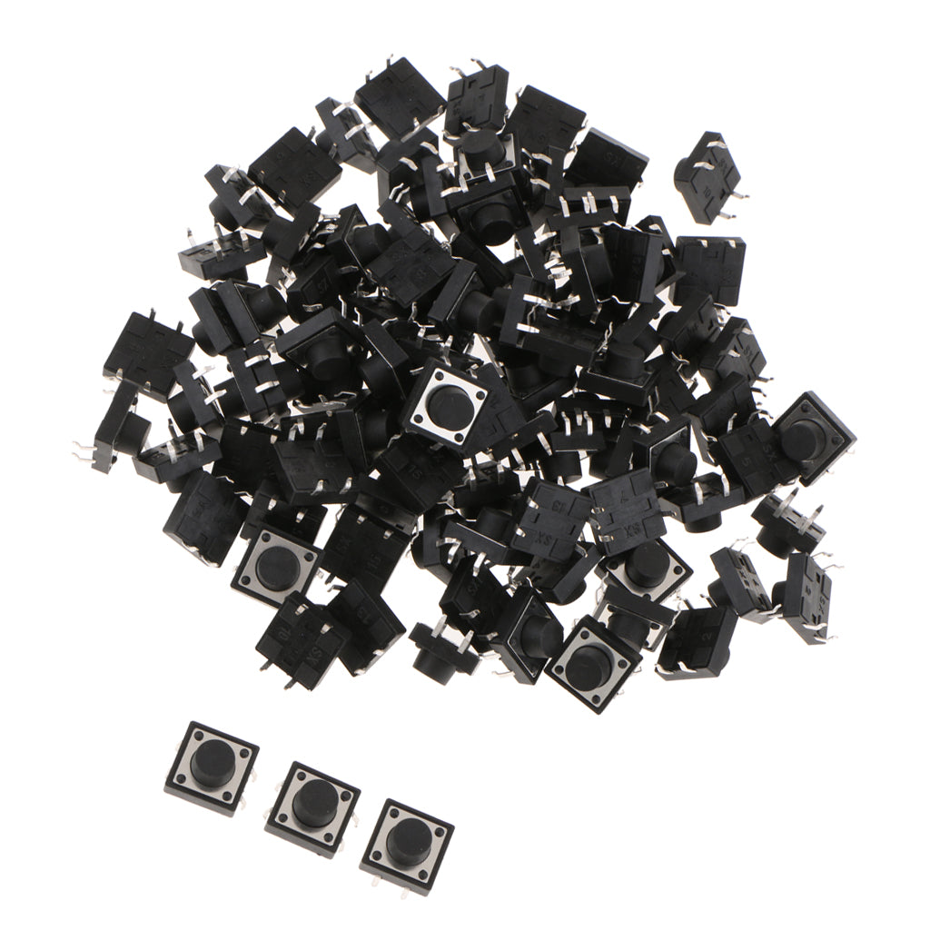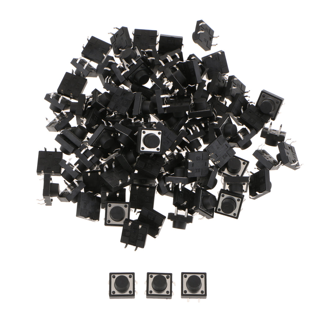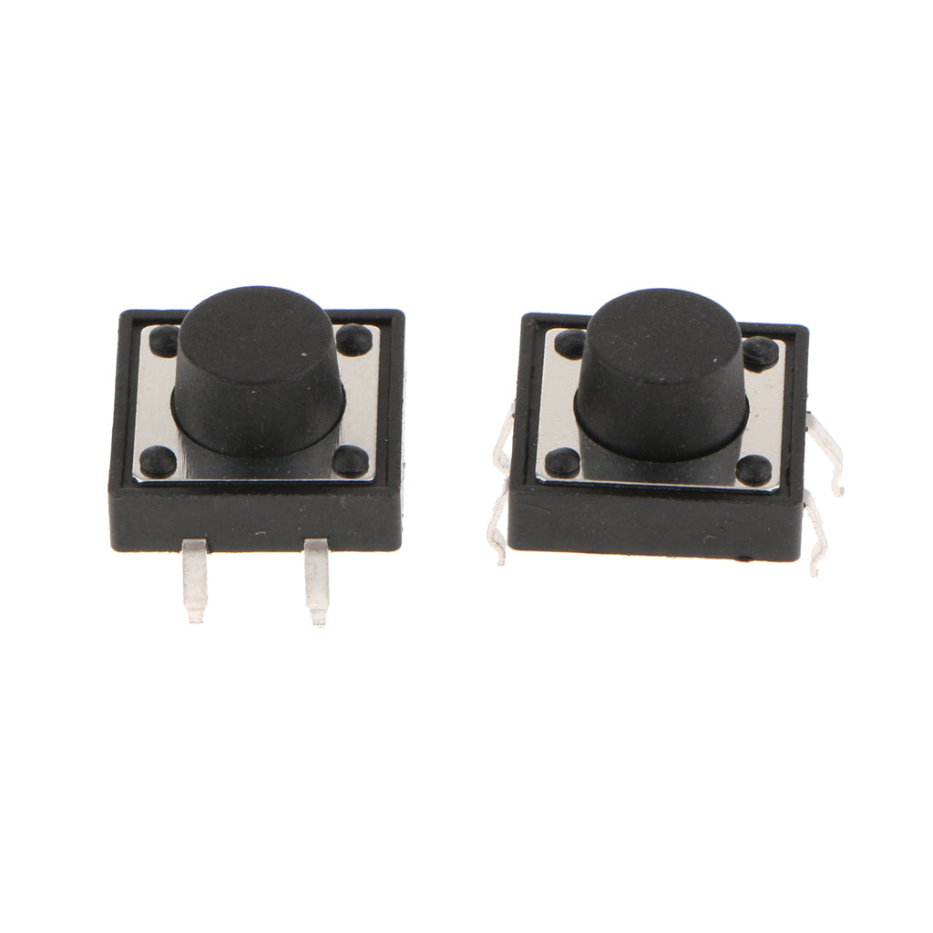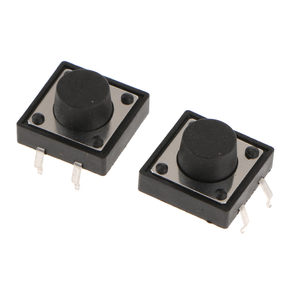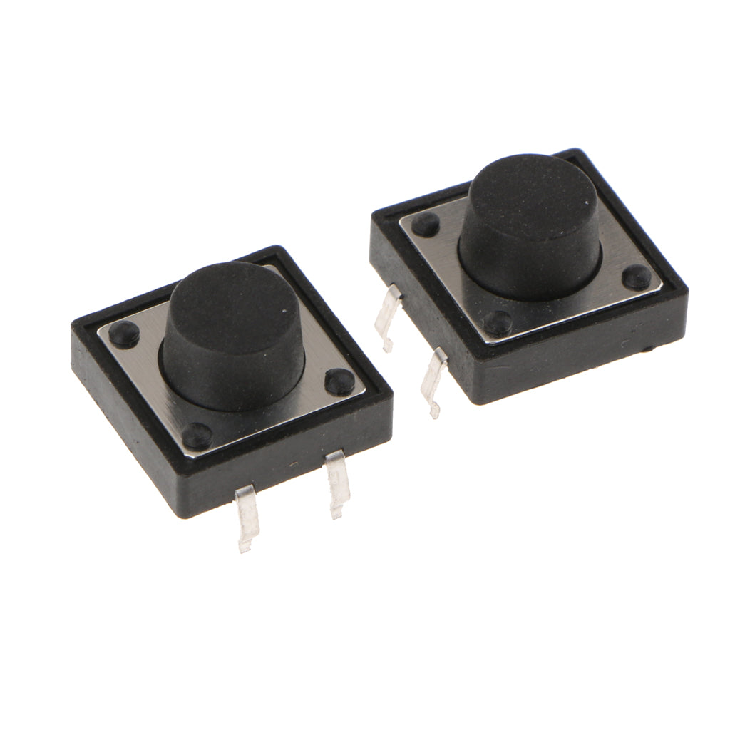 4 pins, standard pin spacing,round black push button, through hole mounting, 12 x 12 x 7mm size, etc.