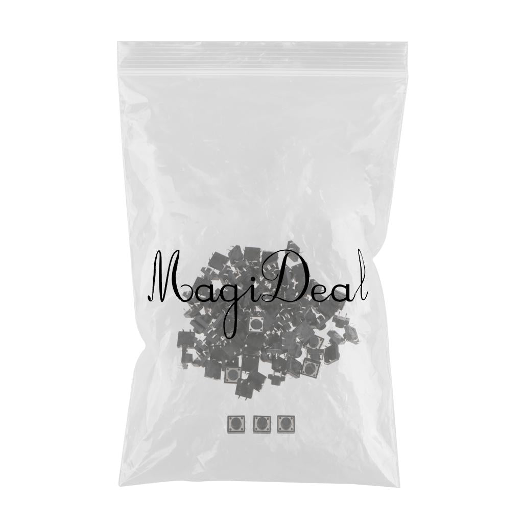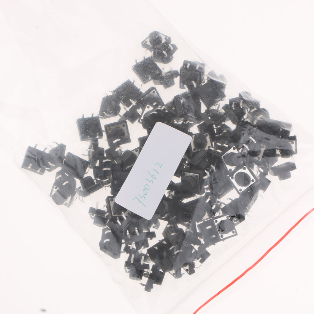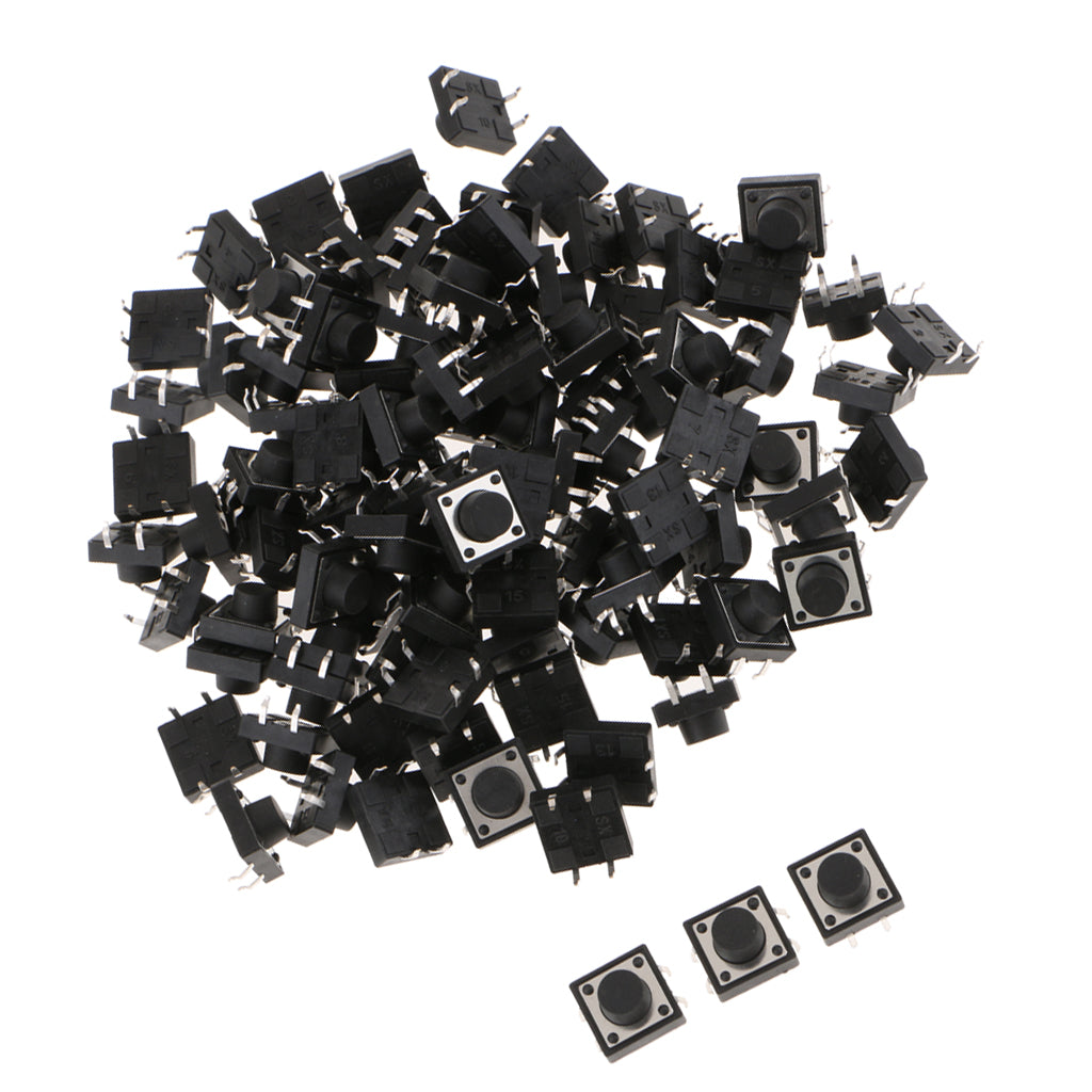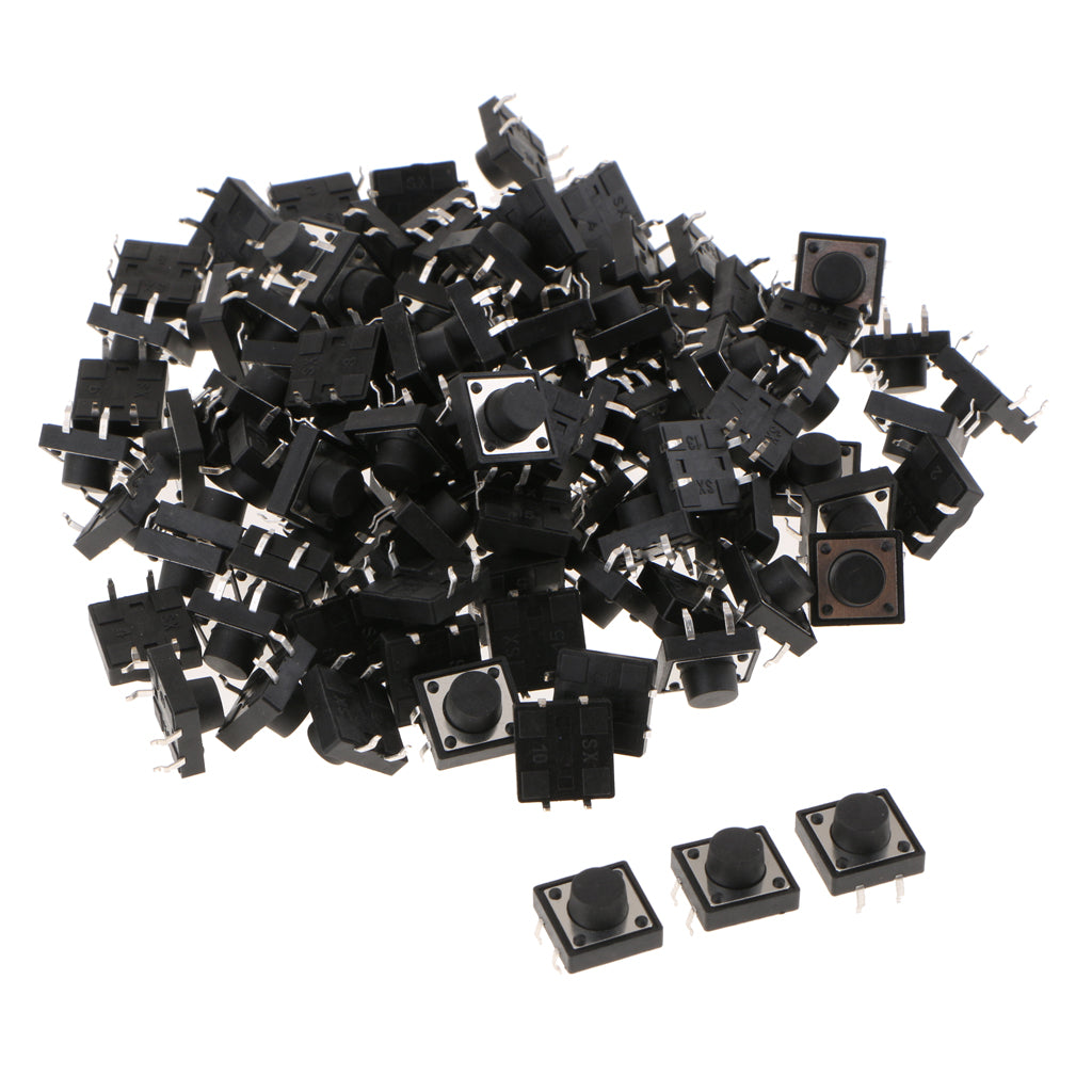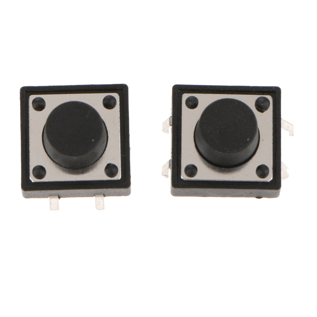 4 pins, standard pin spacing,round black push button, through hole mounting, 12 x 12 x 7mm size, etc.