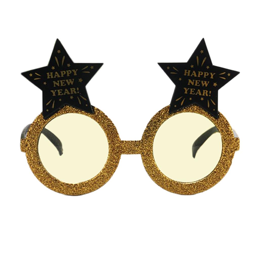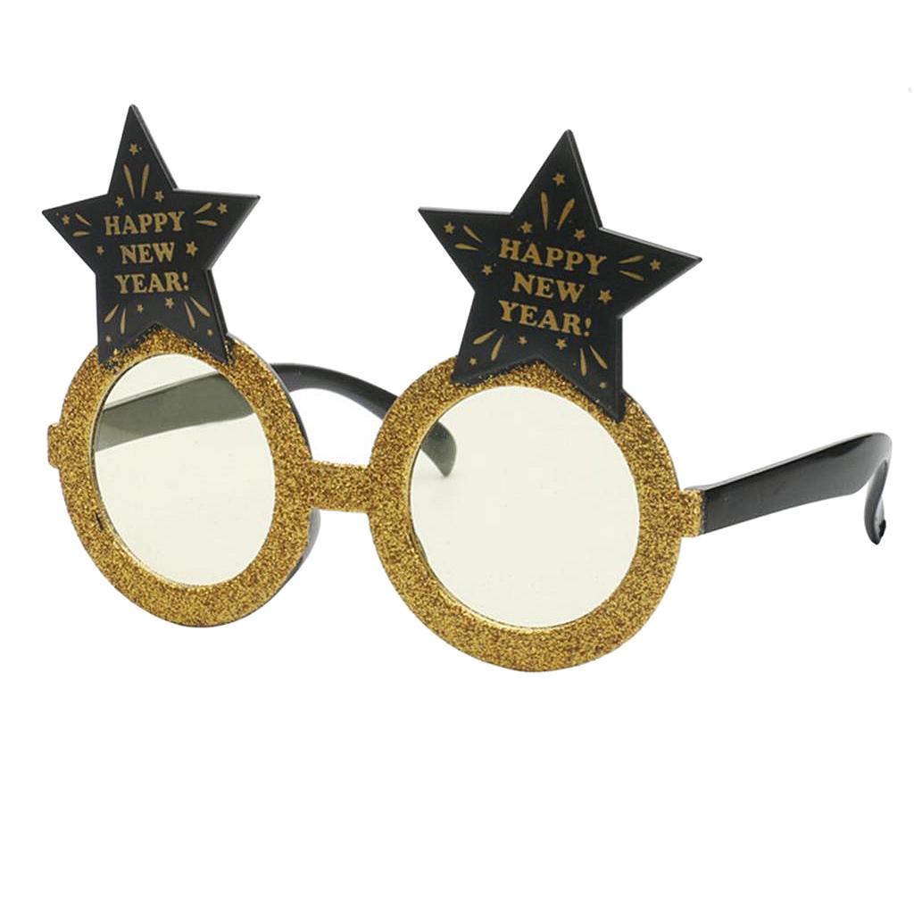 The novelty eye glasses featuring glitter gold circle and black stars, the stars having HAPPY NEW YEAR sign
