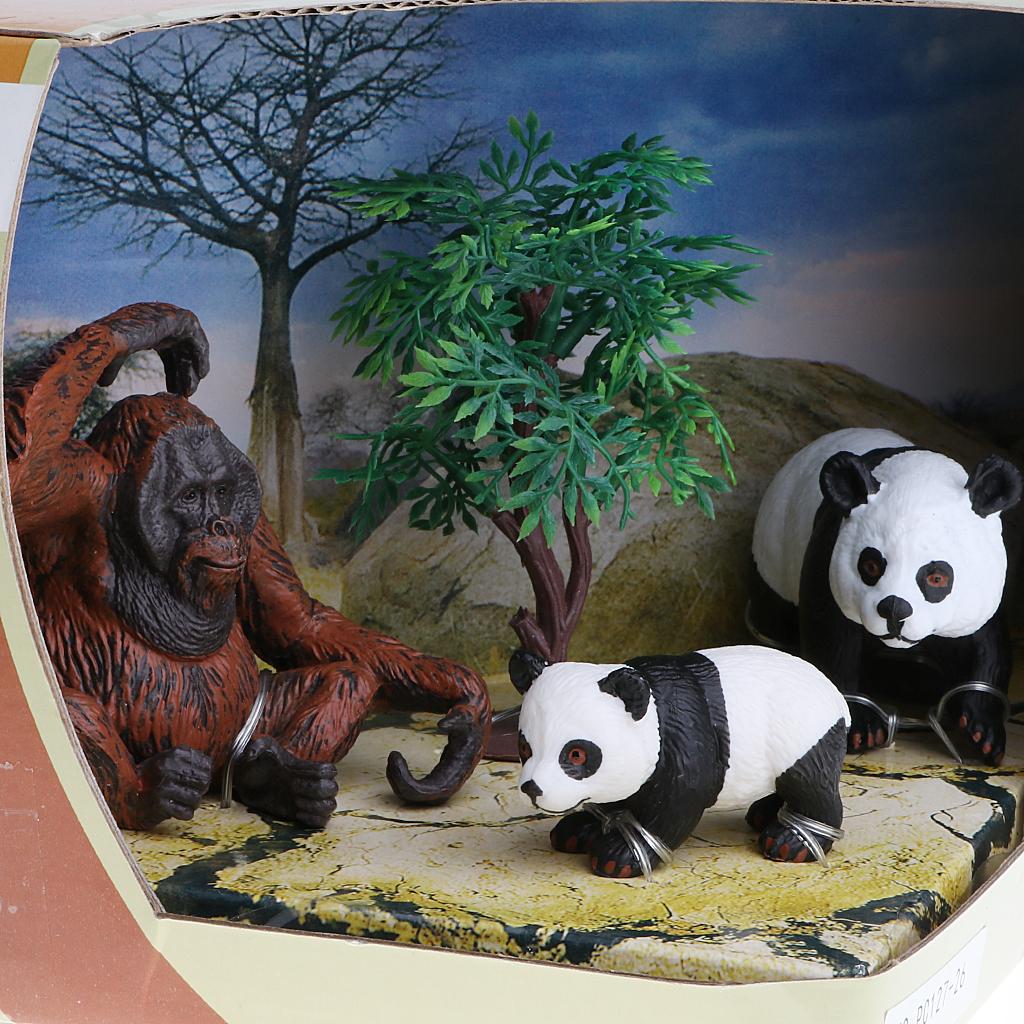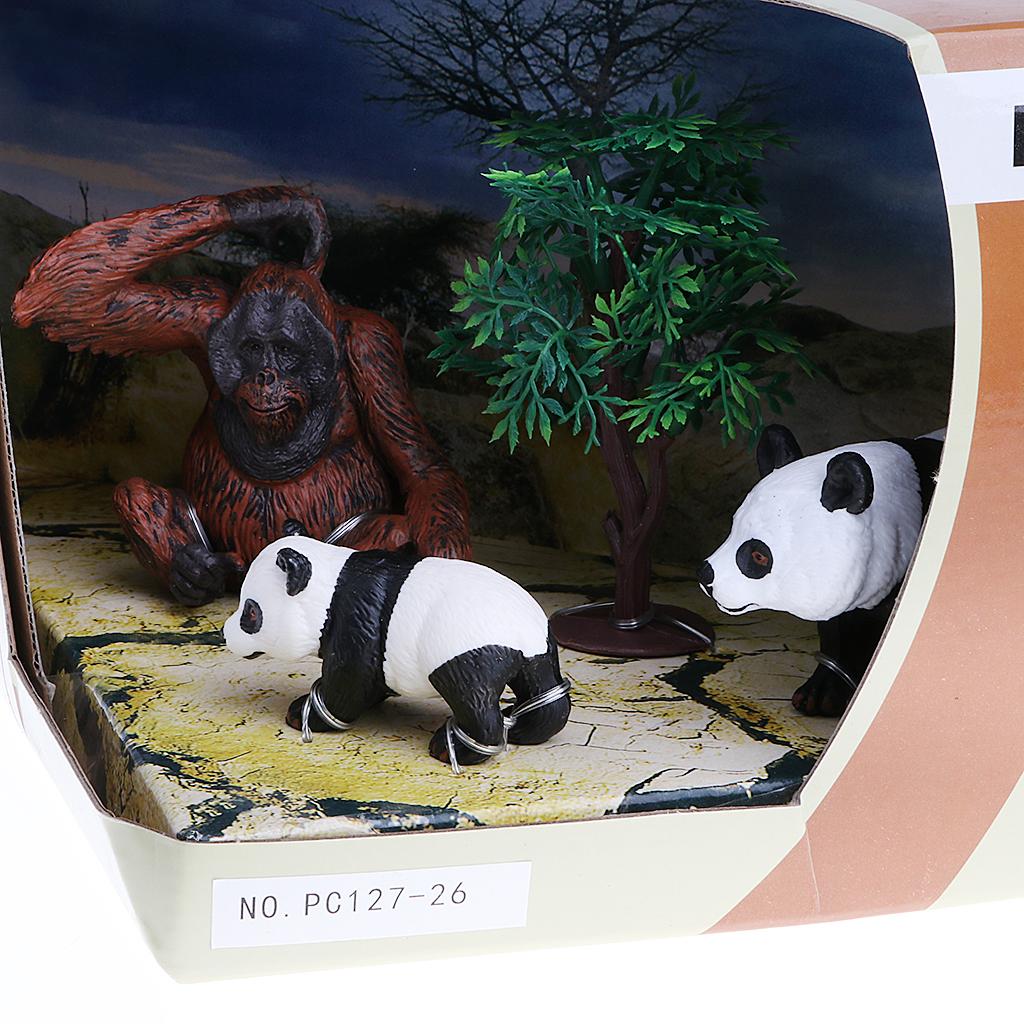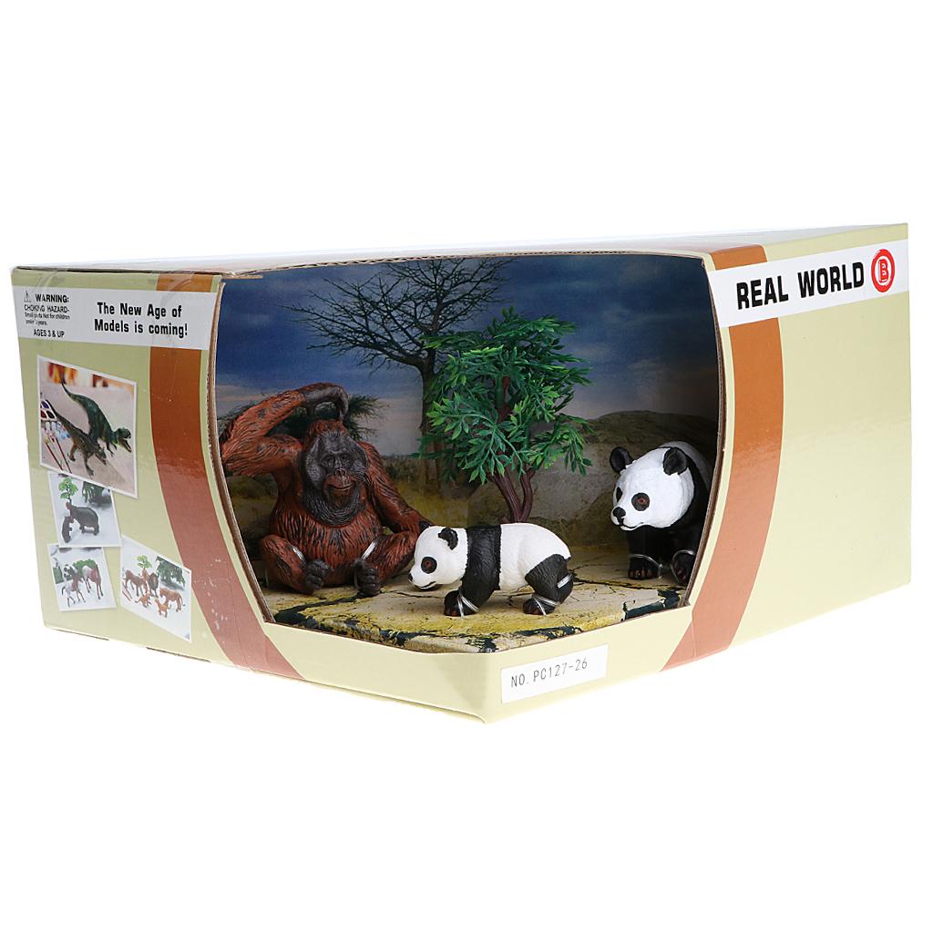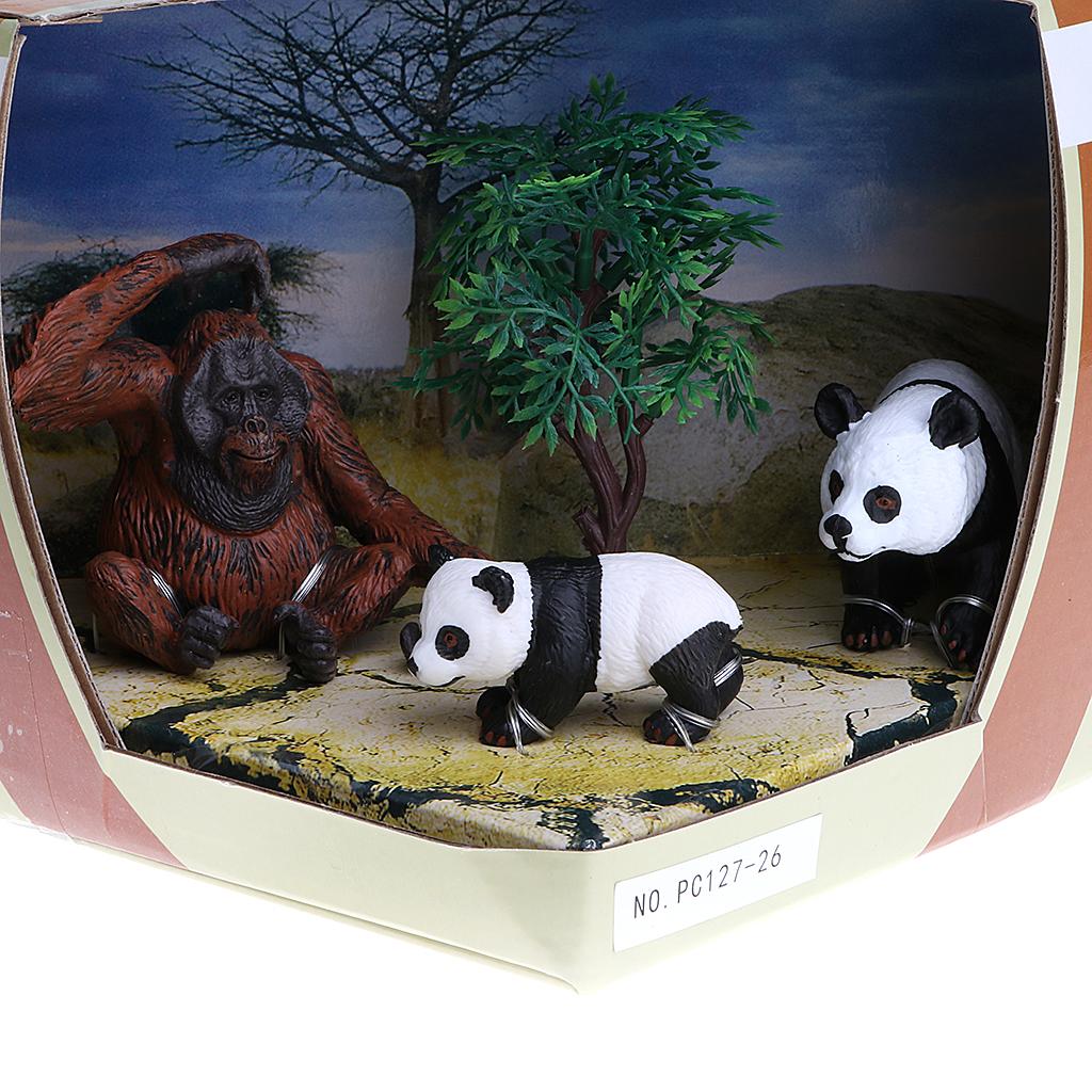 Box of 3 pieces pandas & chimpanzee family figures model set for showcase display