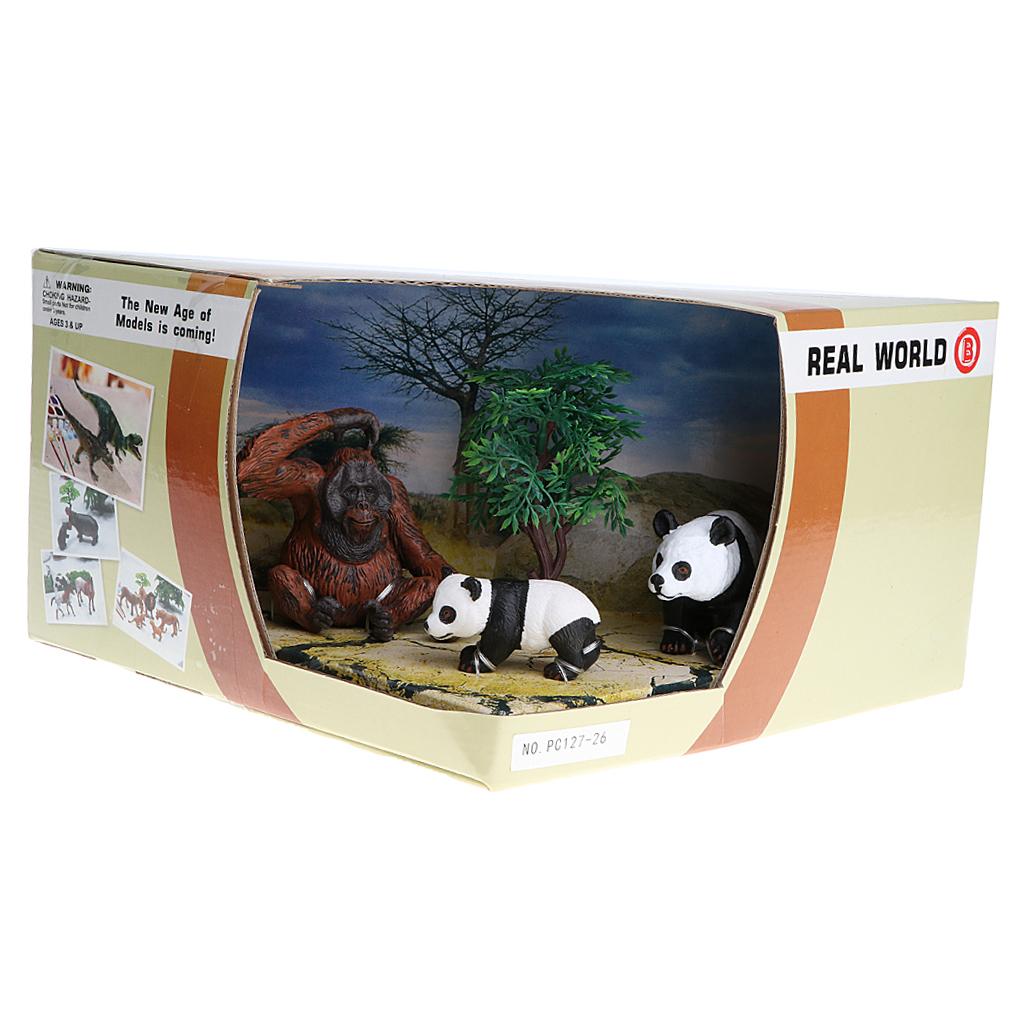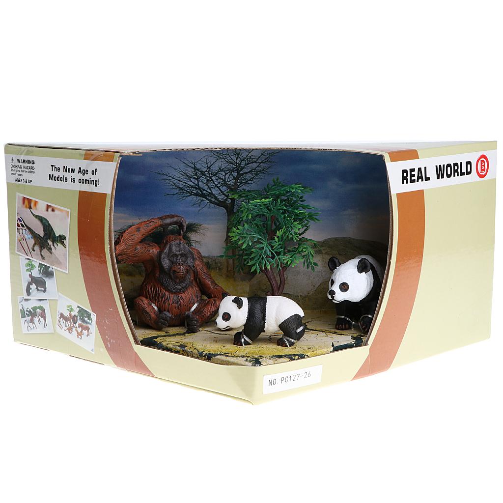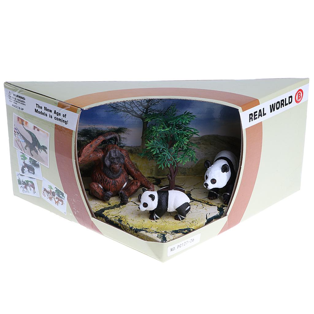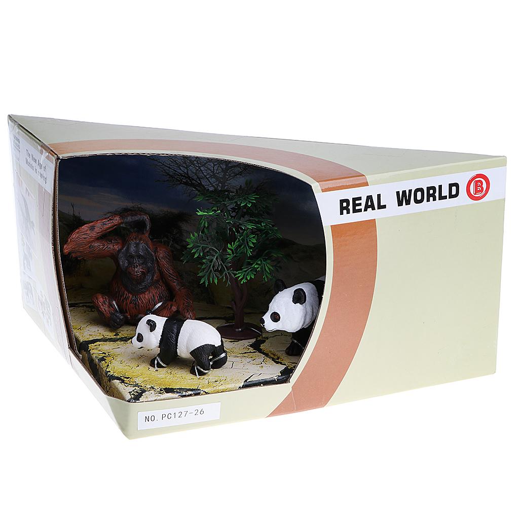 Box of 3 pieces pandas & chimpanzee family figures model set for showcase display