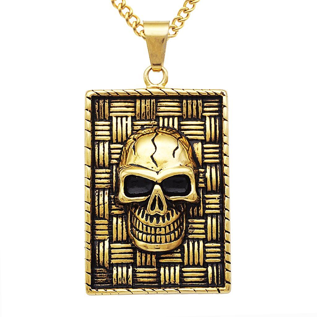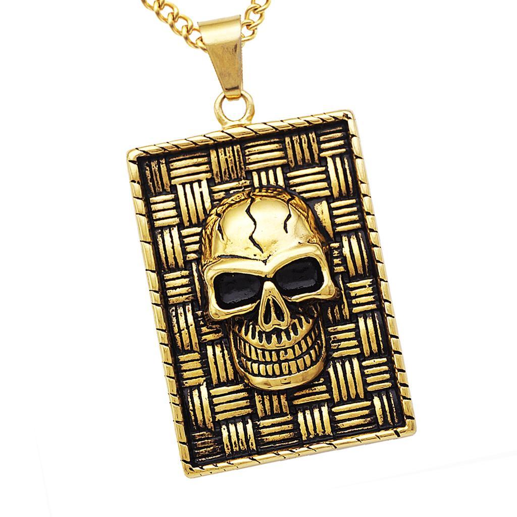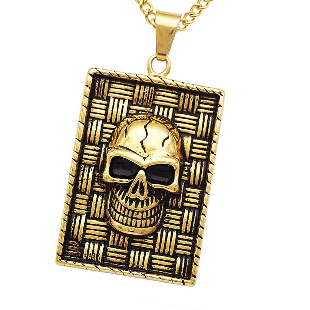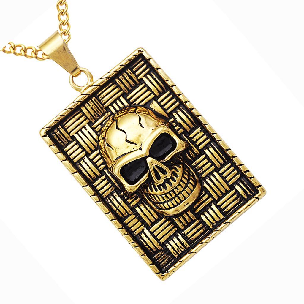 Rock Punk Men's Stainless Steel Skull Head Dog Tag Pendant Necklace Gold
