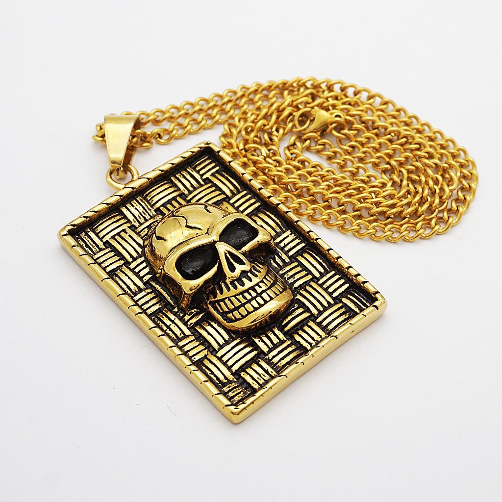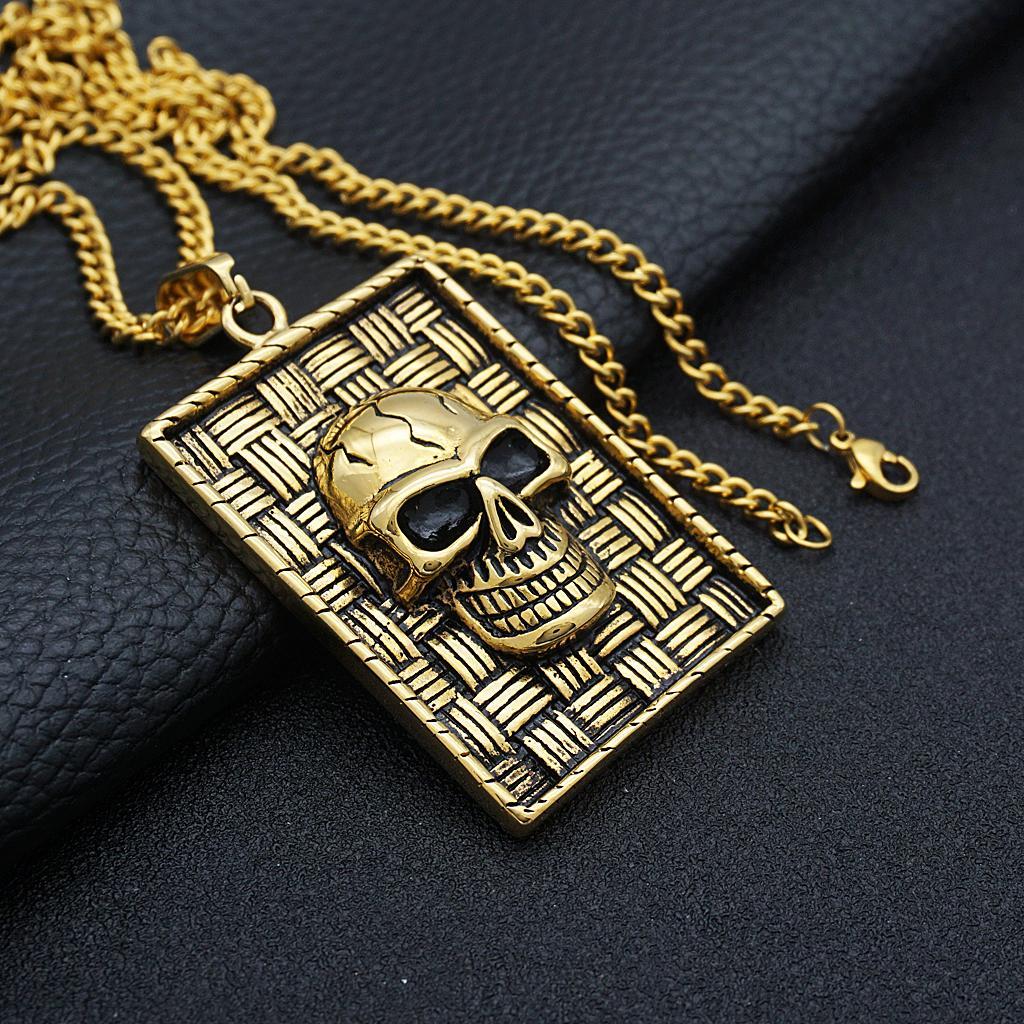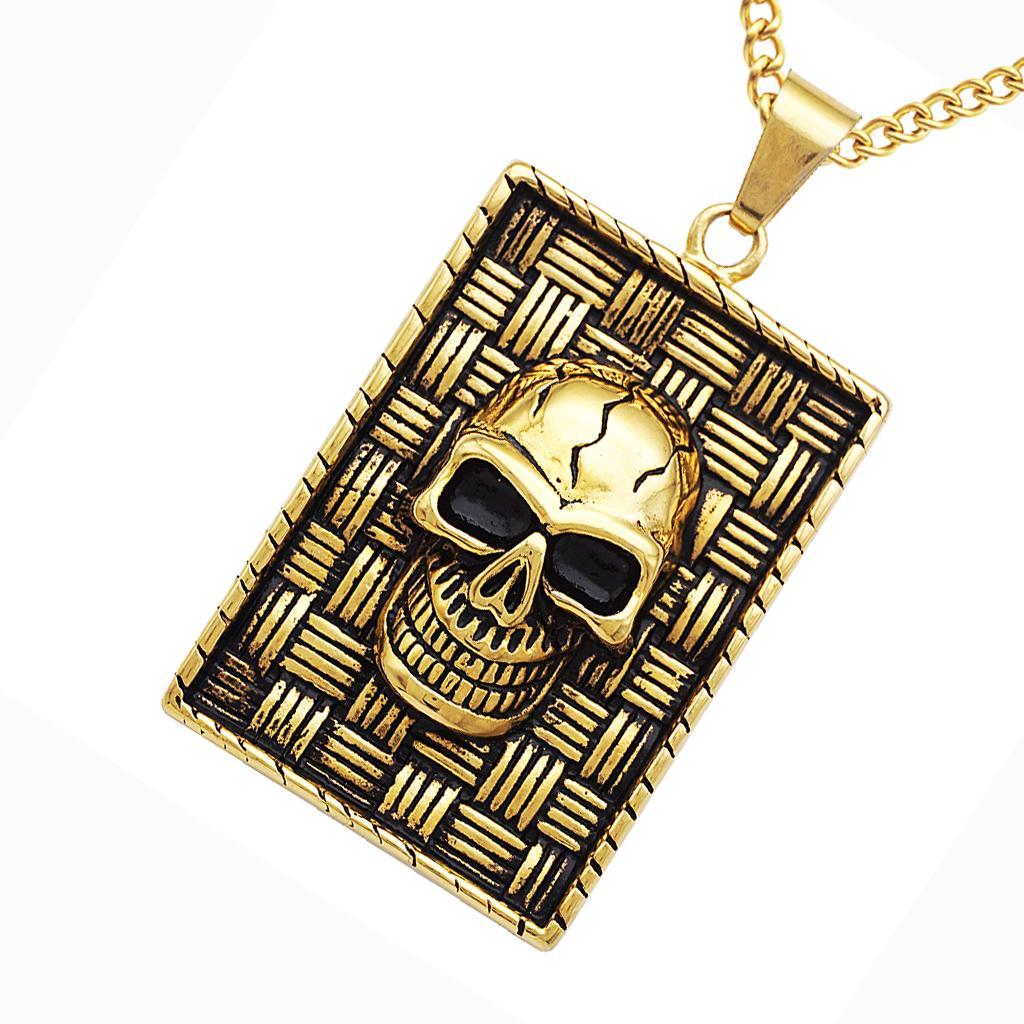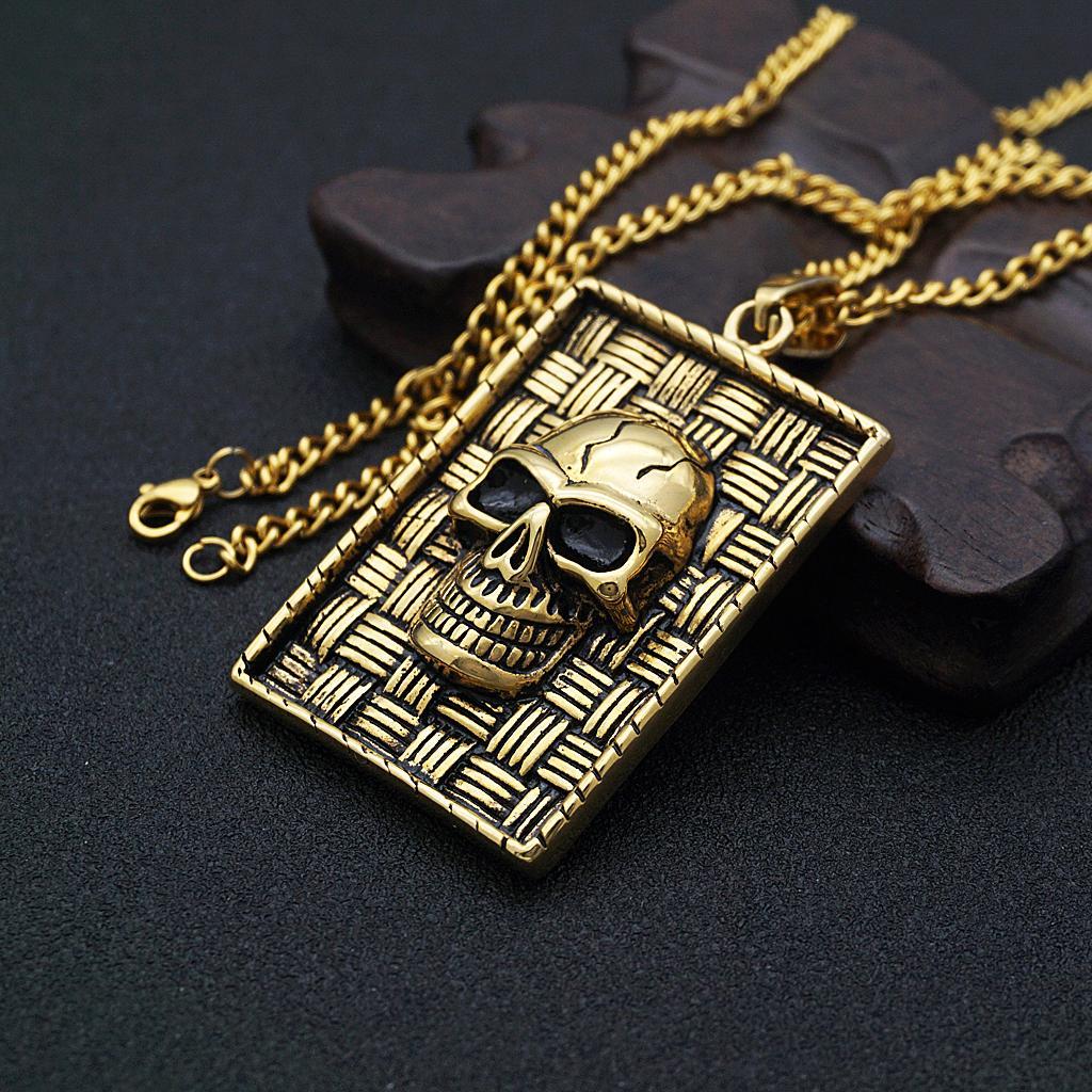 Rock Punk Men's Stainless Steel Skull Head Dog Tag Pendant Necklace Gold