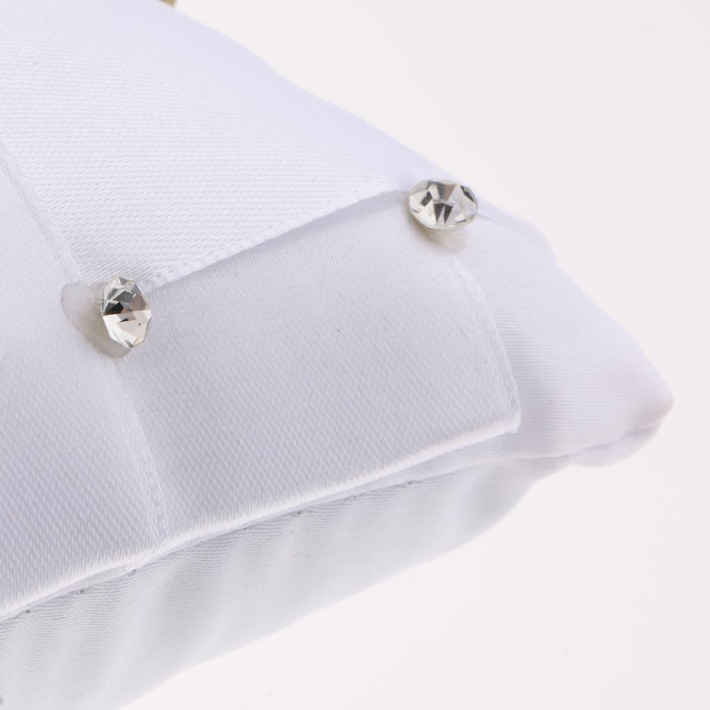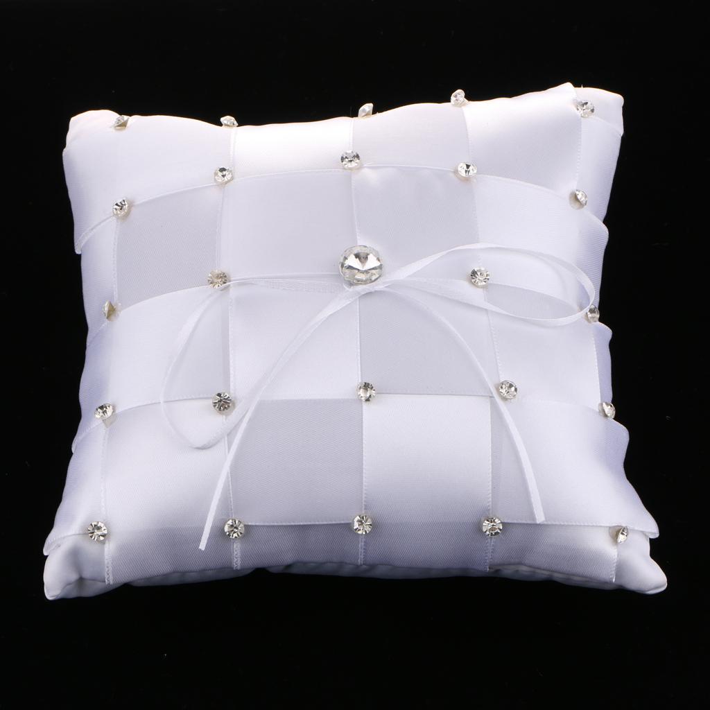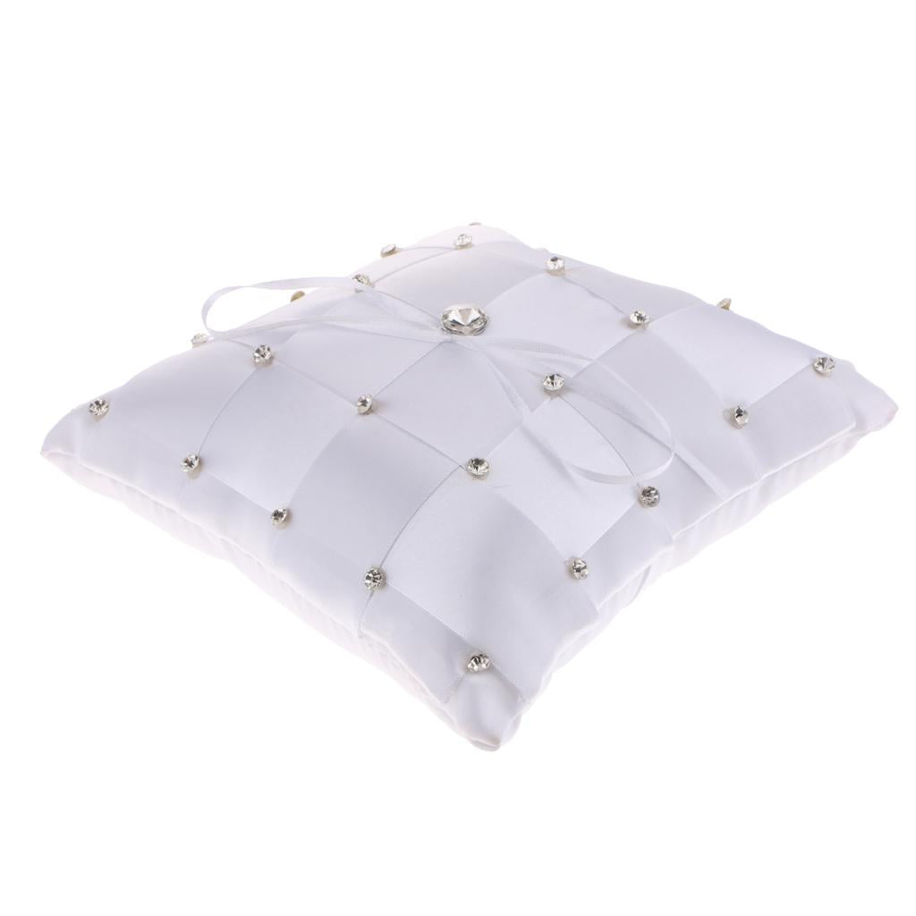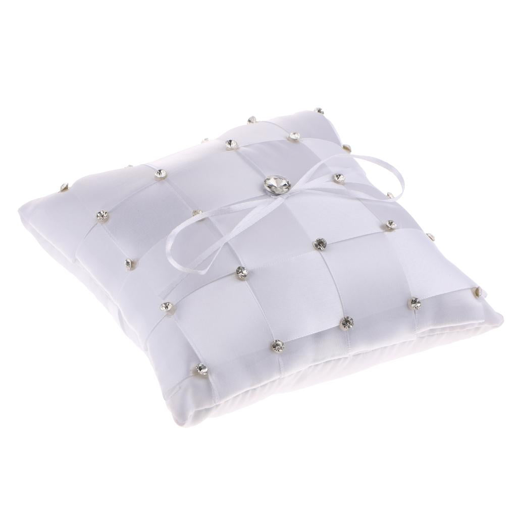 Romantic Grid Wedding Ring Pillow Satin Rhinestone Ring Cushion Bearer White 20x20cm