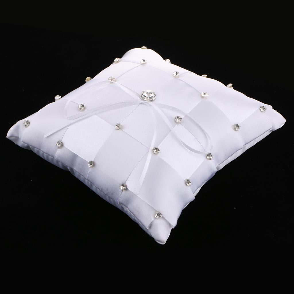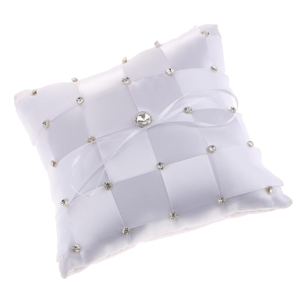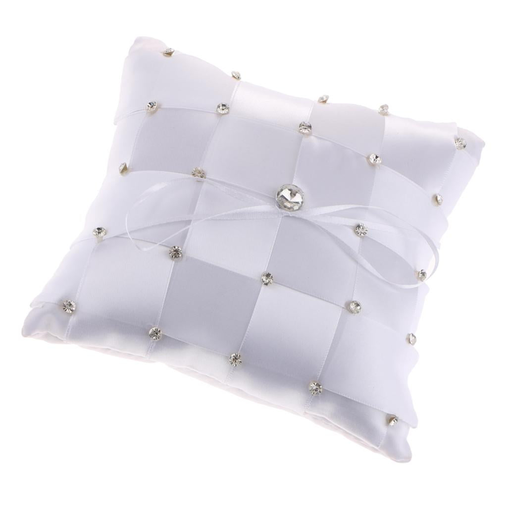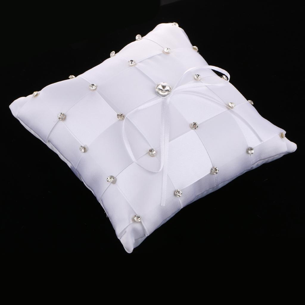 Romantic Grid Wedding Ring Pillow Satin Rhinestone Ring Cushion Bearer White 20x20cm
