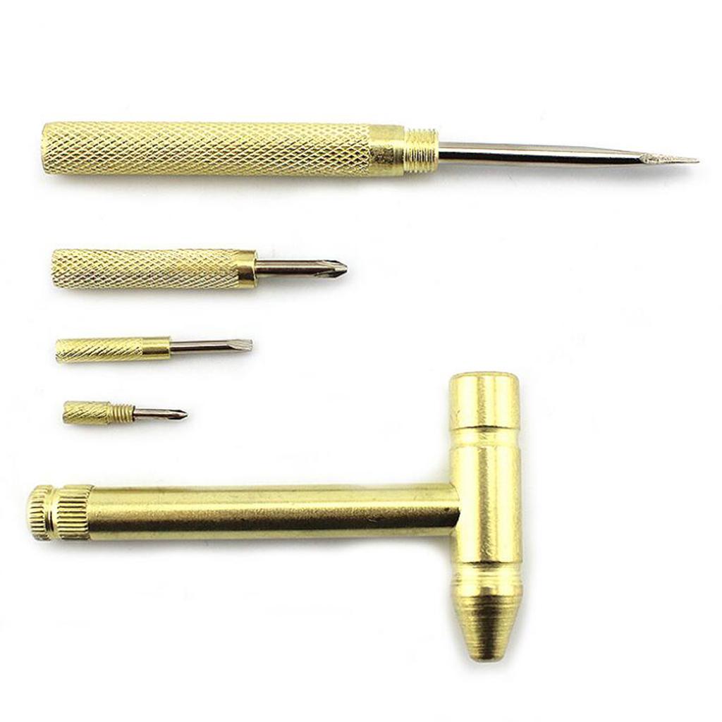 Portable small size copper hammer —— multi-function type. It Contains 4 screwdrivers inside the handle (2 pieces small phillips screwdriver, 2 pieces slotted screwdriver)